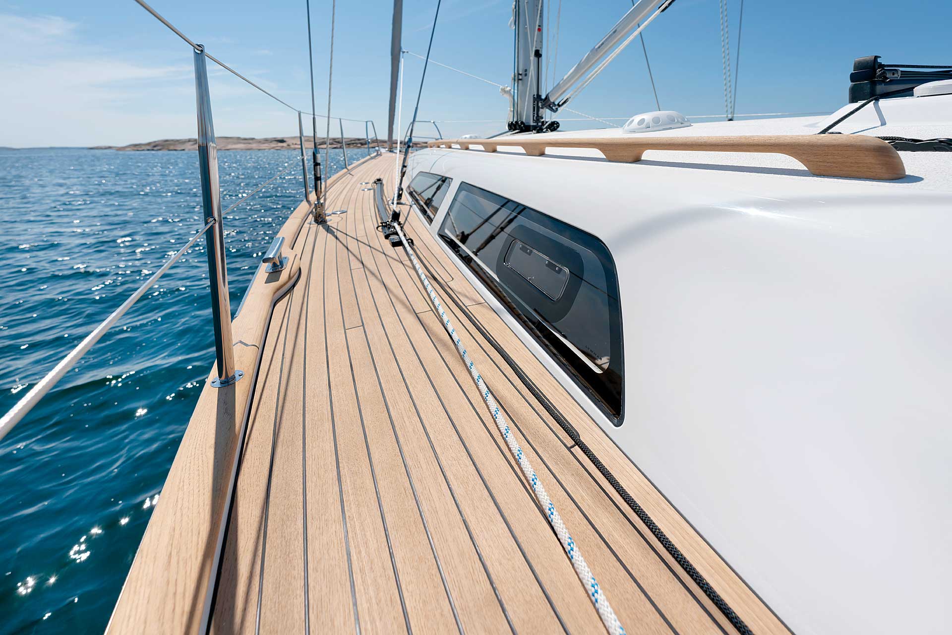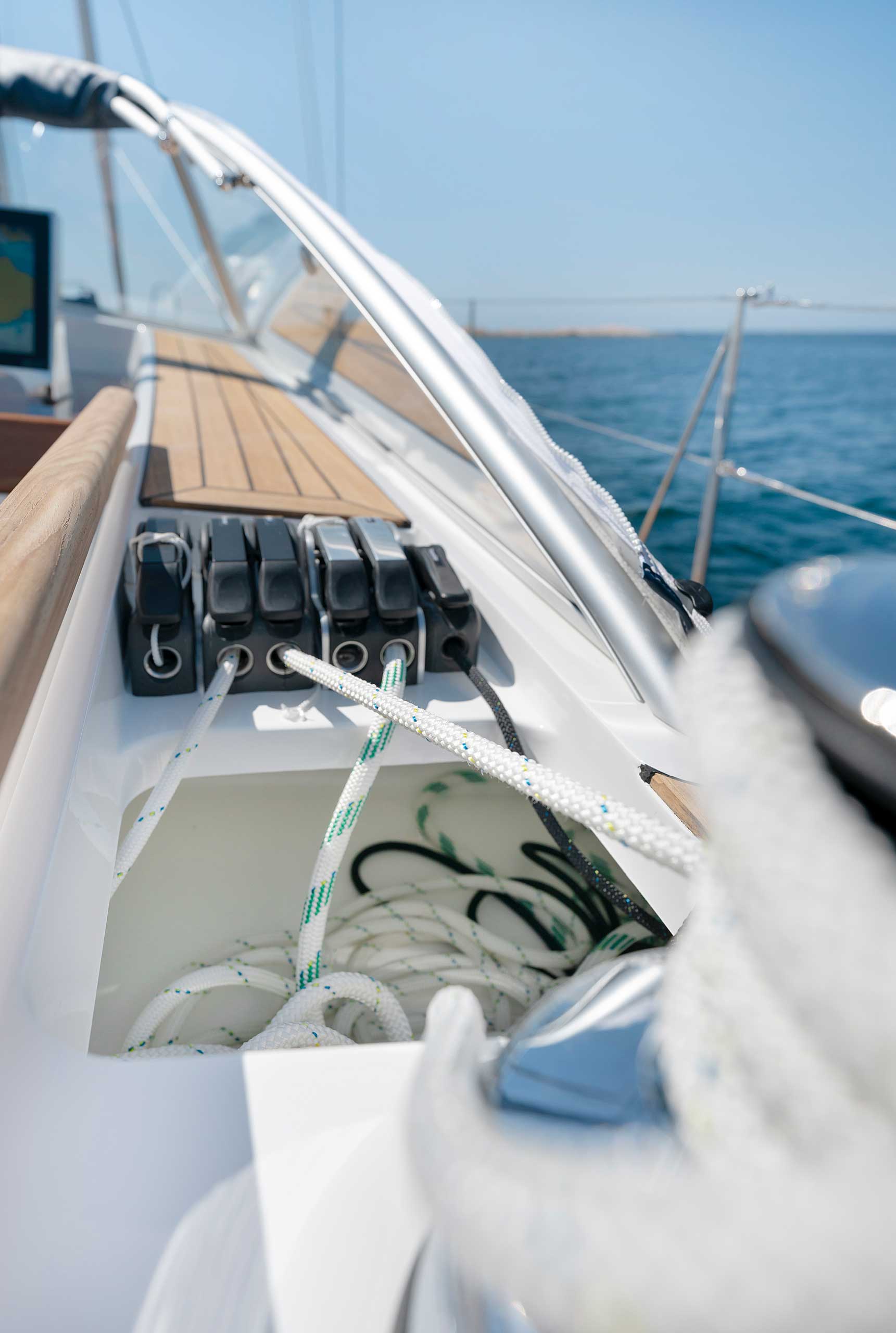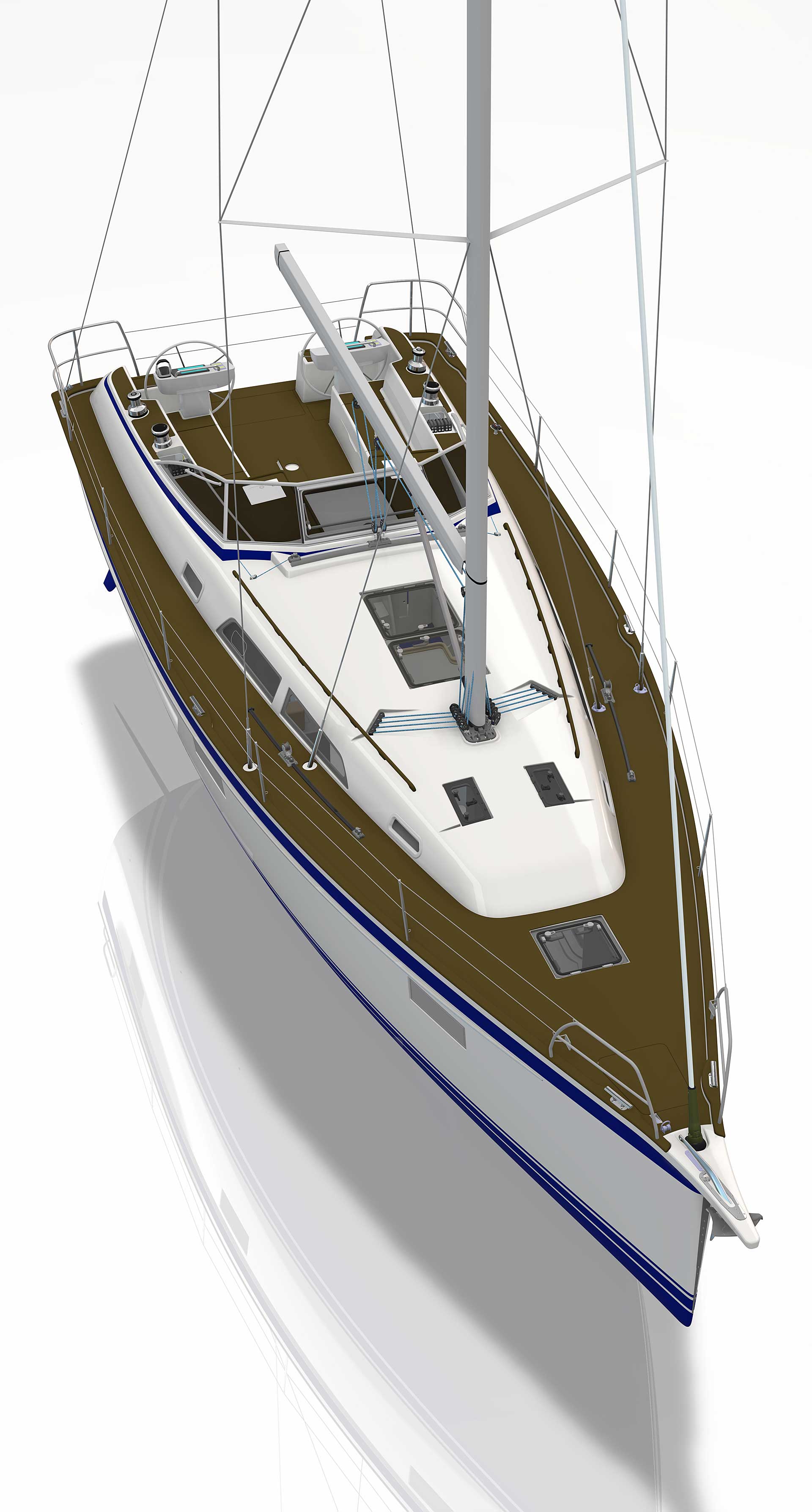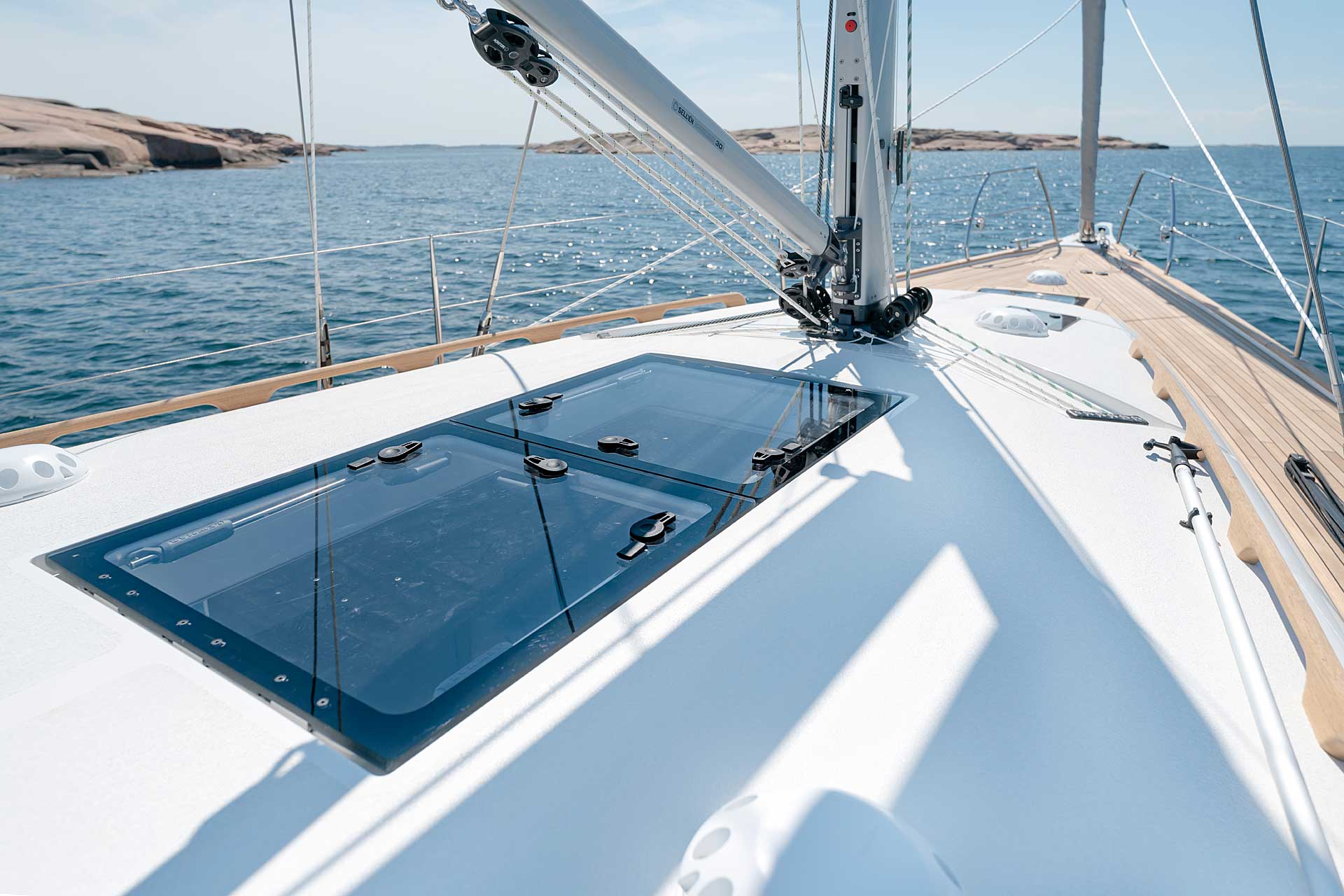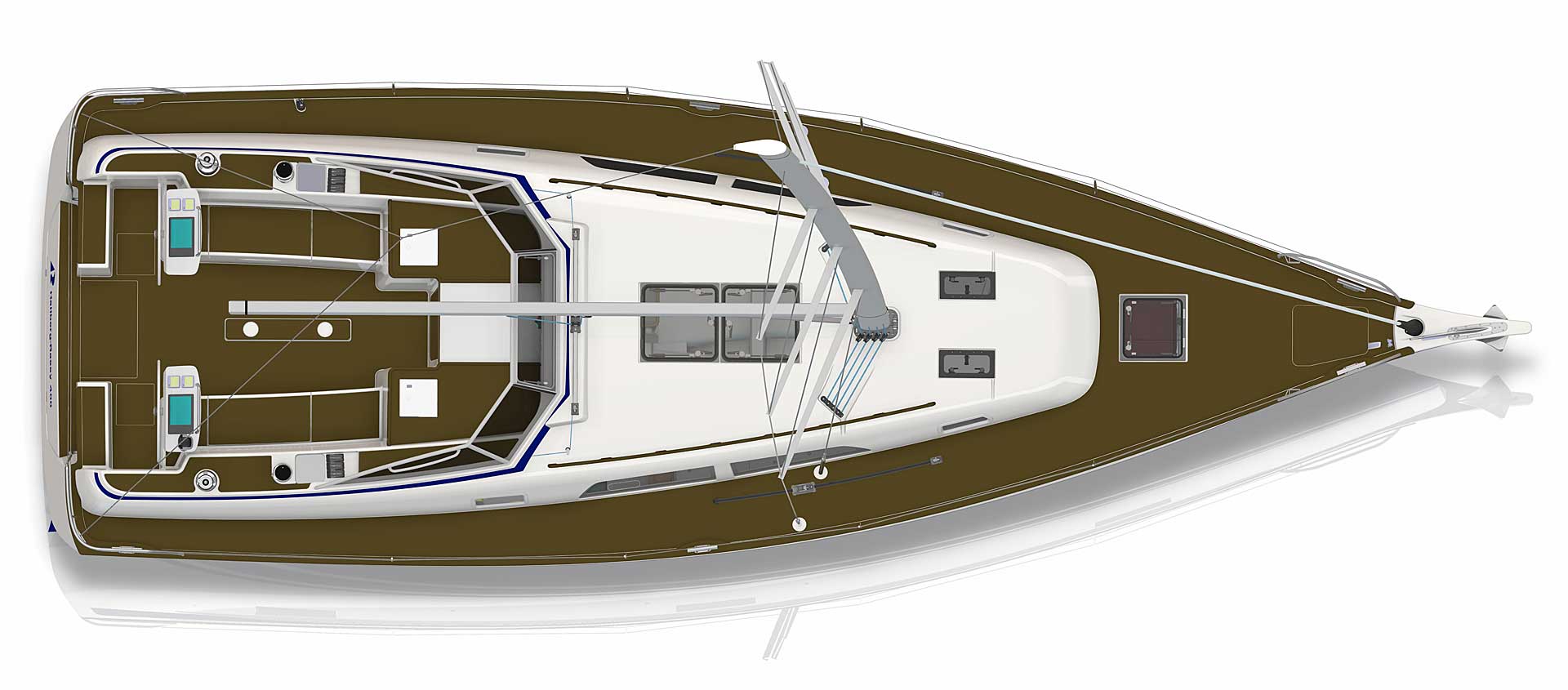 The rig is modern and easy to handle. The headsail is only slightly overlapping and easy to tack and there is a self tacking option too. The bowsprit is elegantly integrated with the hull and deck as standard, not an afterthought. The bowsprit is an excellent tack point for a gennaker, a mount for a bow ladder with platform and stowage for an Ultra bow anchor.