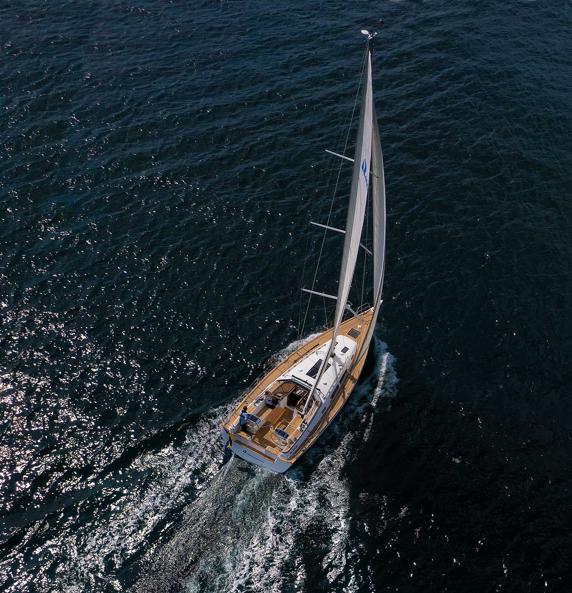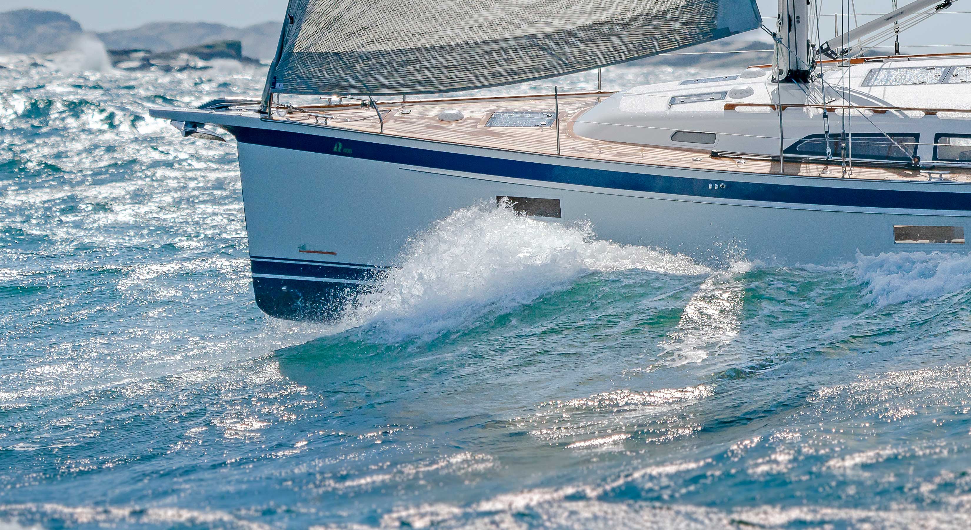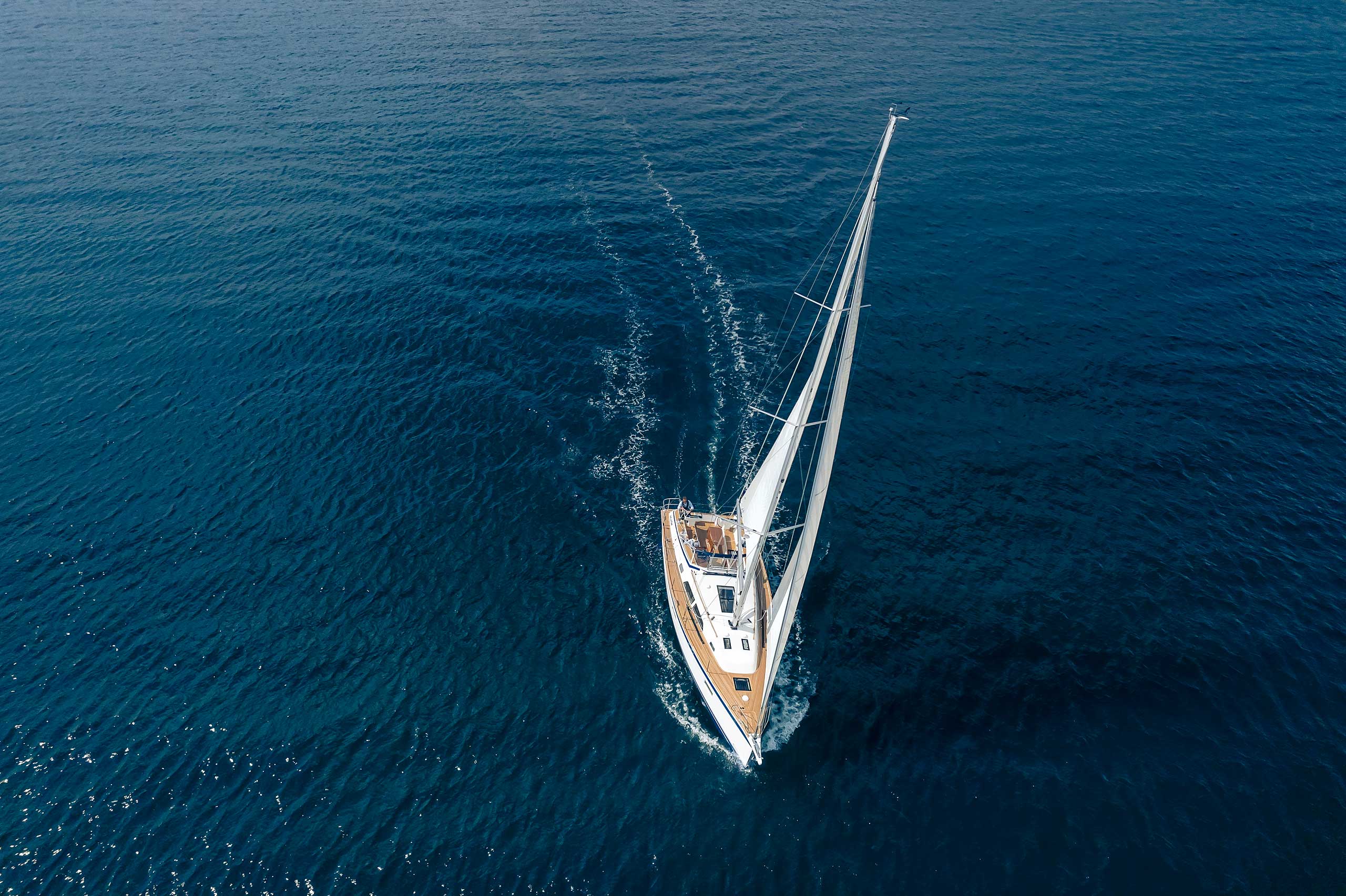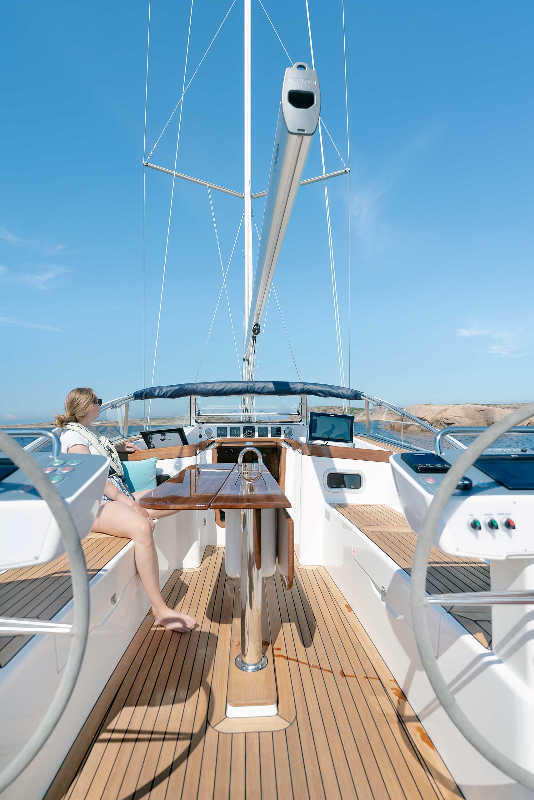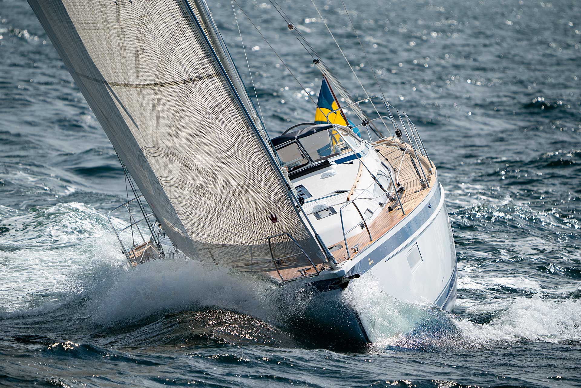 The rig is modern and easy to handle. The headsail is only slightly overlapping and easy to tack and there is a self tacking option too. The bowsprit is elegantly integrated with the hull and deck as standard, not an afterthought. The bowsprit is an excellent tack point for a gennaker, a mount for a bow ladder with platform and stowage for an Ultra bow anchor.