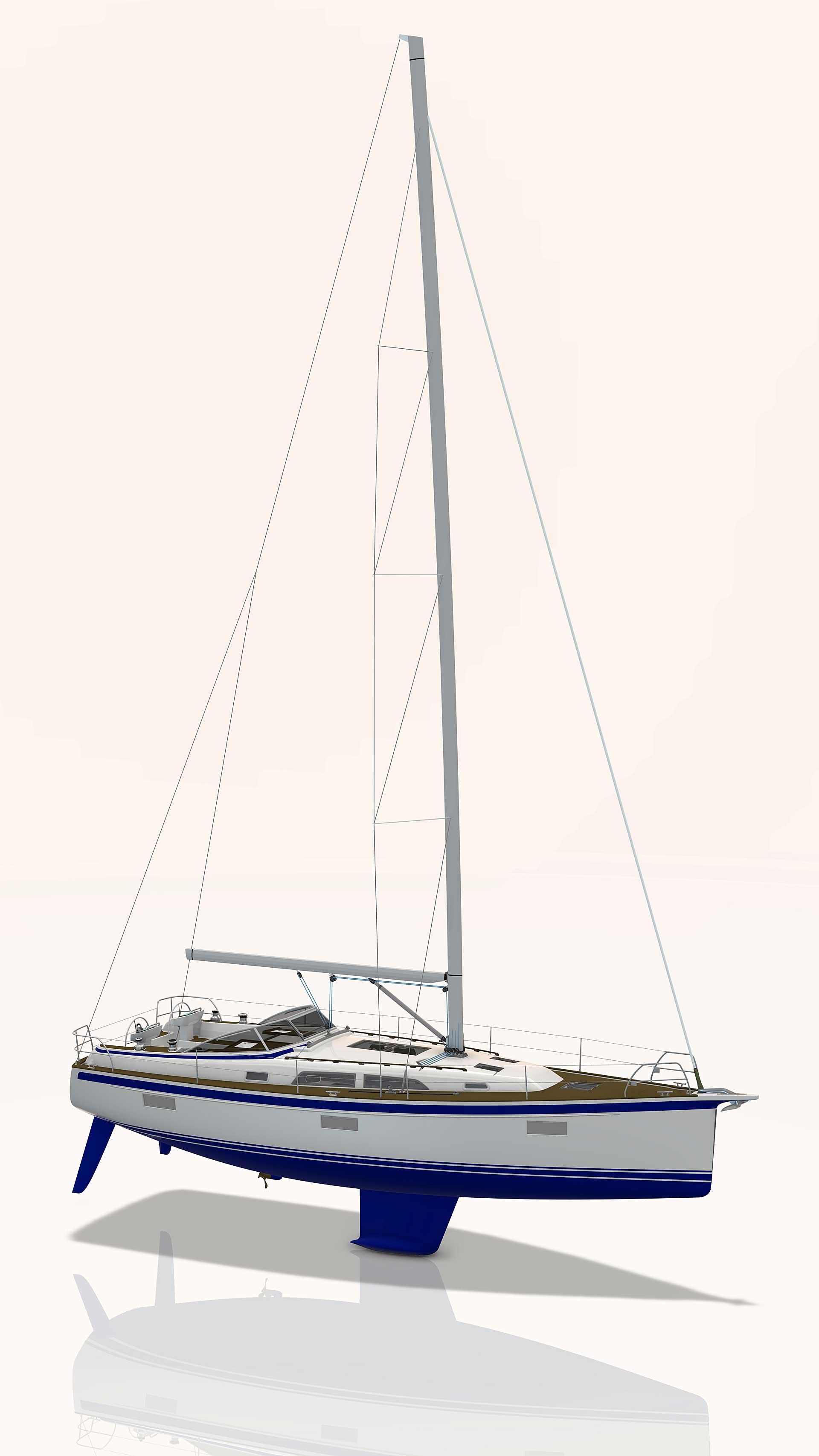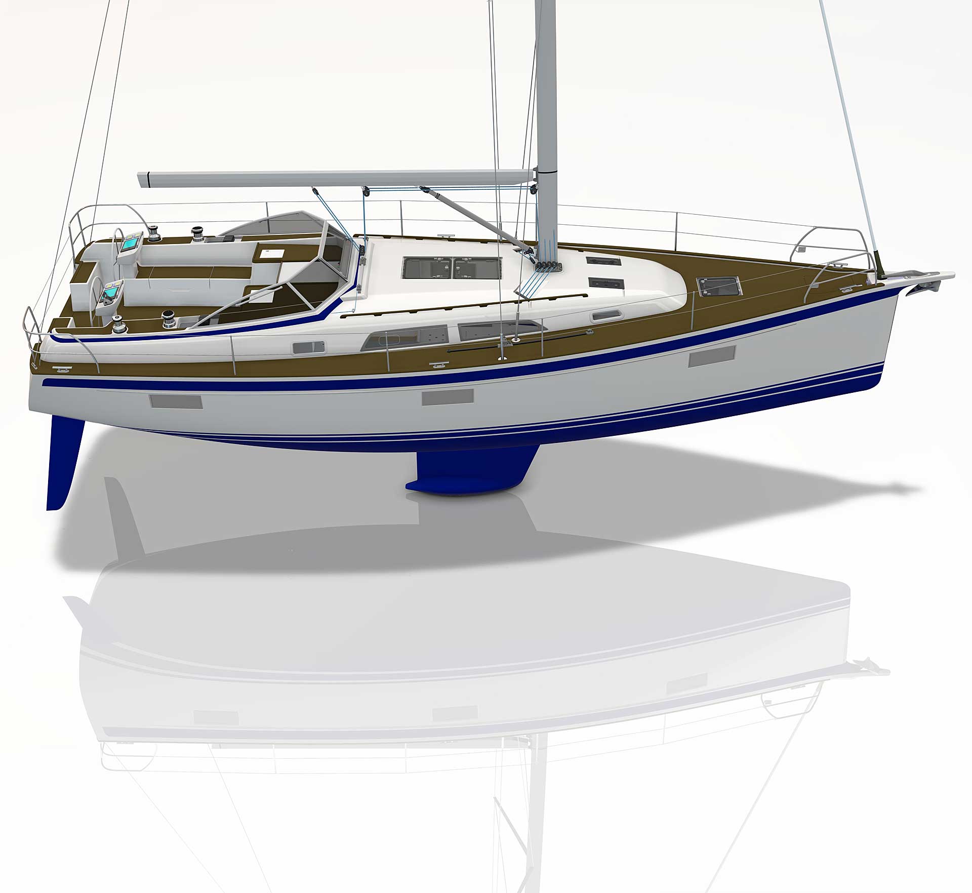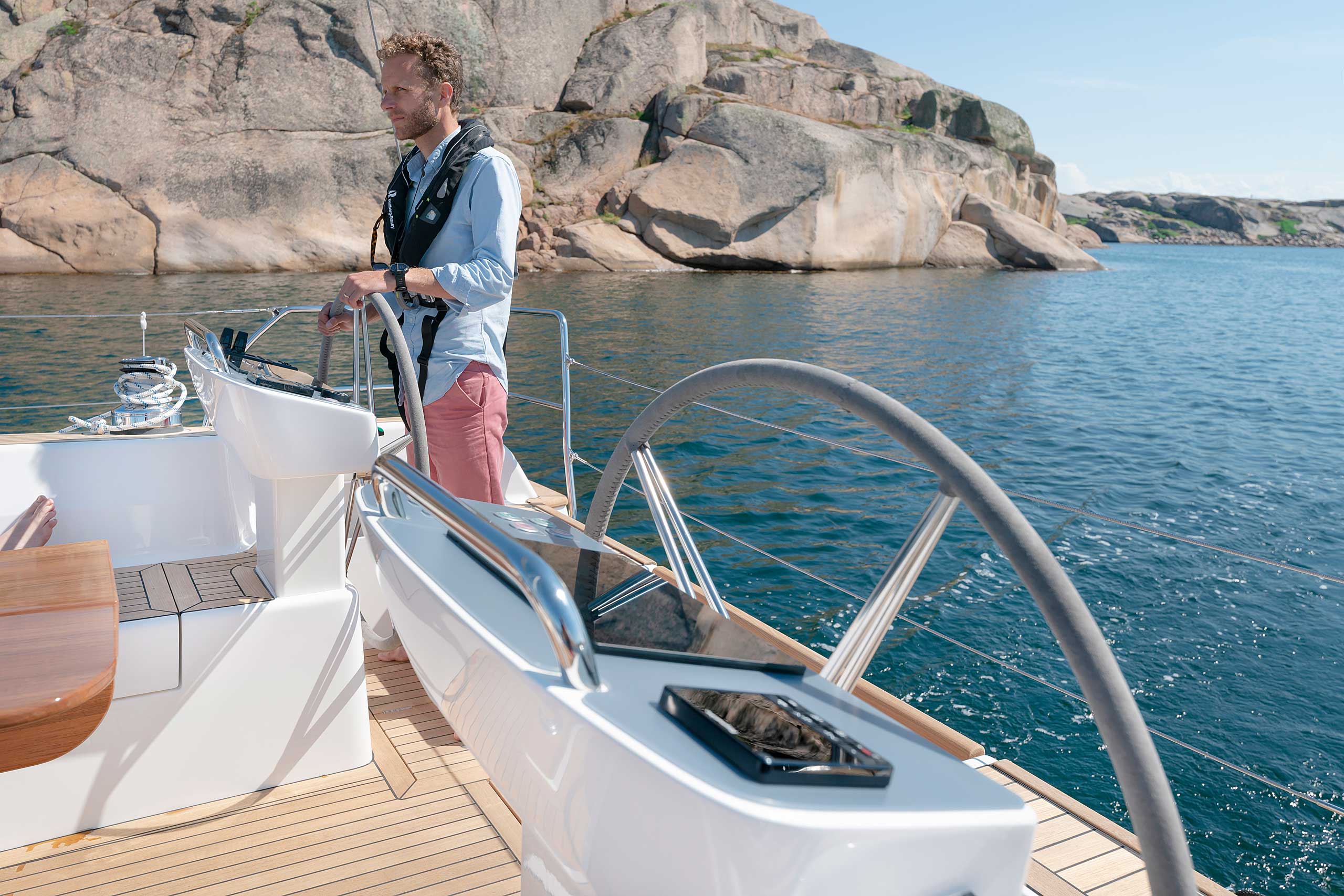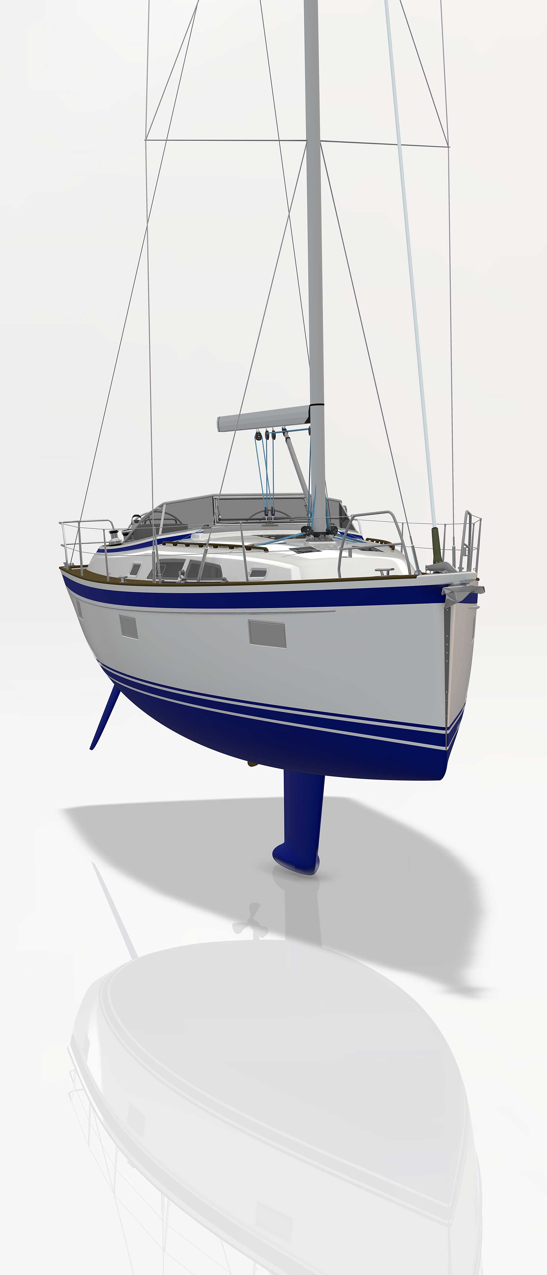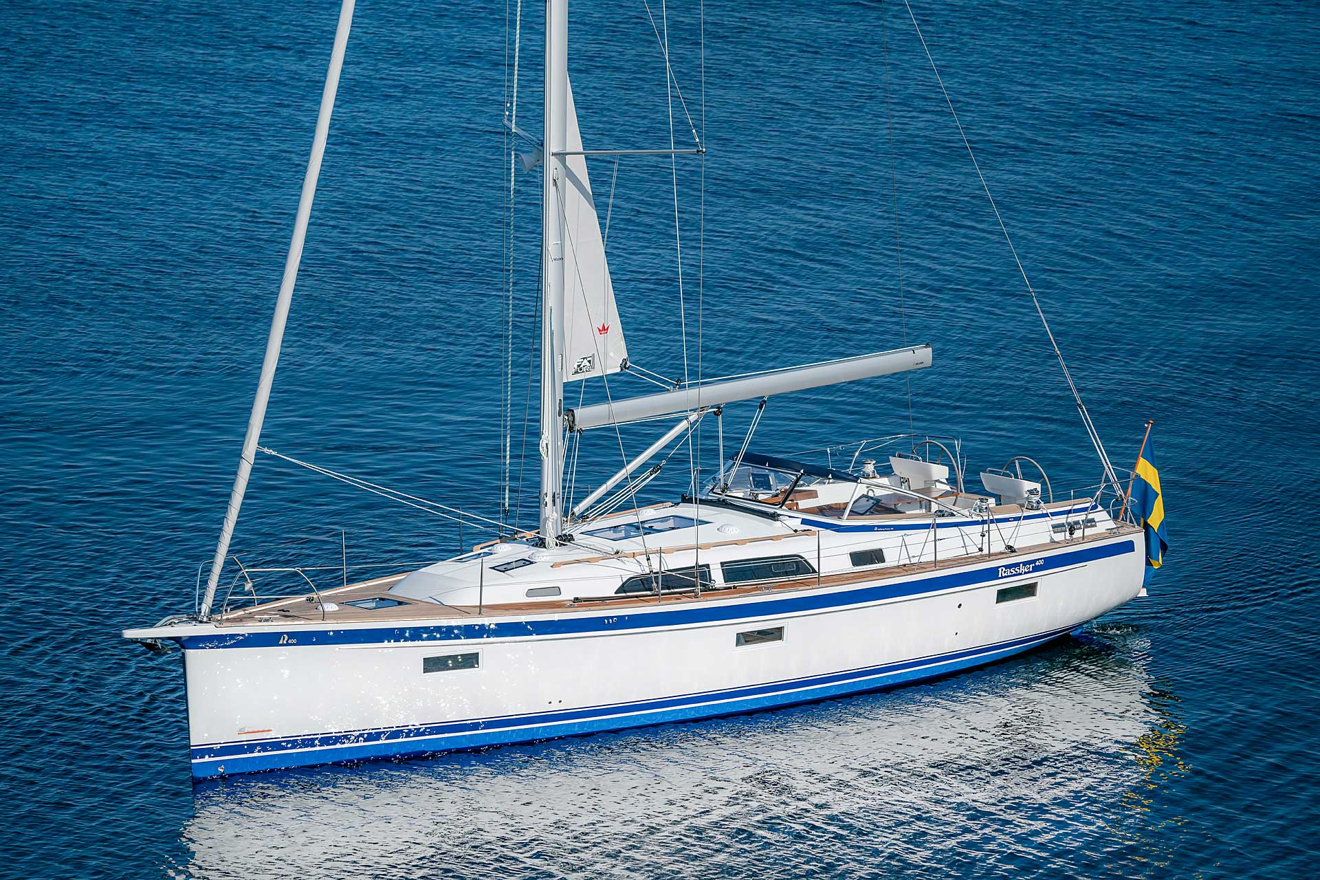 The rig is modern and easy to handle. The headsail is only slightly overlapping and easy to tack and there is a self tacking option too. The bowsprit is elegantly integrated with the hull and deck as standard, not an afterthought. The bowsprit is an excellent tack point for a gennaker, a mount for a bow ladder with platform and stowage for an Ultra bow anchor.