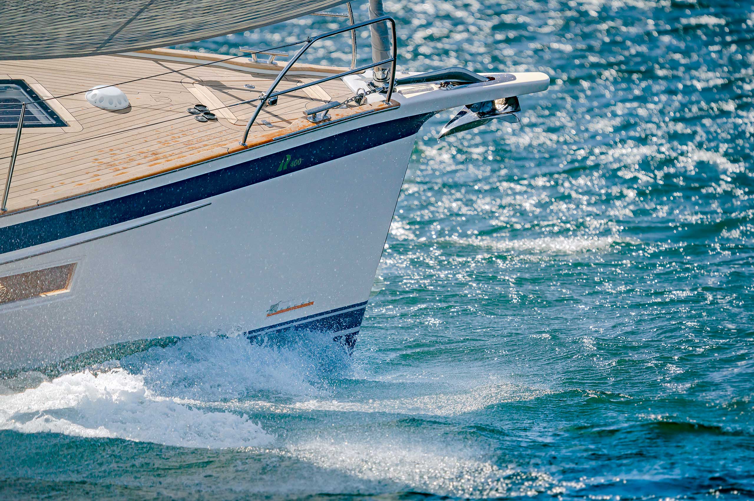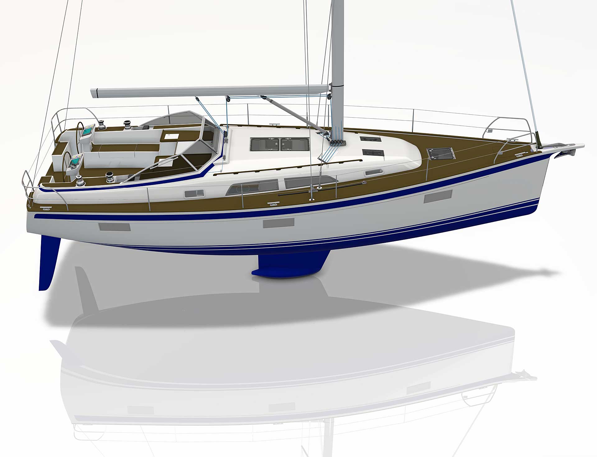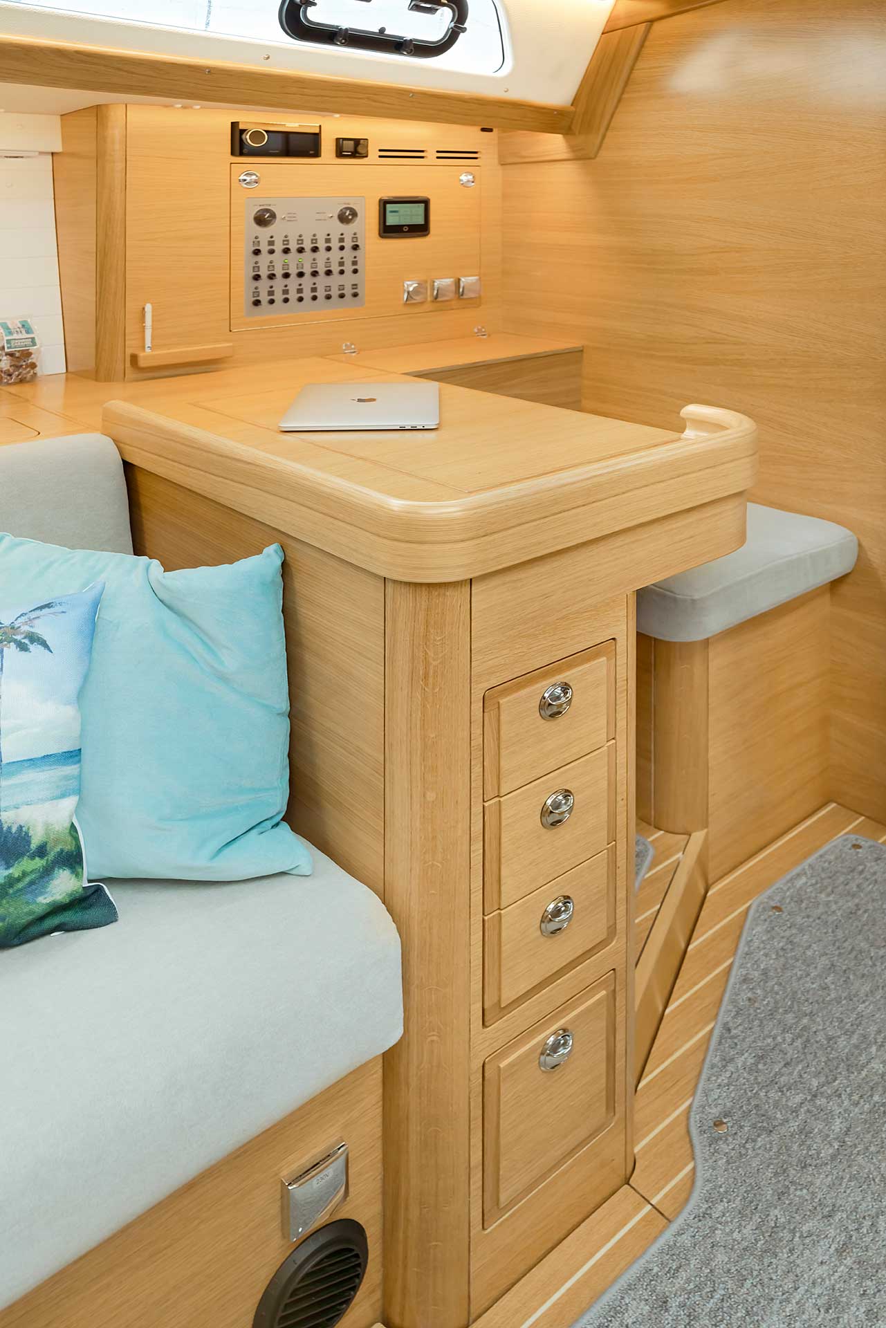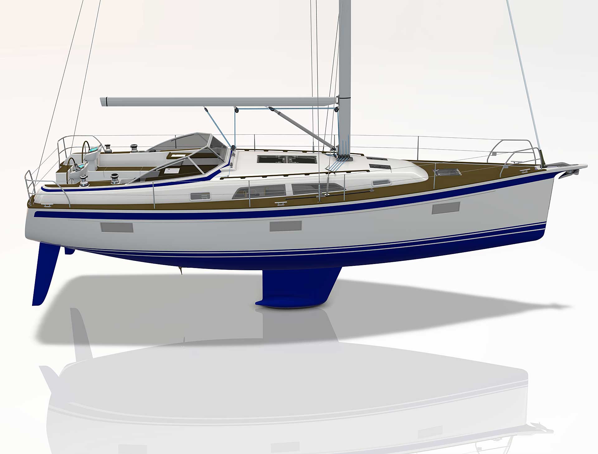 The rig is modern and easy to handle. The headsail is only slightly overlapping and easy to tack and there is a self tacking option too. The bowsprit is elegantly integrated with the hull and deck as standard, not an afterthought. The bowsprit is an excellent tack point for a gennaker, a mount for a bow ladder with platform and stowage for an Ultra bow anchor.