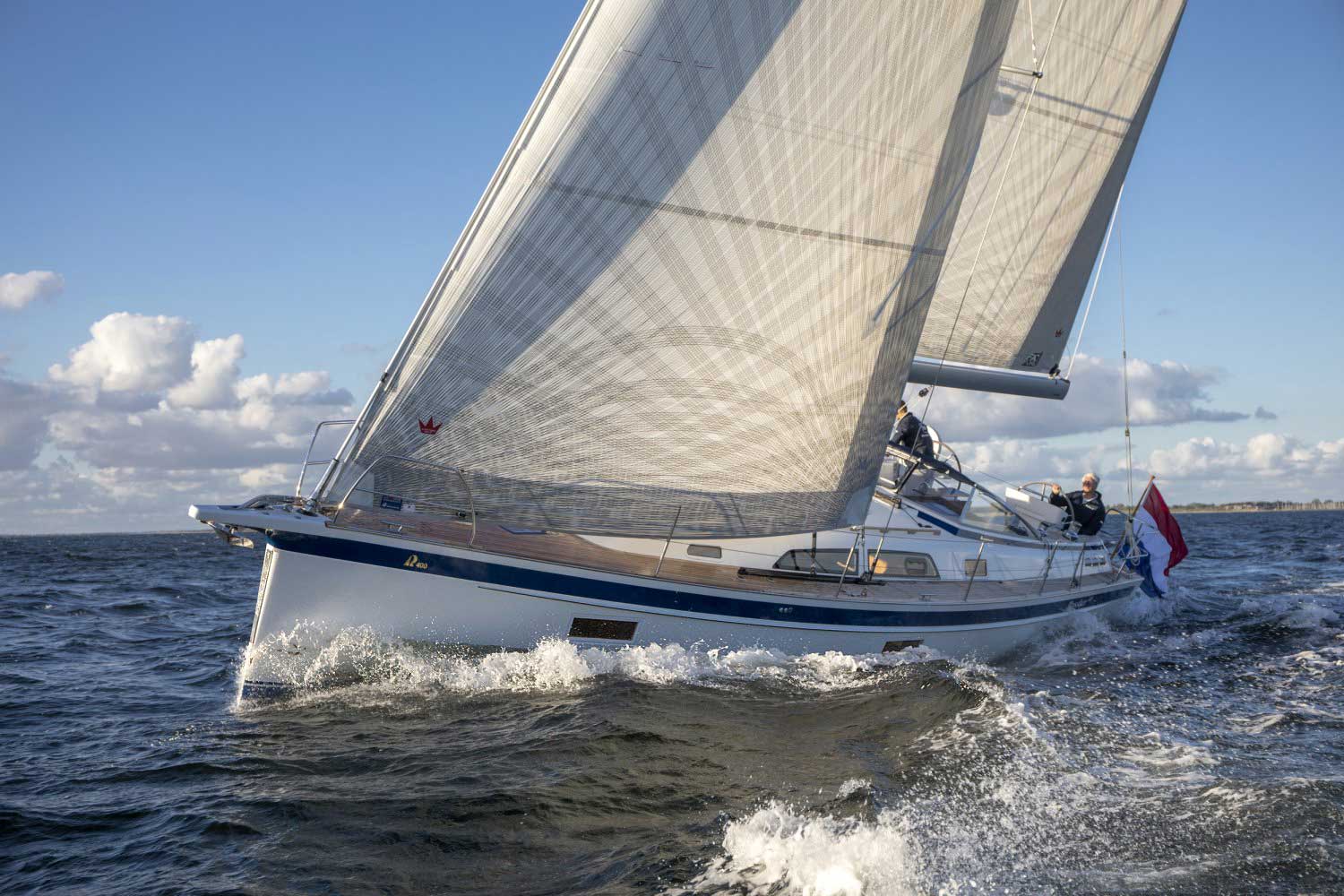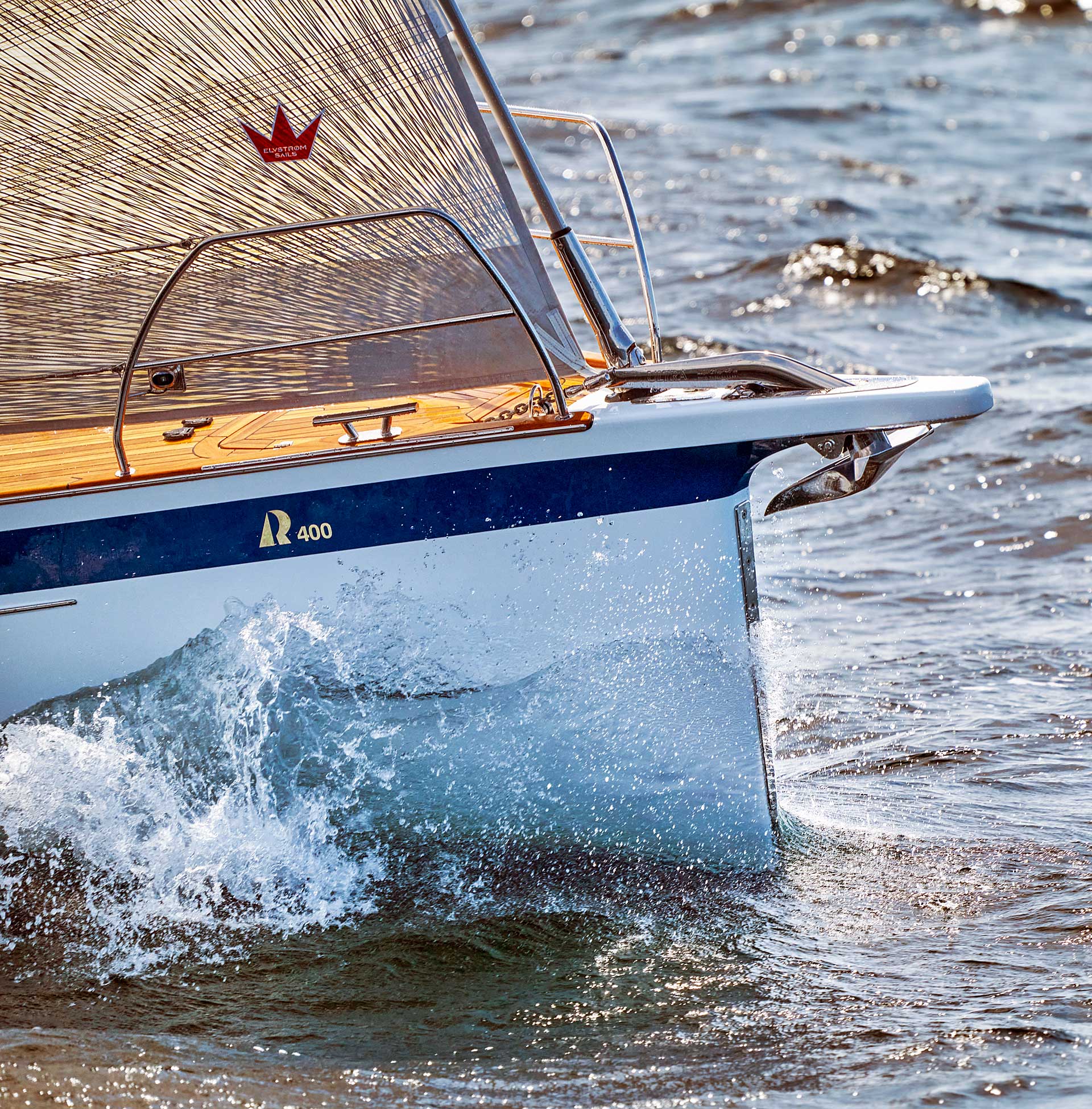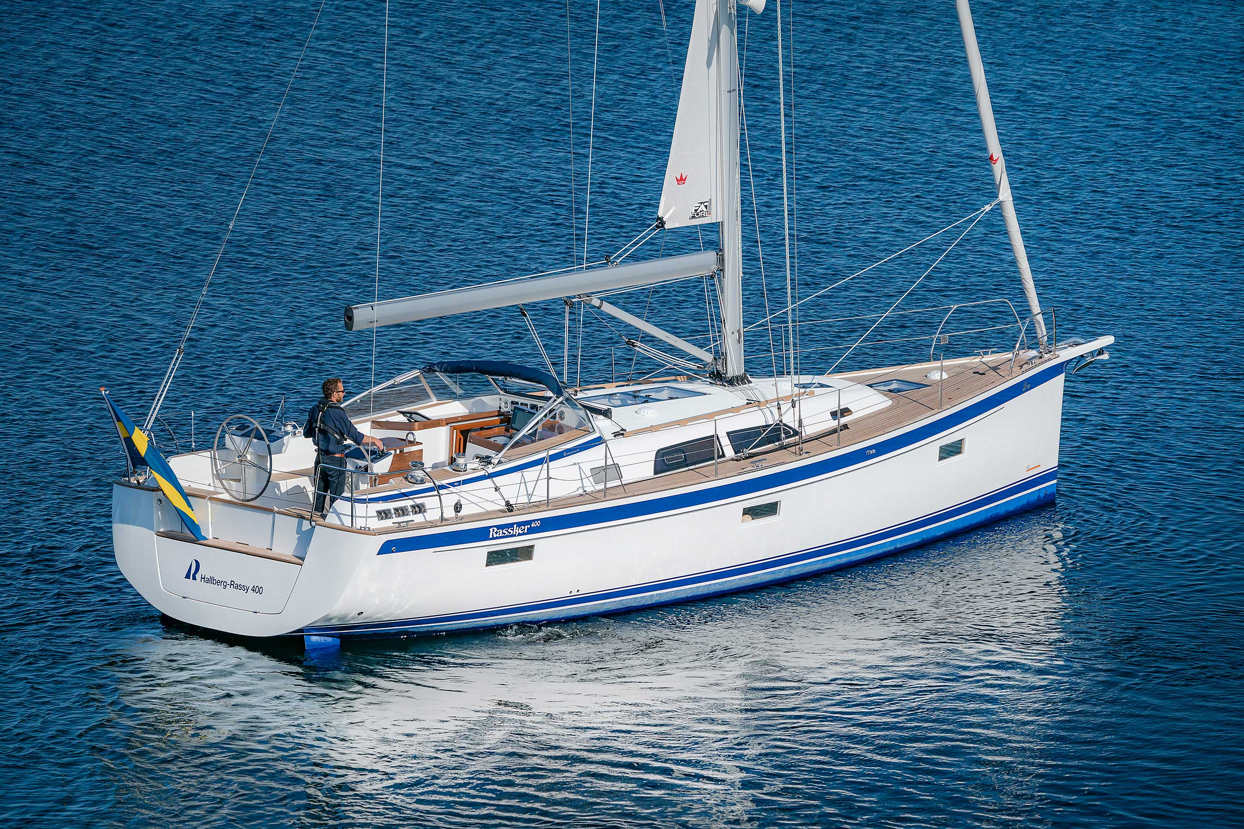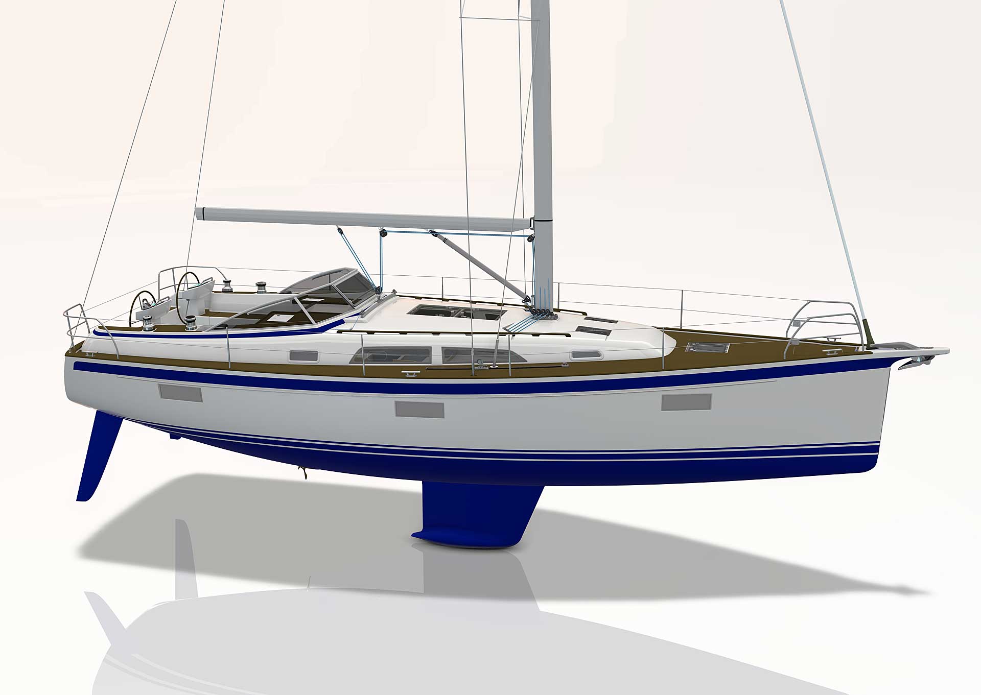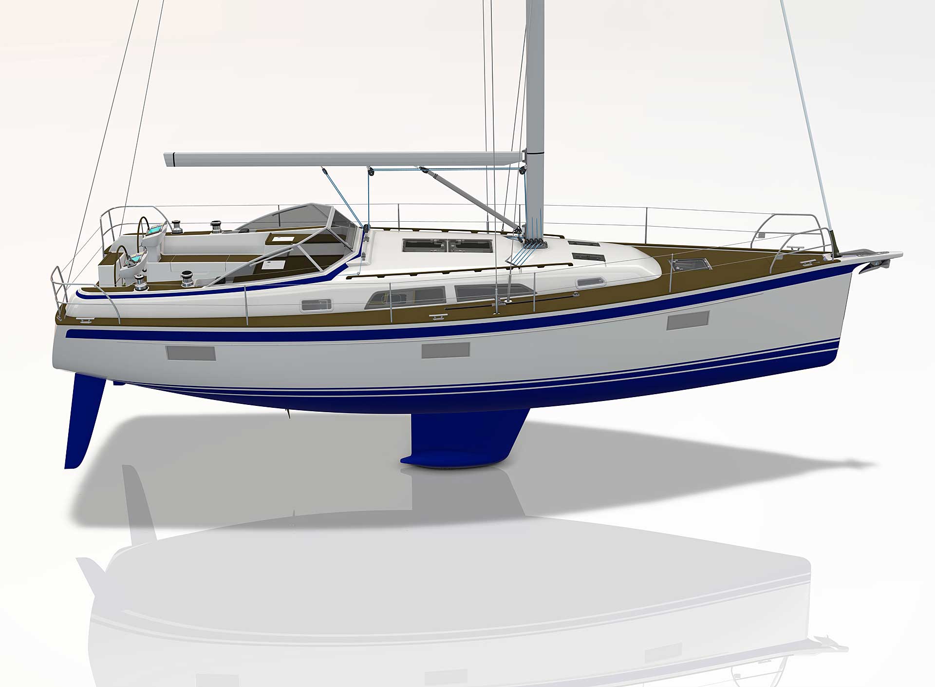 The rig is modern and easy to handle. The headsail is only slightly overlapping and easy to tack and there is a self tacking option too. The bowsprit is elegantly integrated with the hull and deck as standard, not an afterthought. The bowsprit is an excellent tack point for a gennaker, a mount for a bow ladder with platform and stowage for an Ultra bow anchor.