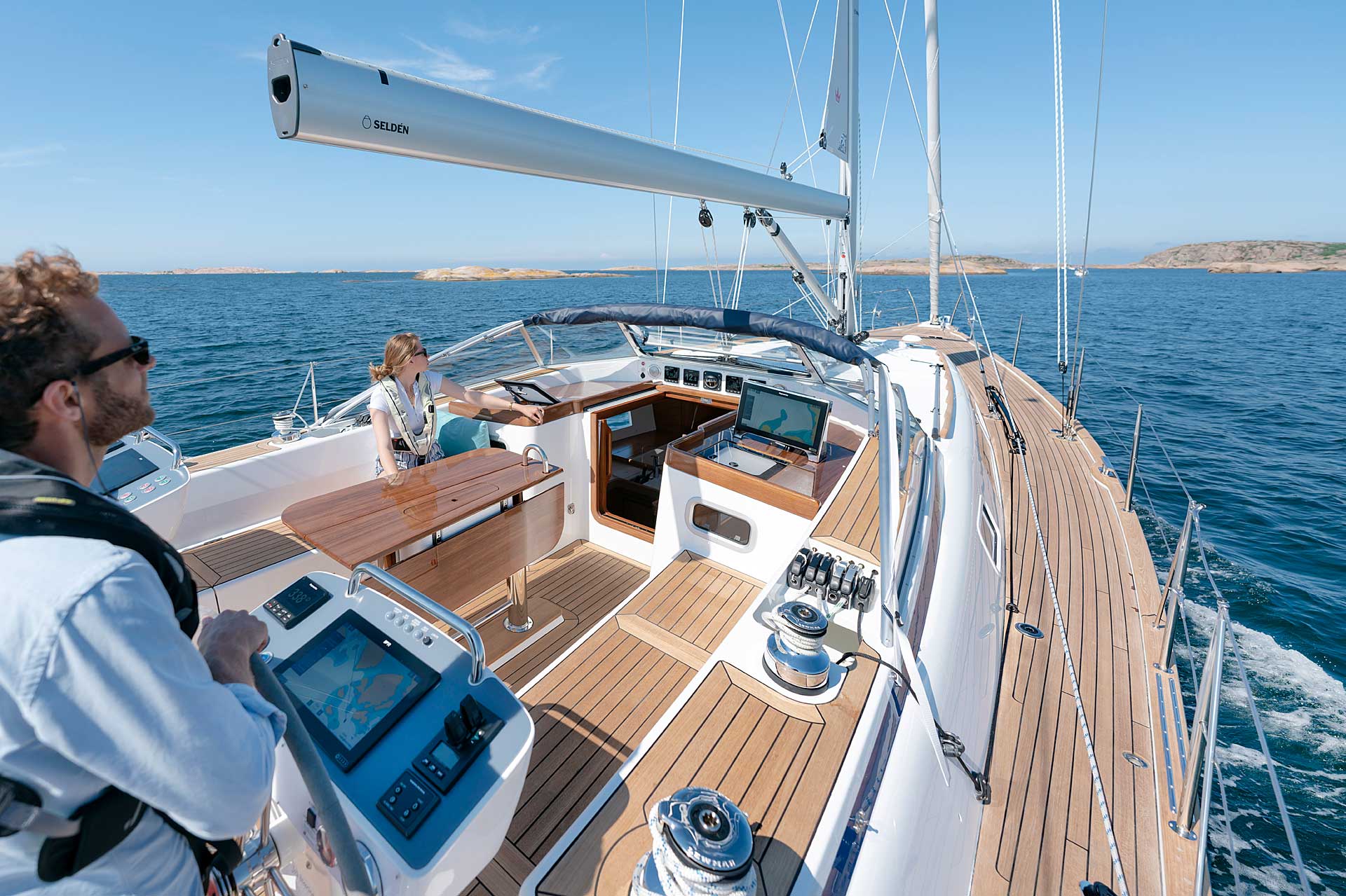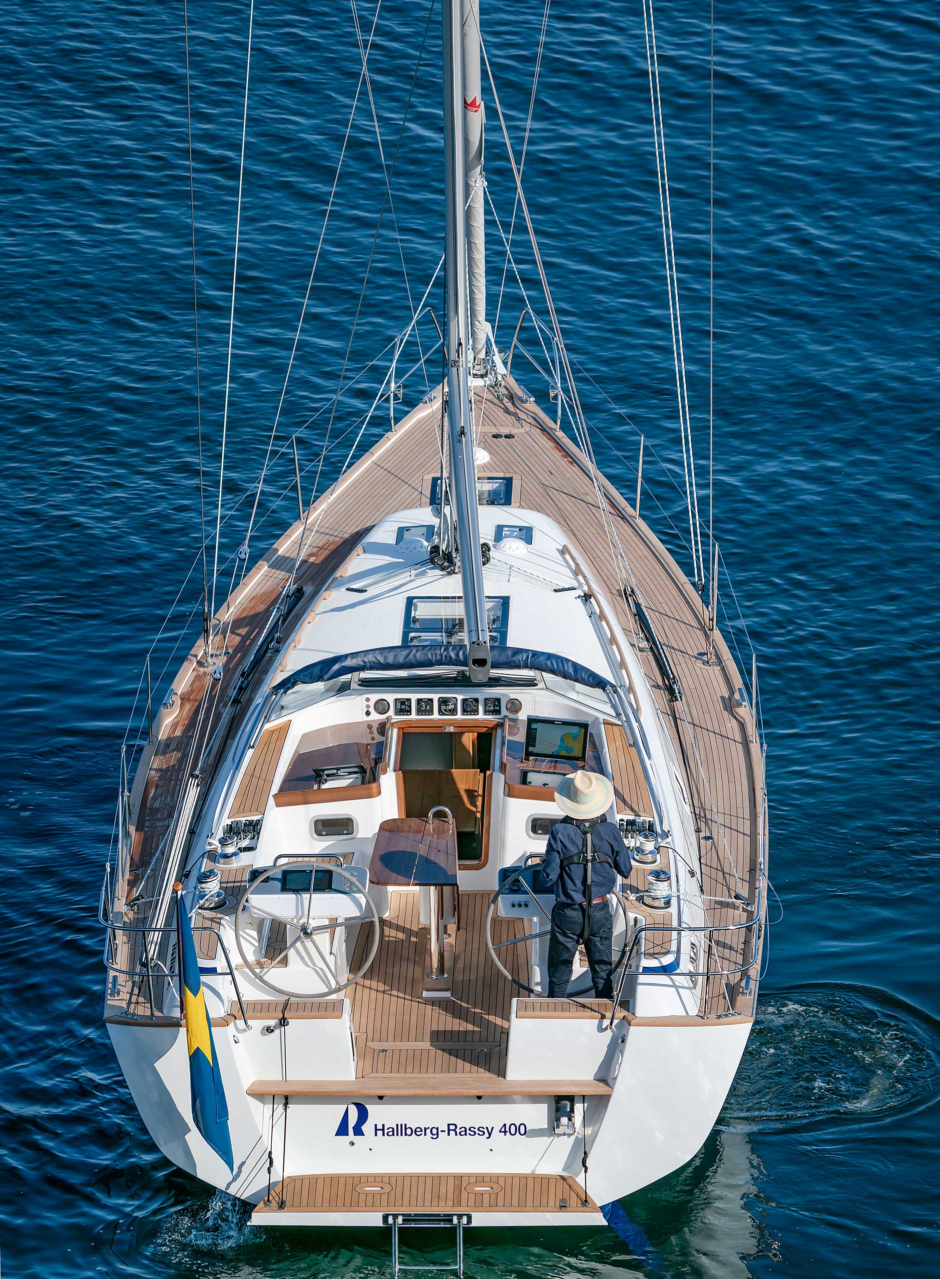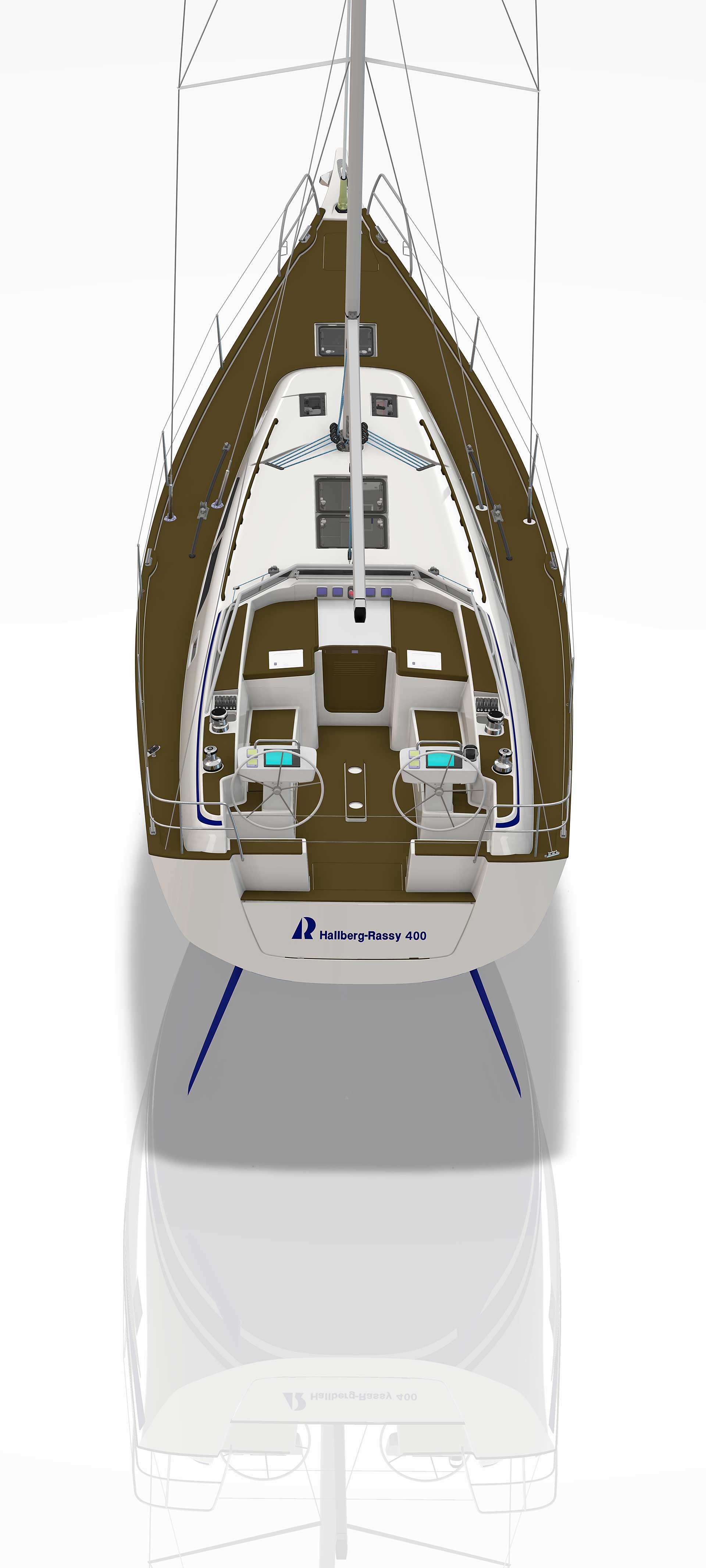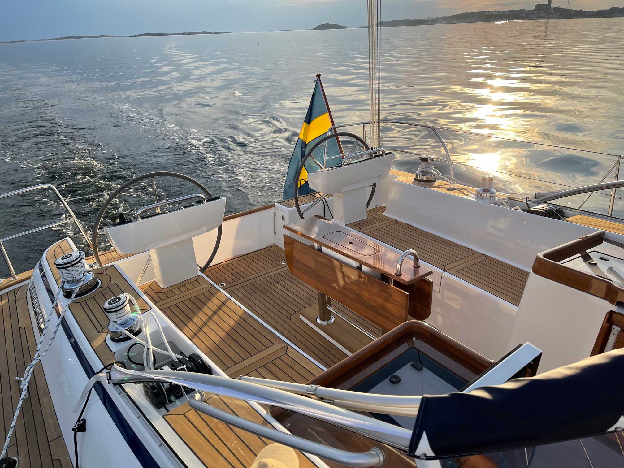 The cockpit is large. The twin helms make it easy to move in the cockpit. There is ample space on the pedestal heads for buttons and displays. The coaming is wide enough to offer flexibility for seating on top of the coaming or at bench level, with the benefit of the side protection by the coaming. The telltails of the headsail are easy to see from the helmsman's position. There is a fixed high gloss varnished teak table available. Control lines are lead in a concealed way to the cockpit coamings, allowing electric winches, without taking up any interior space. There are bins for excess ropes so the cockpit is always clean and tidy. The main sheet track is conveniently located in front of the Hallberg-Rassy typical wind screen. There is a fold-out swim platform available. Cockpit length and deck locker storage is larger than on the 412.