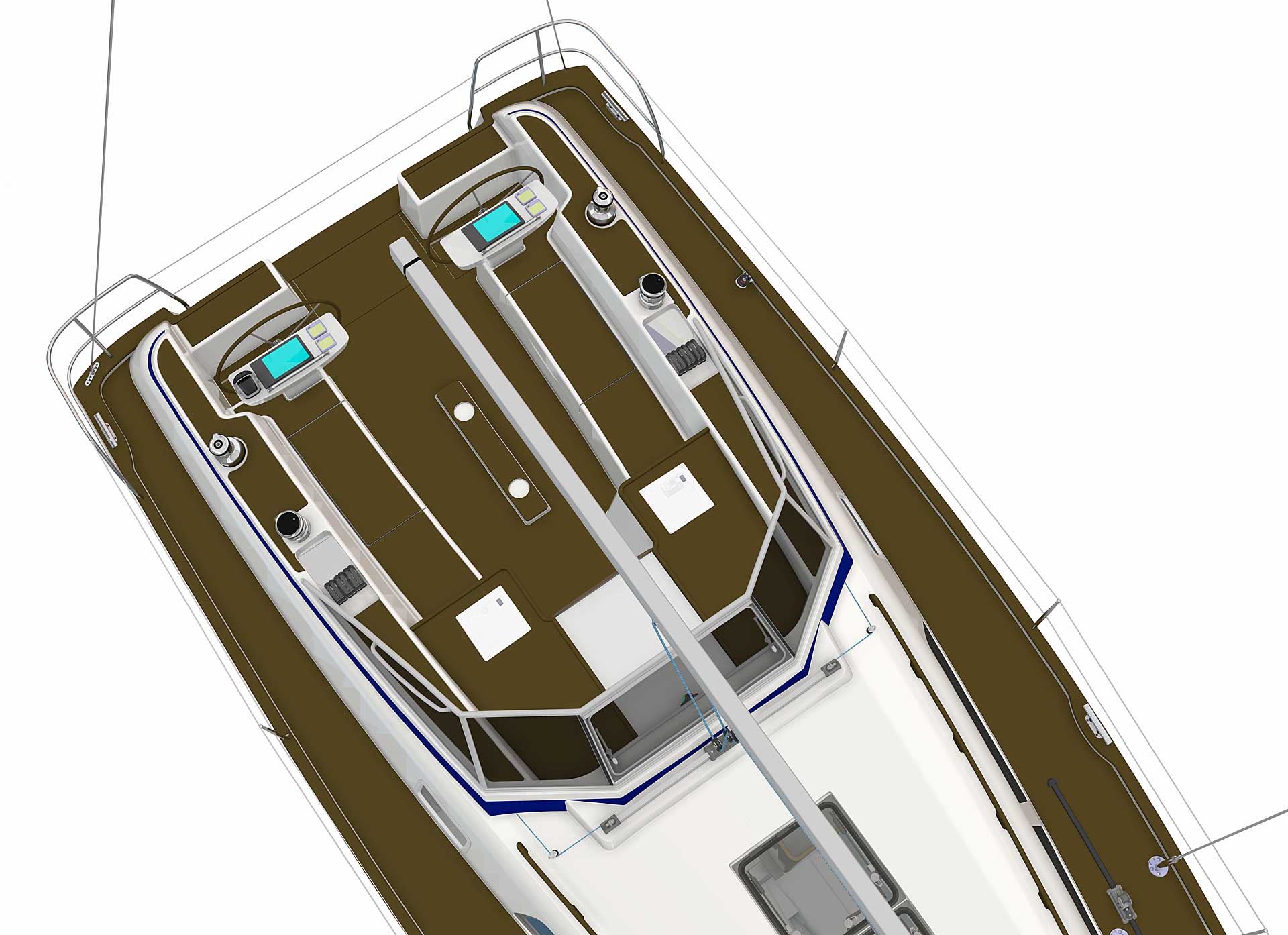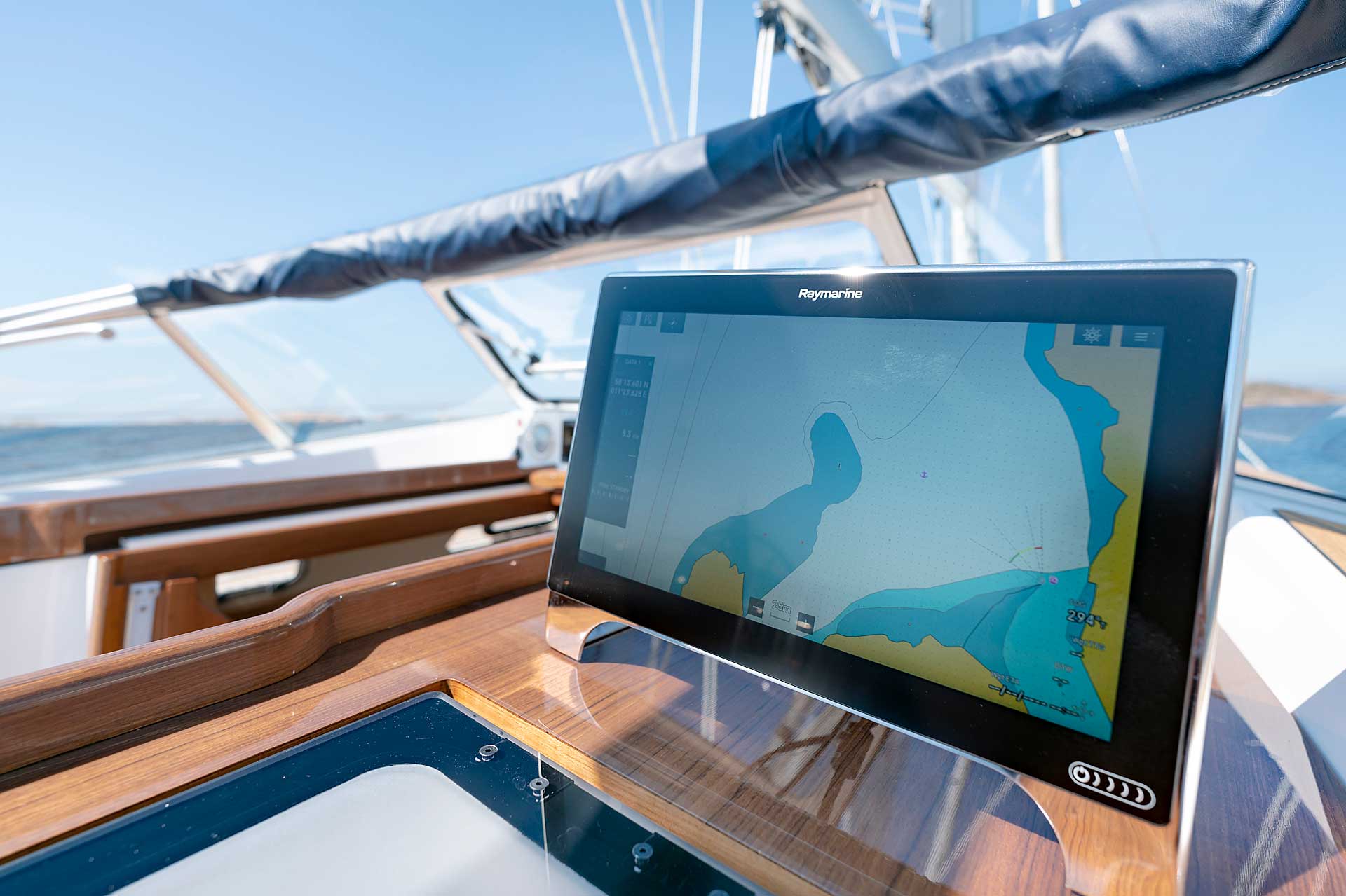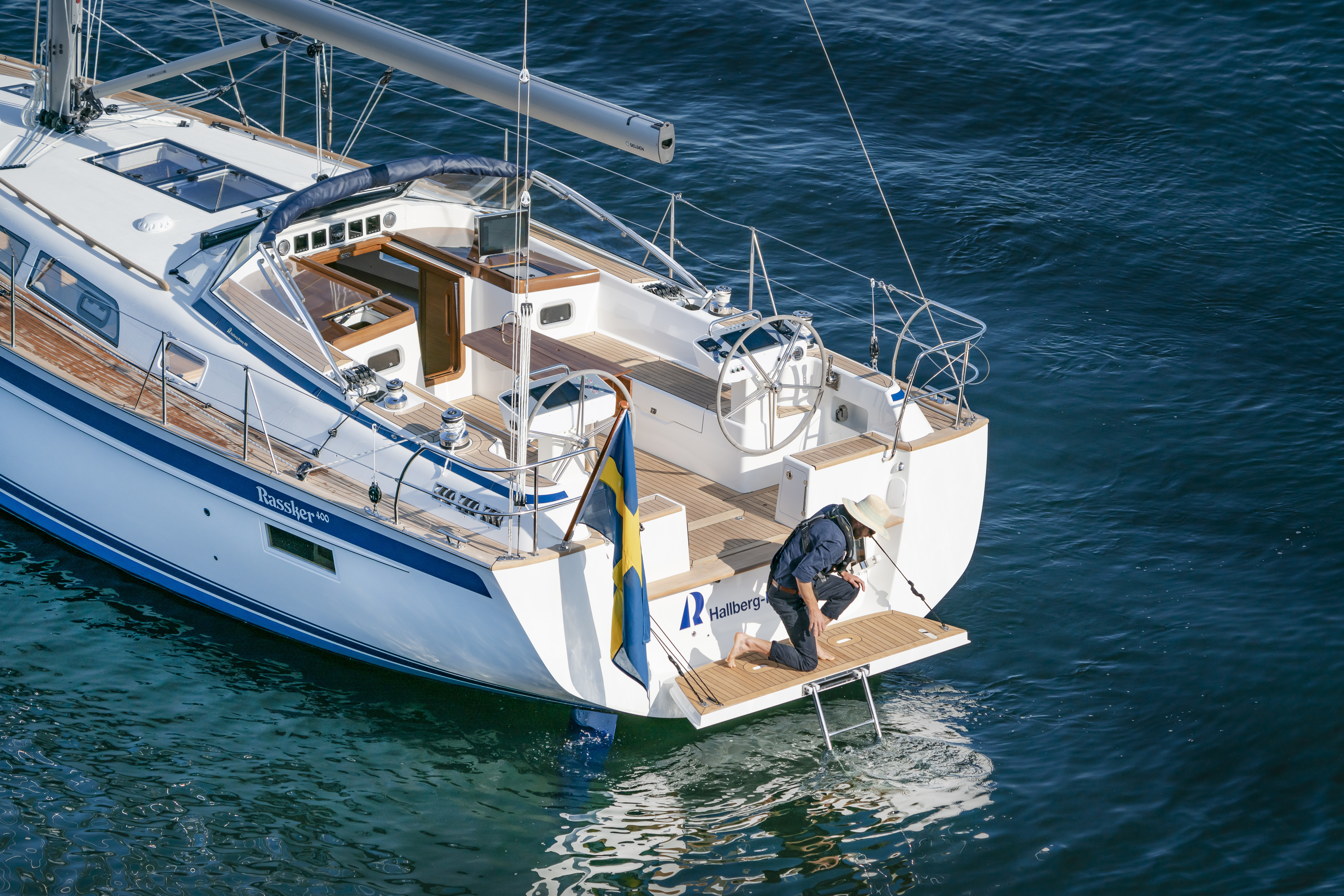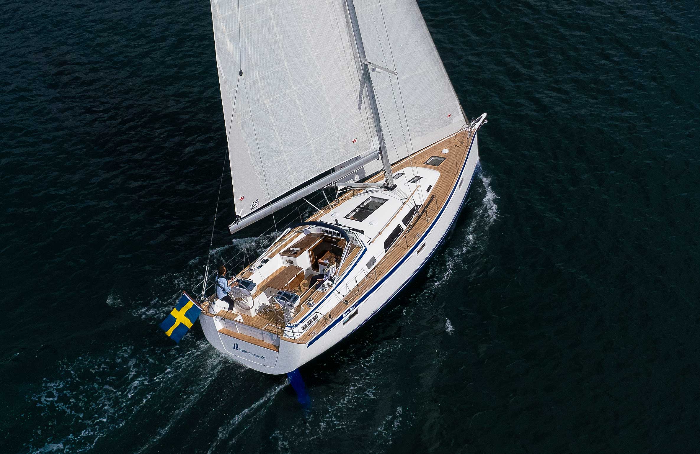 The cockpit is large. The twin helms make it easy to move in the cockpit. There is ample space on the pedestal heads for buttons and displays. The coaming is wide enough to offer flexibility for seating on top of the coaming or at bench level, with the benefit of the side protection by the coaming. The telltails of the headsail are easy to see from the helmsman's position. There is a fixed high gloss varnished teak table available. Control lines are lead in a concealed way to the cockpit coamings, allowing electric winches, without taking up any interior space. There are bins for excess ropes so the cockpit is always clean and tidy. The main sheet track is conveniently located in front of the Hallberg-Rassy typical wind screen. There is a fold-out swim platform available. Cockpit length and deck locker storage is larger than on the 412.
