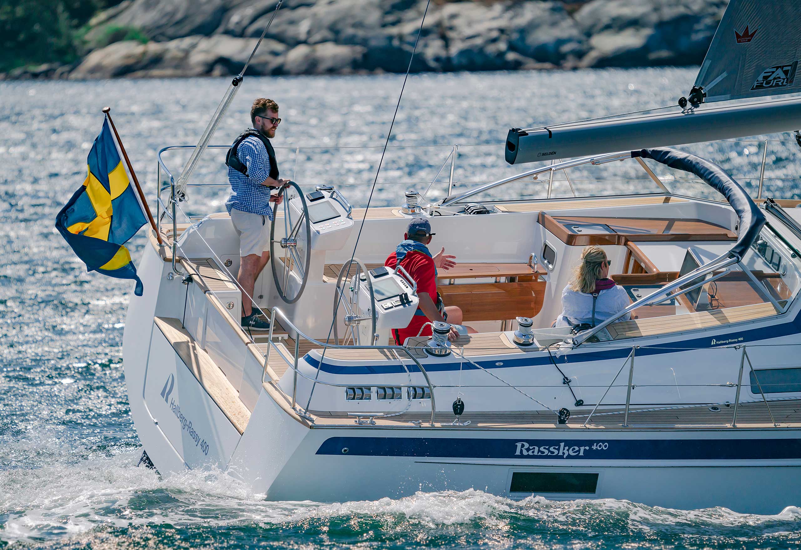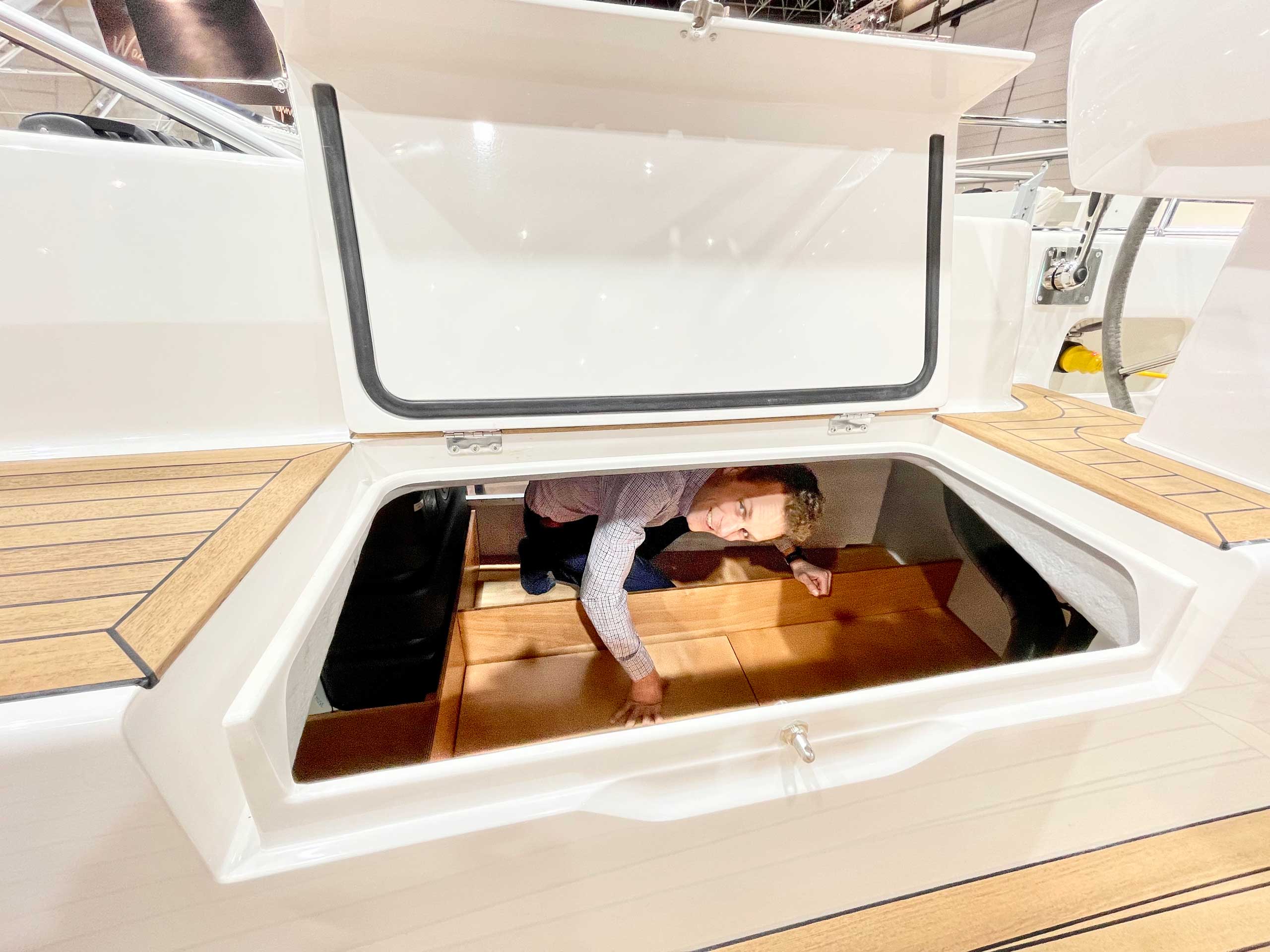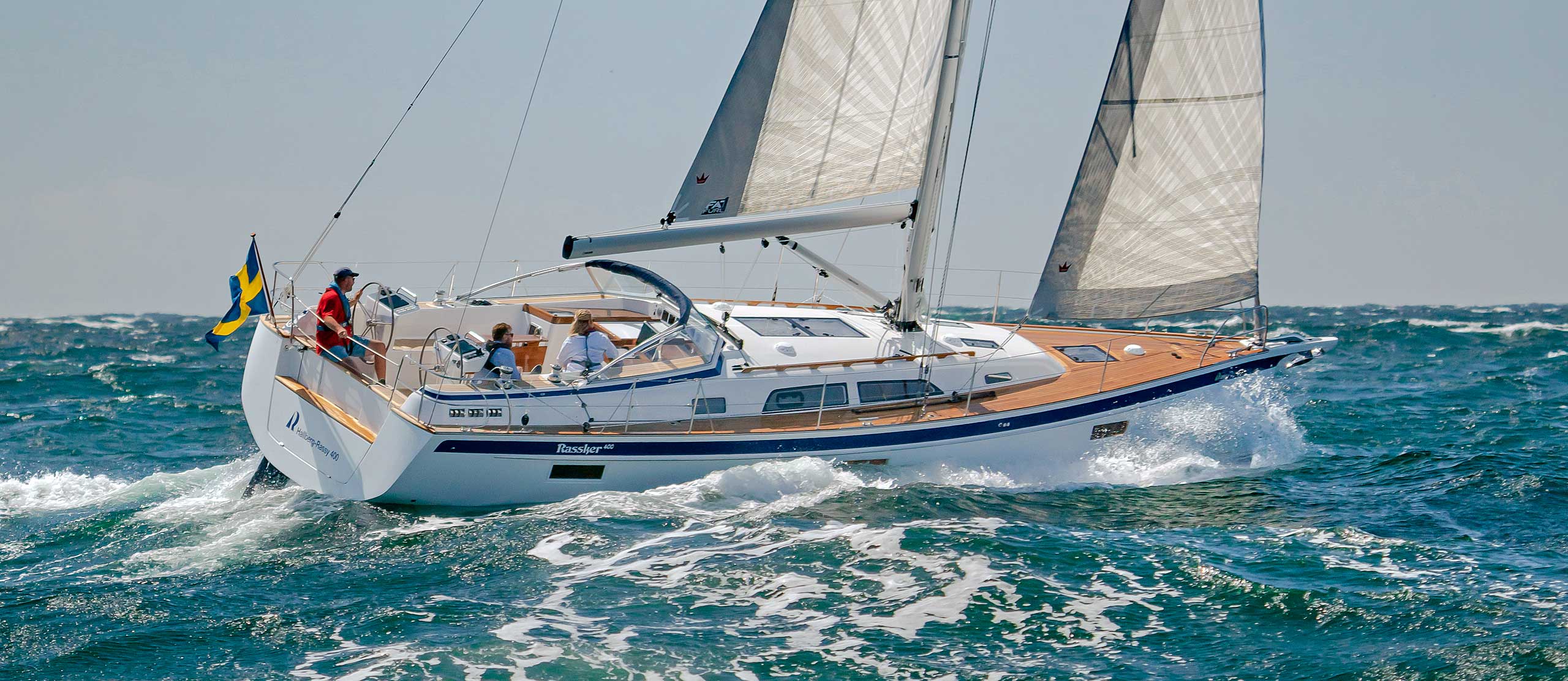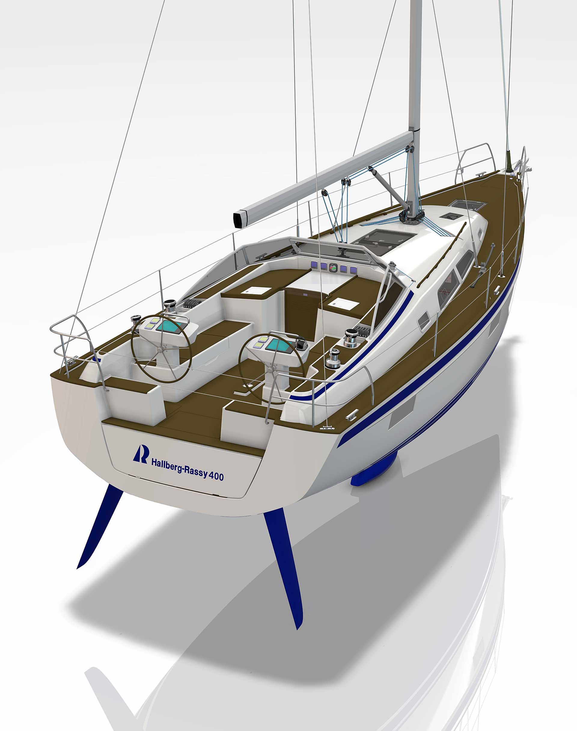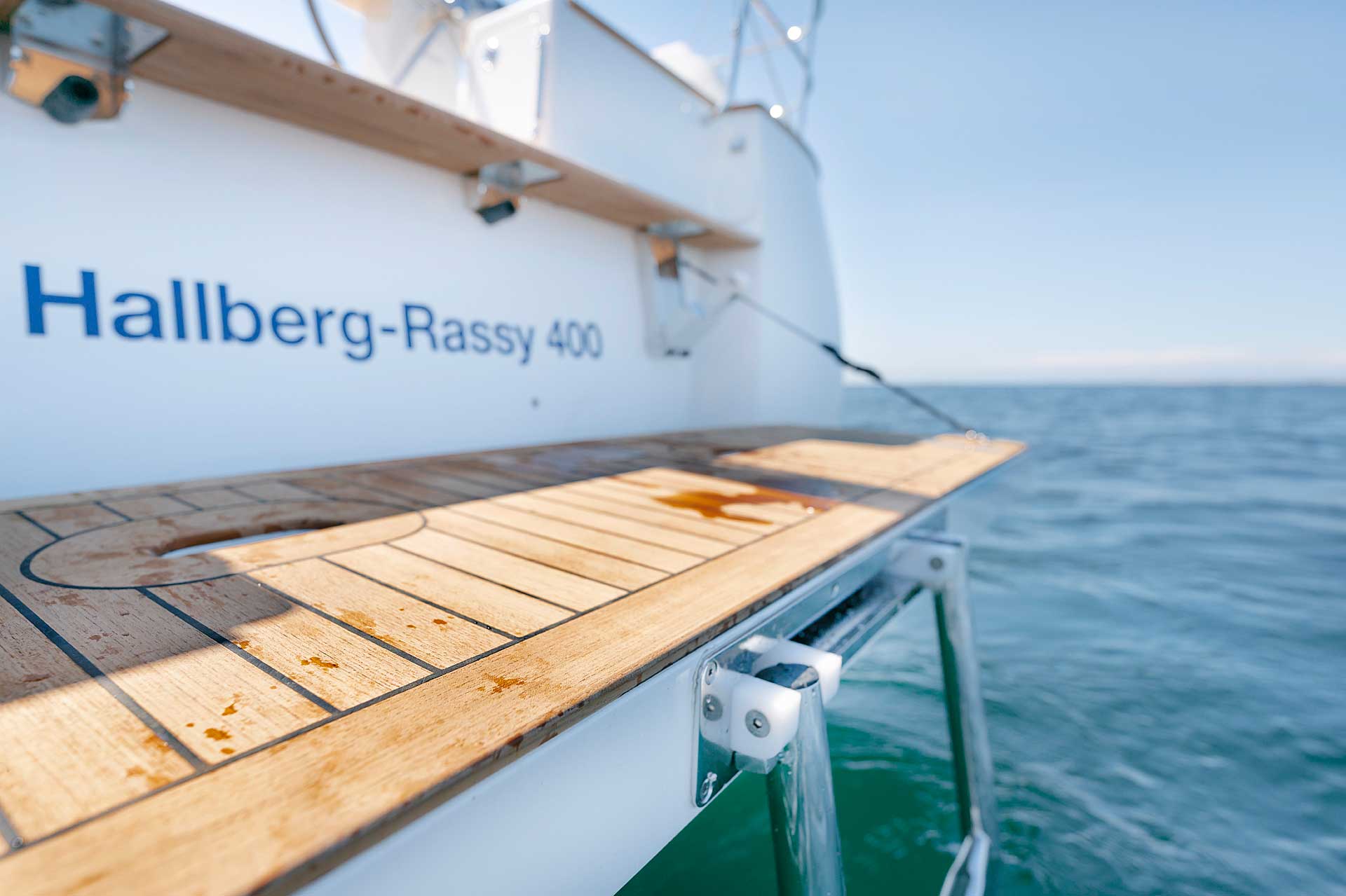 The cockpit is large. The twin helms make it easy to move in the cockpit. There is ample space on the pedestal heads for buttons and displays. The coaming is wide enough to offer flexibility for seating on top of the coaming or at bench level, with the benefit of the side protection by the coaming. The telltails of the headsail are easy to see from the helmsman's position. There is a fixed high gloss varnished teak table available. Control lines are lead in a concealed way to the cockpit coamings, allowing electric winches, without taking up any interior space. There are bins for excess ropes so the cockpit is always clean and tidy. The main sheet track is conveniently located in front of the Hallberg-Rassy typical wind screen. There is a fold-out swim platform available. Cockpit length and deck locker storage is larger than on the 412.
