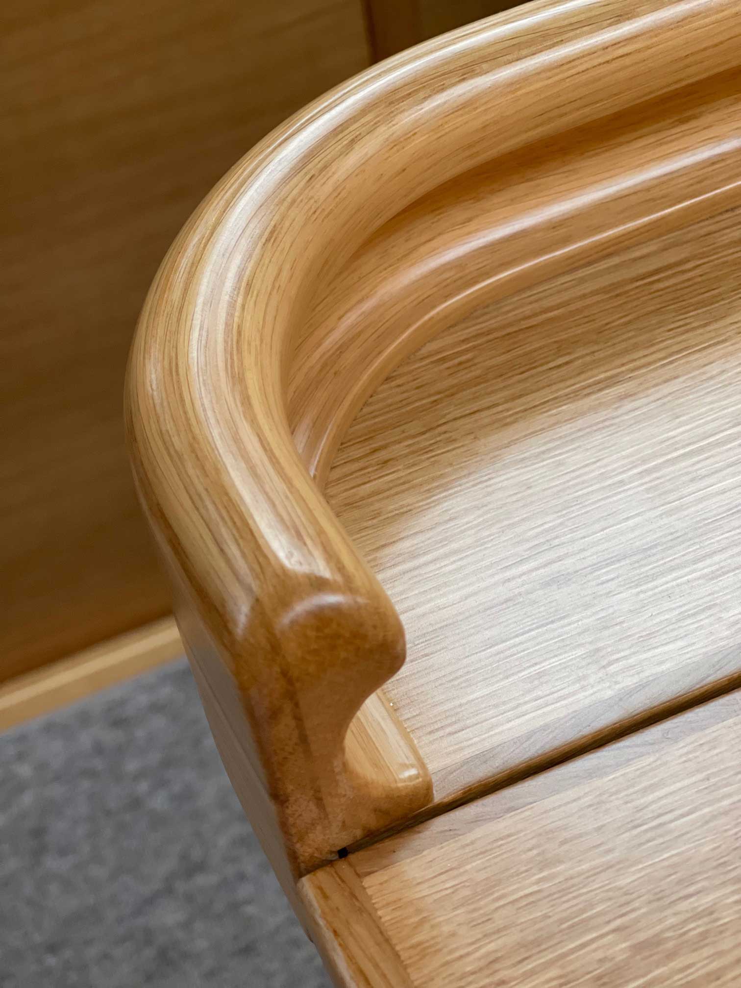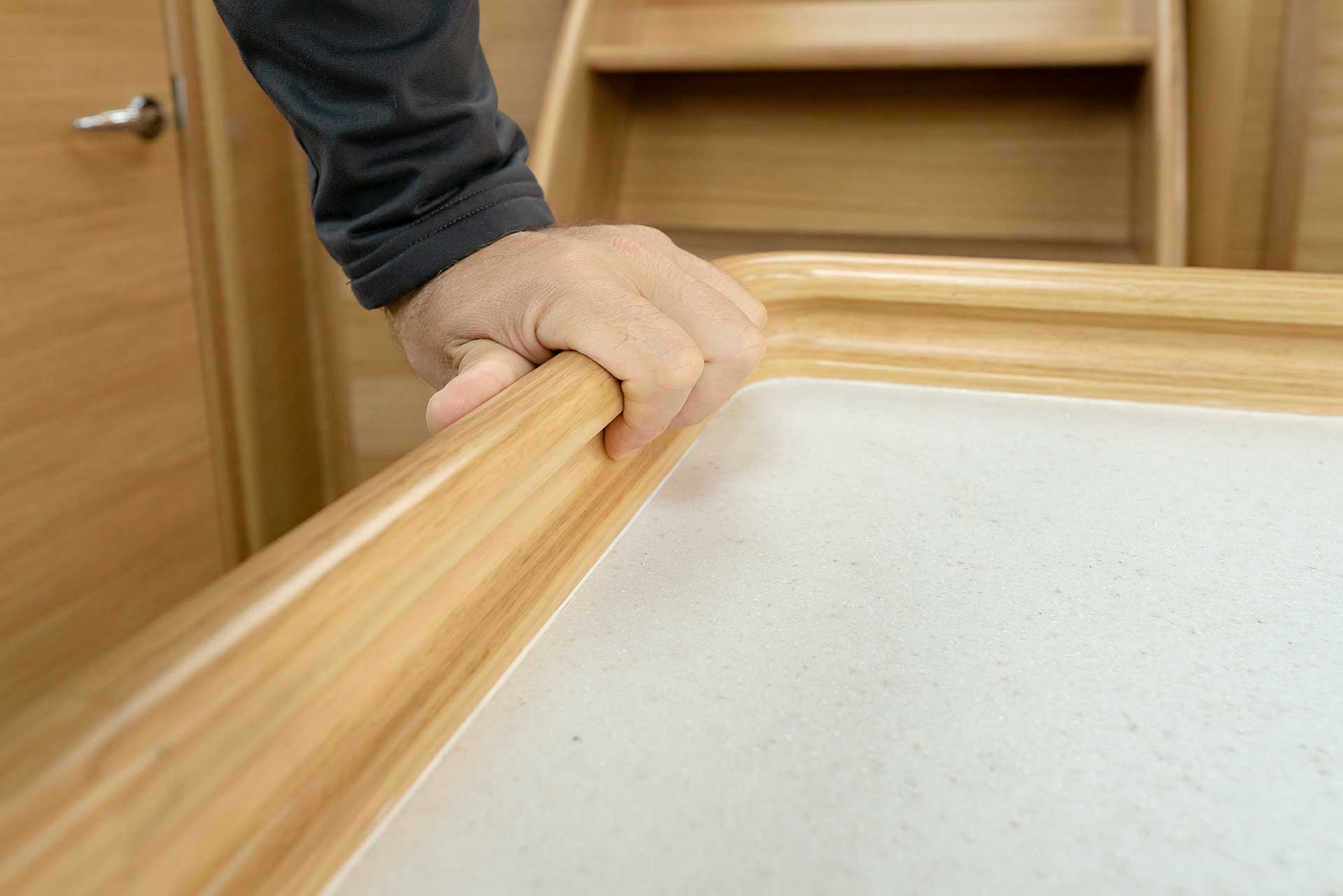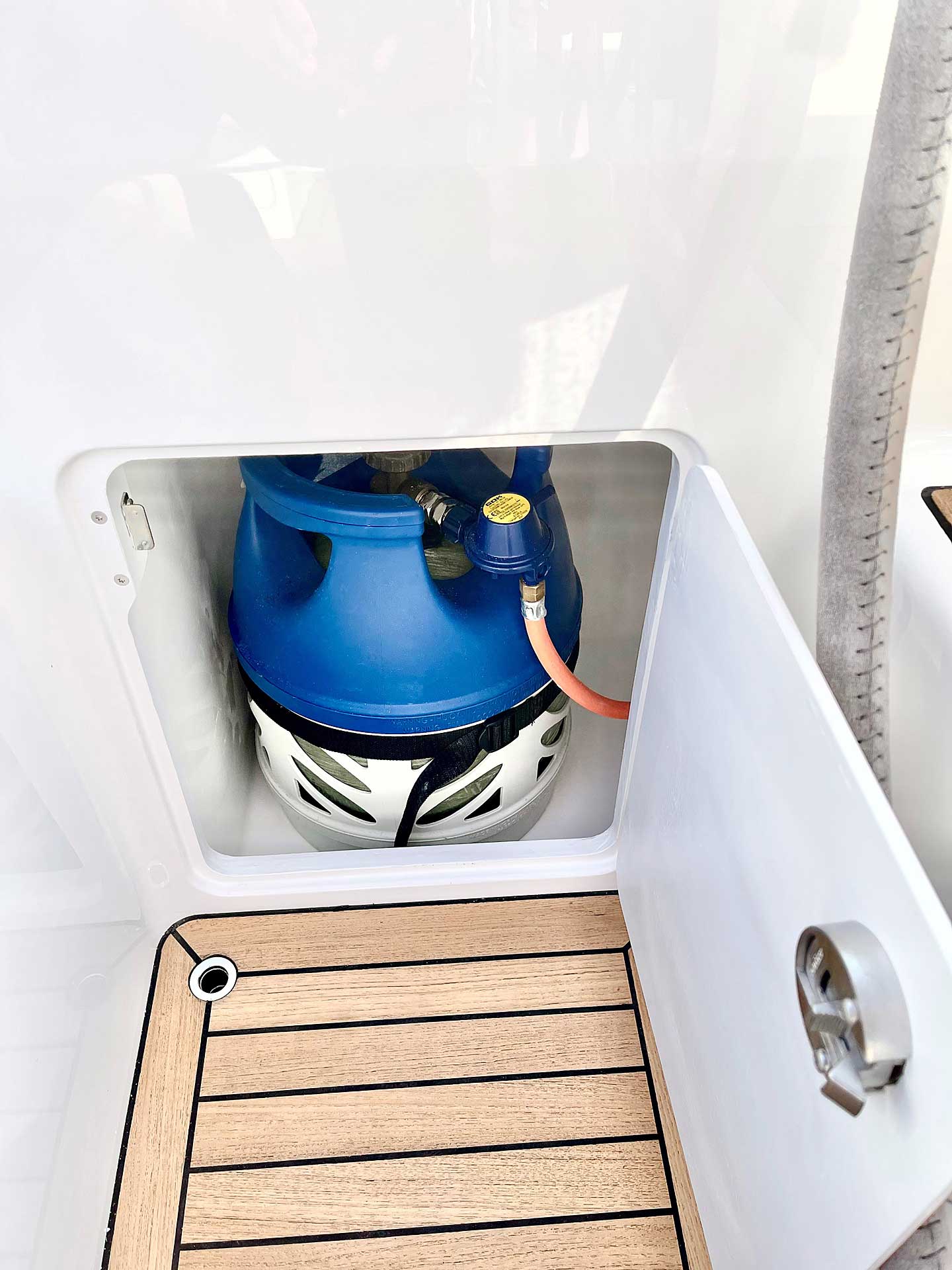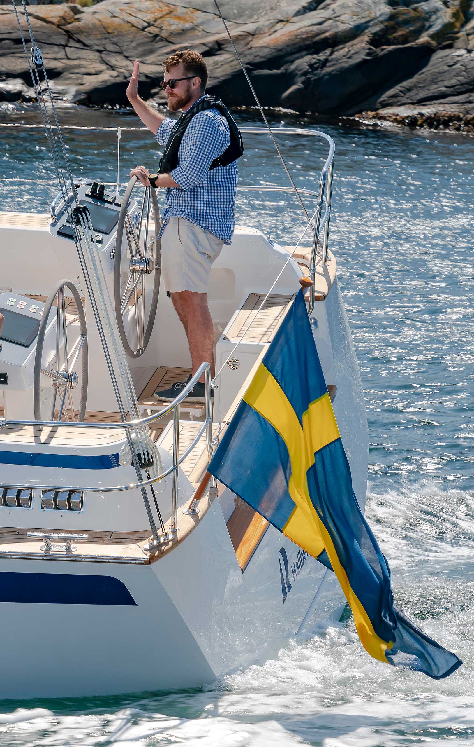 The cockpit is large. The twin helms make it easy to move in the cockpit. There is ample space on the pedestal heads for buttons and displays. The coaming is wide enough to offer flexibility for seating on top of the coaming or at bench level, with the benefit of the side protection by the coaming. The telltails of the headsail are easy to see from the helmsman's position. There is a fixed high gloss varnished teak table available. Control lines are lead in a concealed way to the cockpit coamings, allowing electric winches, without taking up any interior space. There are bins for excess ropes so the cockpit is always clean and tidy. The main sheet track is conveniently located in front of the Hallberg-Rassy typical wind screen. There is a fold-out swim platform available. Cockpit length and deck locker storage is larger than on the 412.