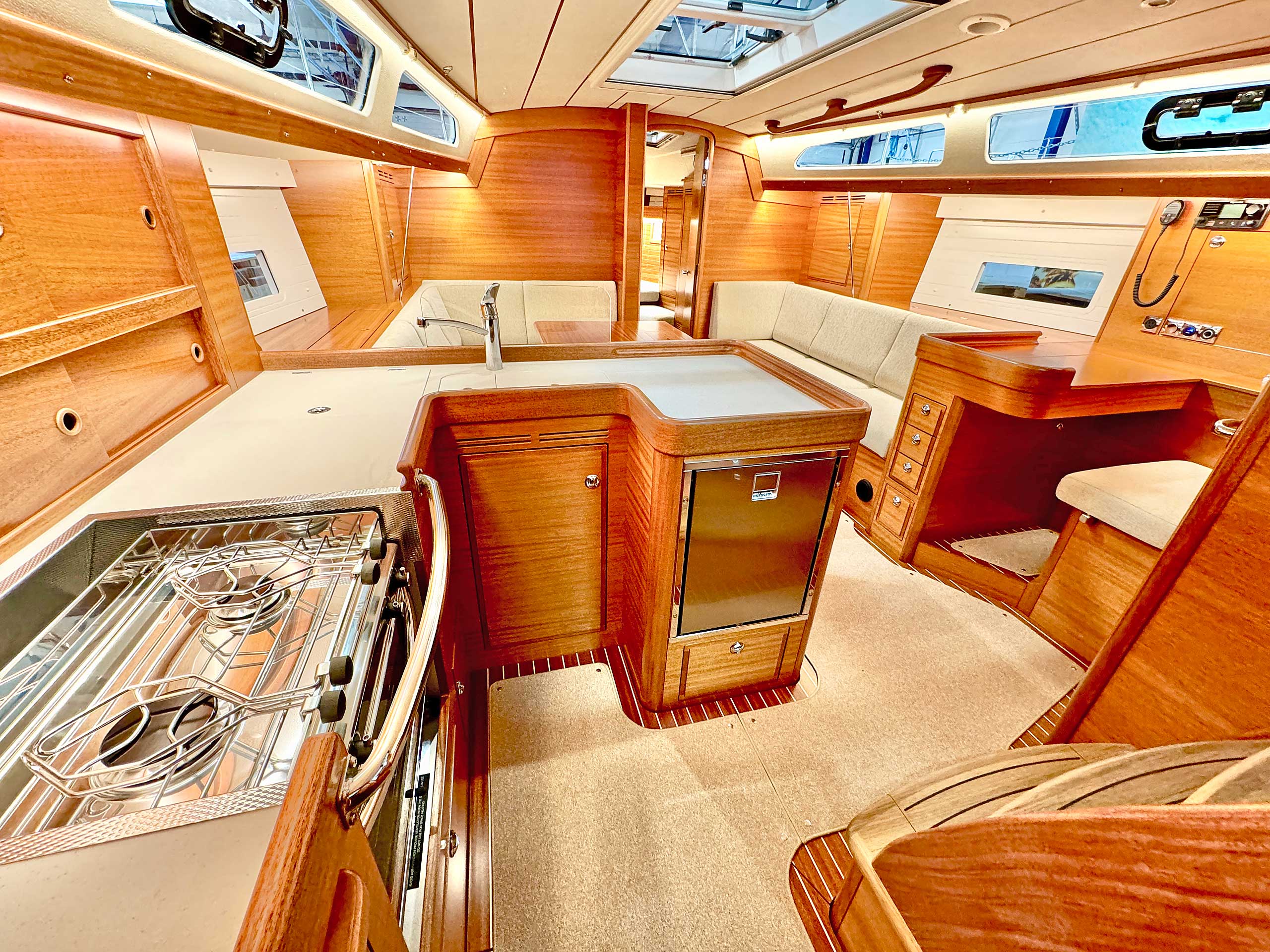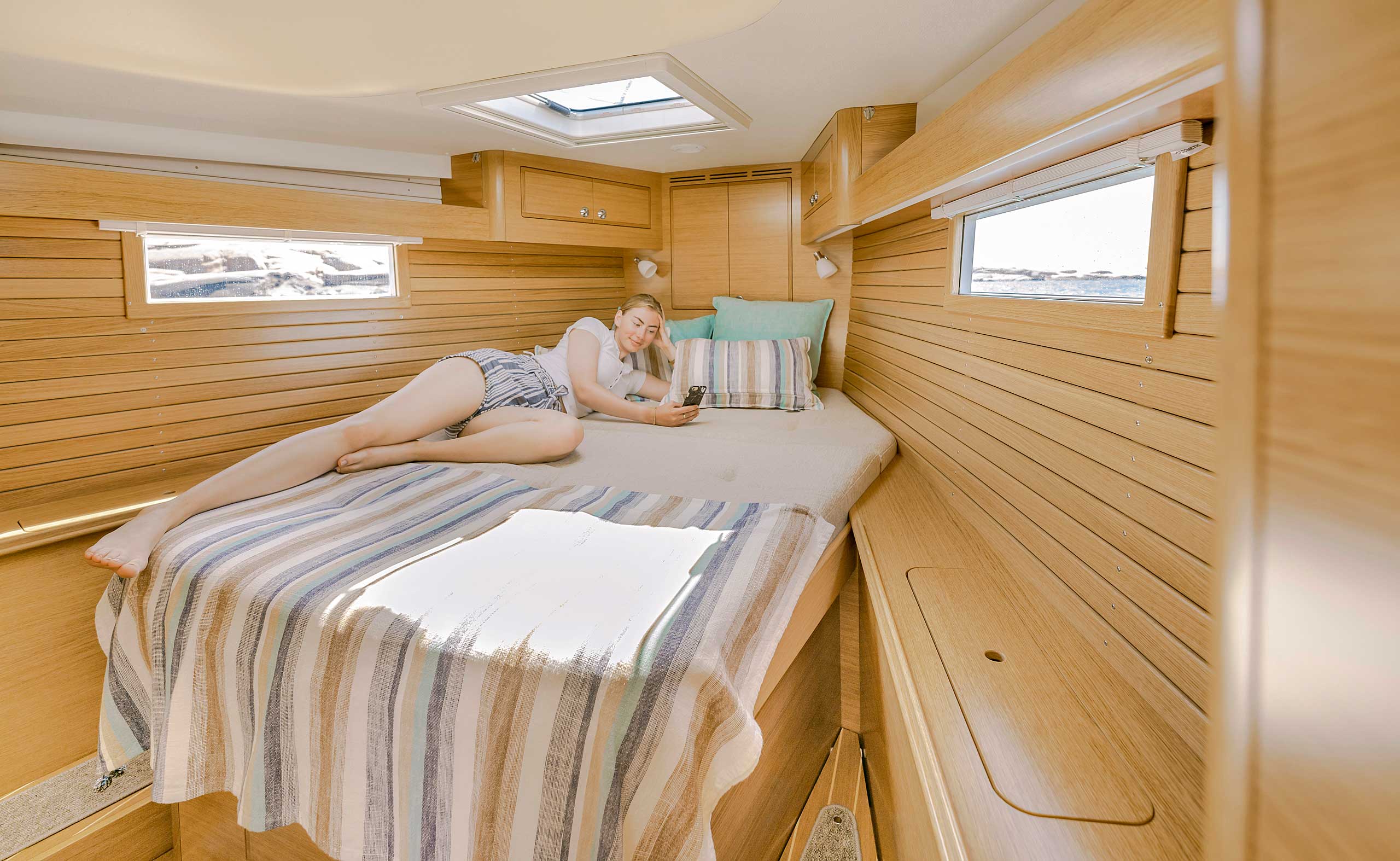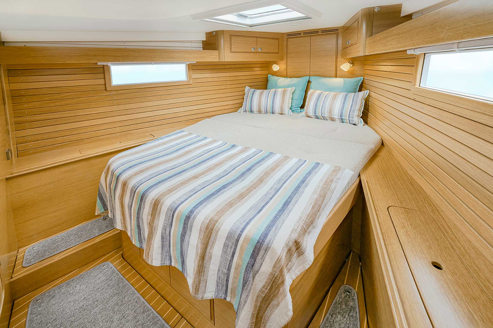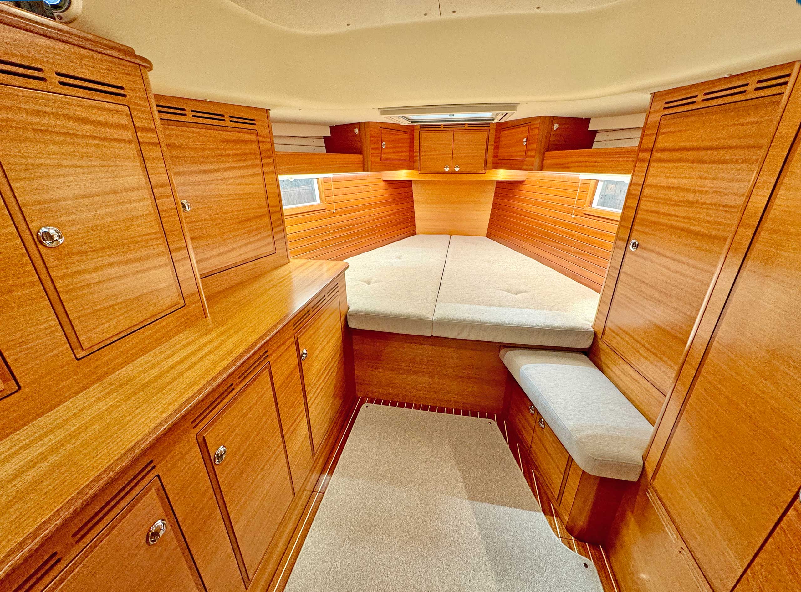Although she is "just" 40 ft, she offers one or two heads, and two or three sleeping cabins. The forward cabin may be ordered in three different layouts: