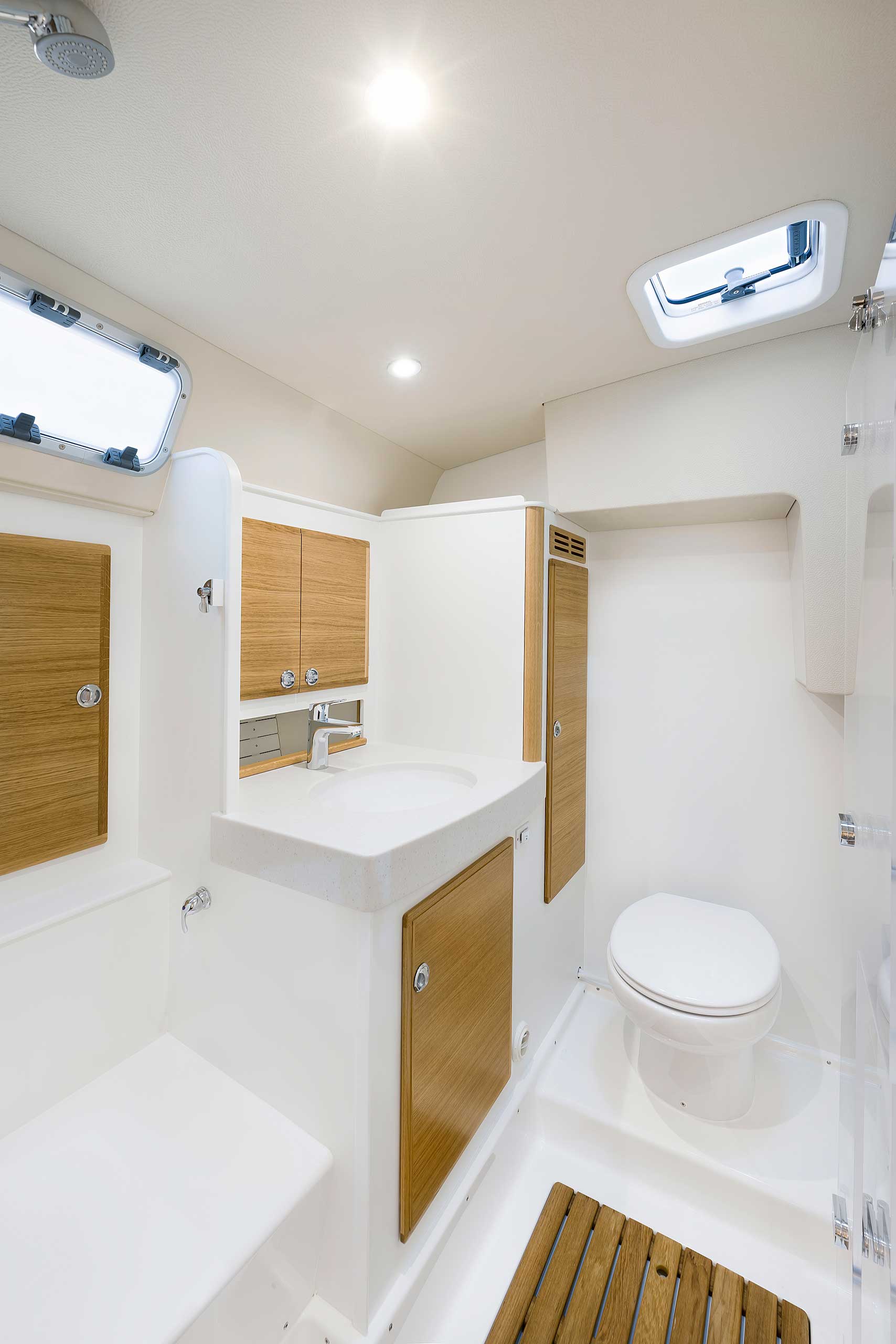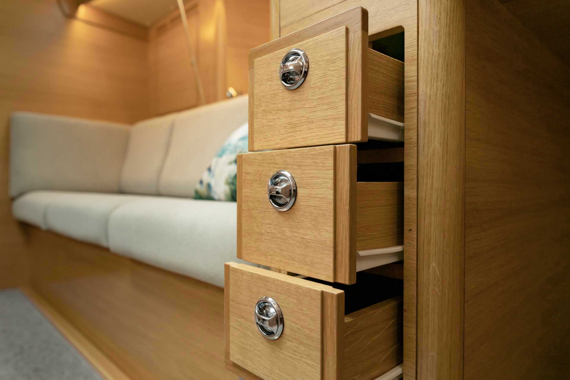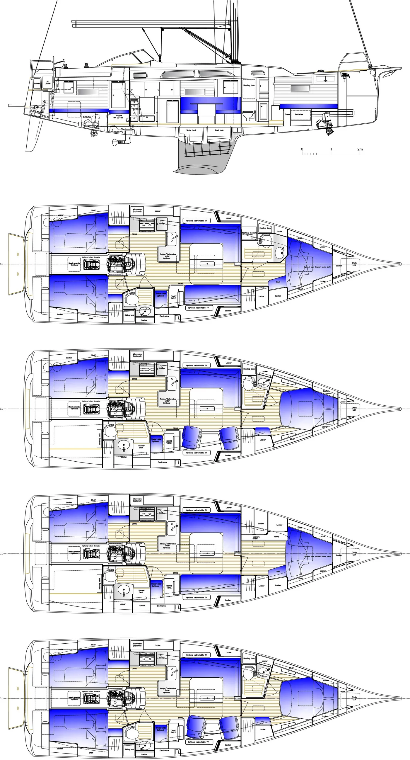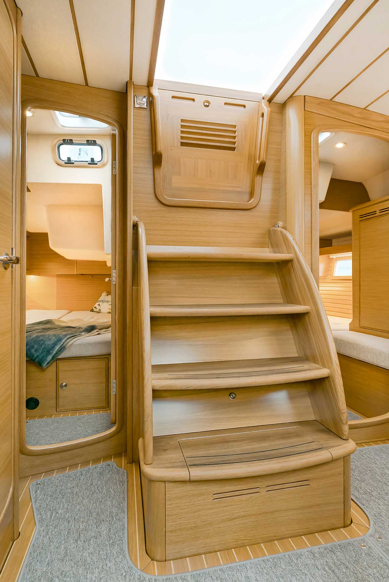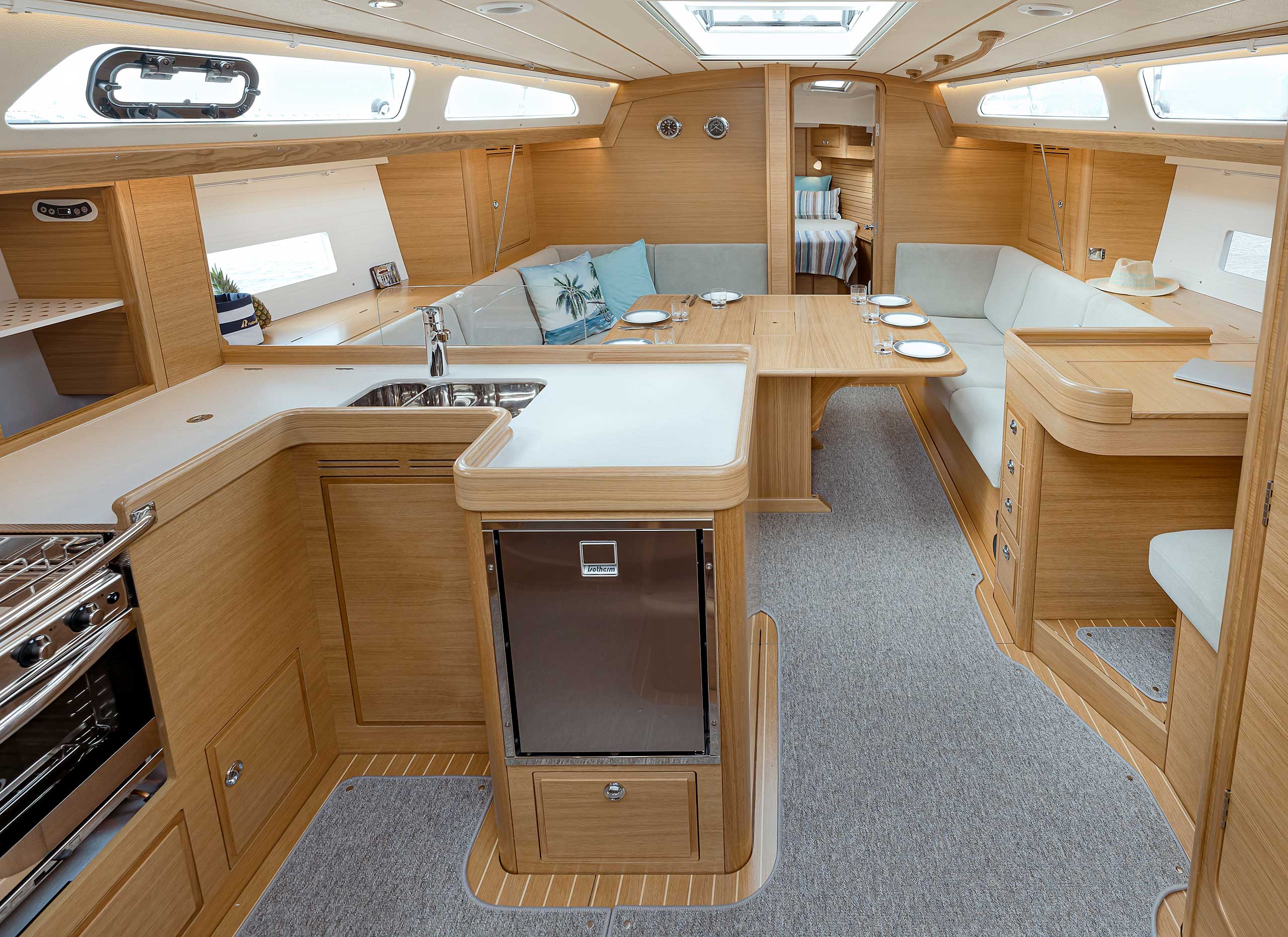 Although she is "just" 40 ft, she offers one or two heads, and two or three sleeping cabins. The forward cabin may be ordered in three different layouts: