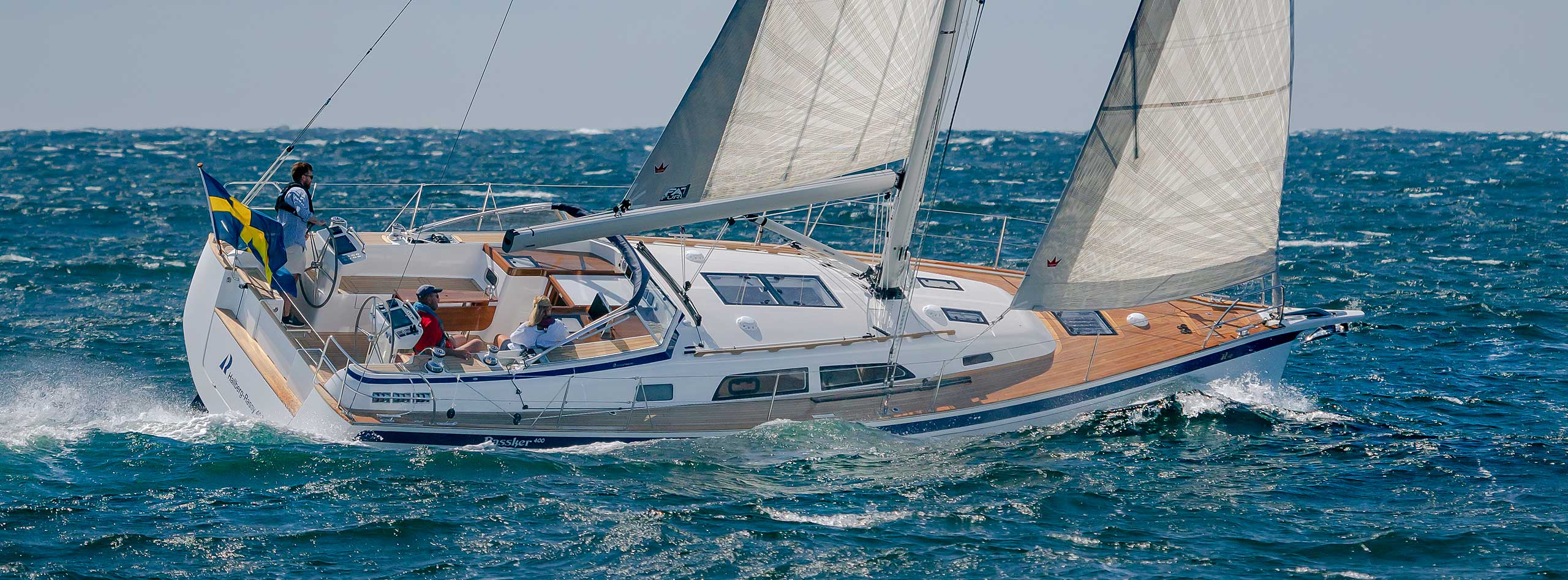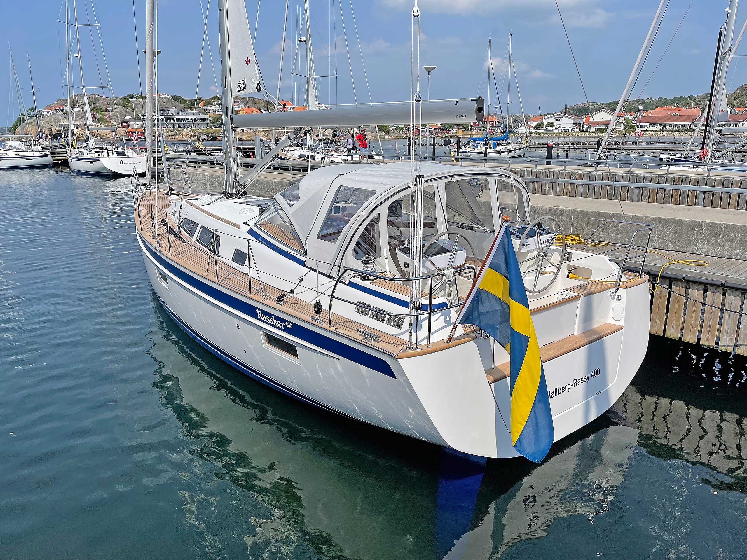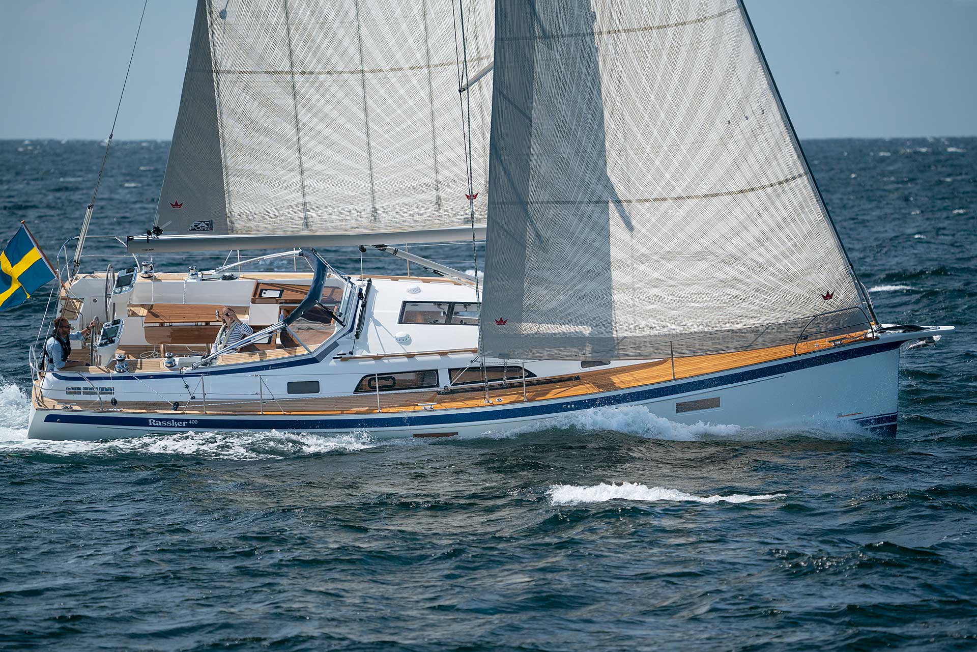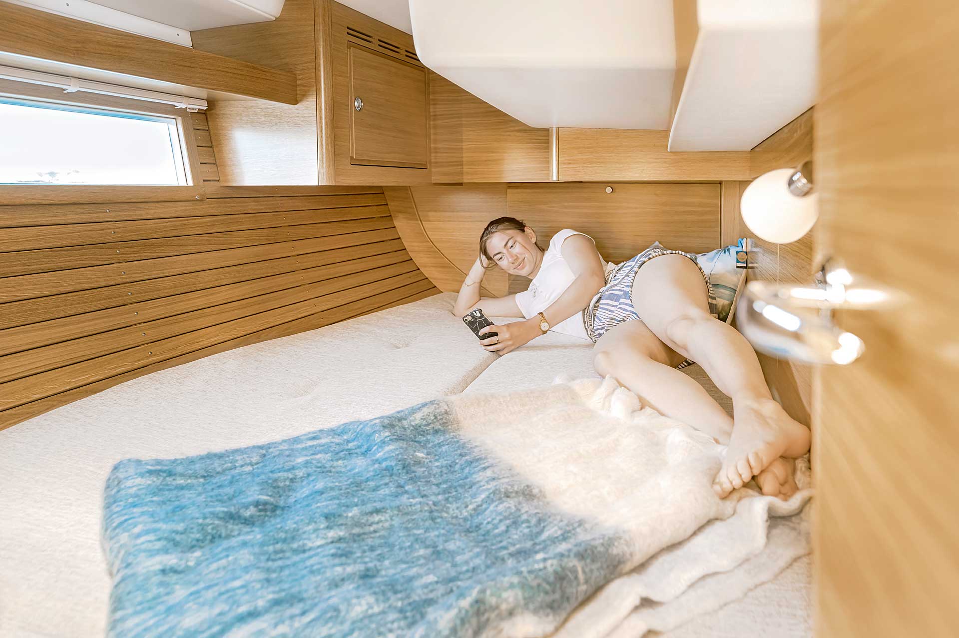 Although she is "just" 40 ft, she offers one or two heads, and two or three sleeping cabins. The forward cabin may be ordered in three different layouts: