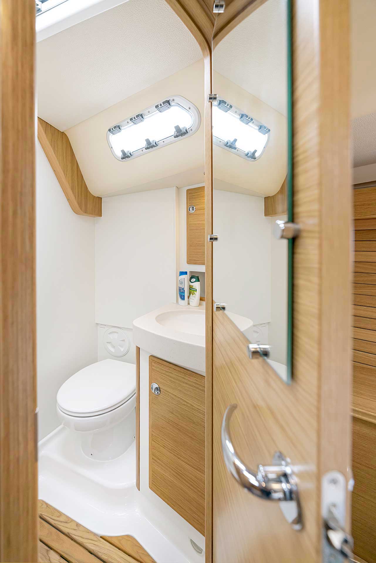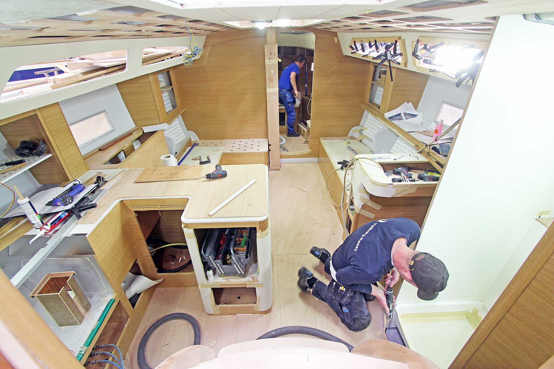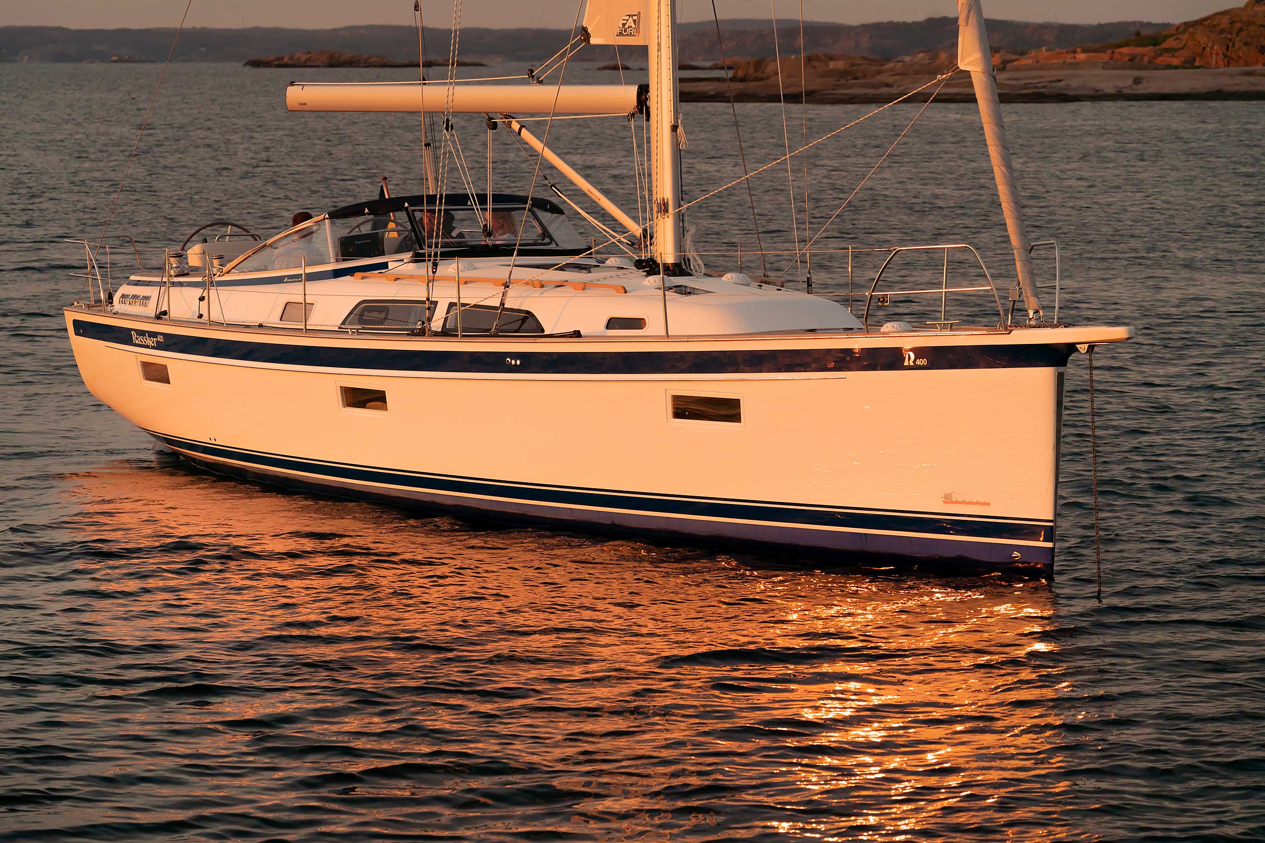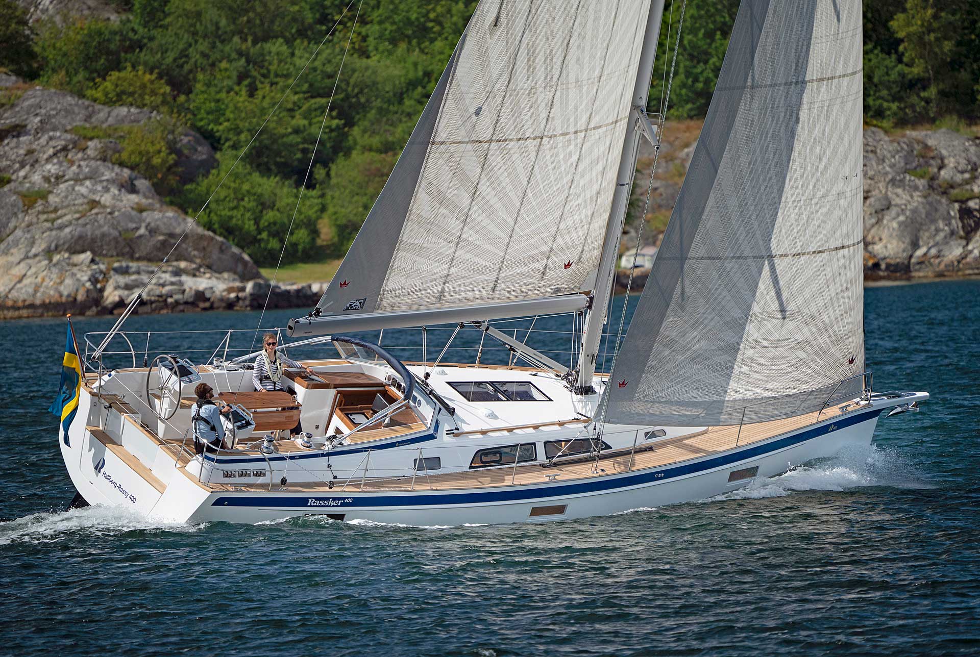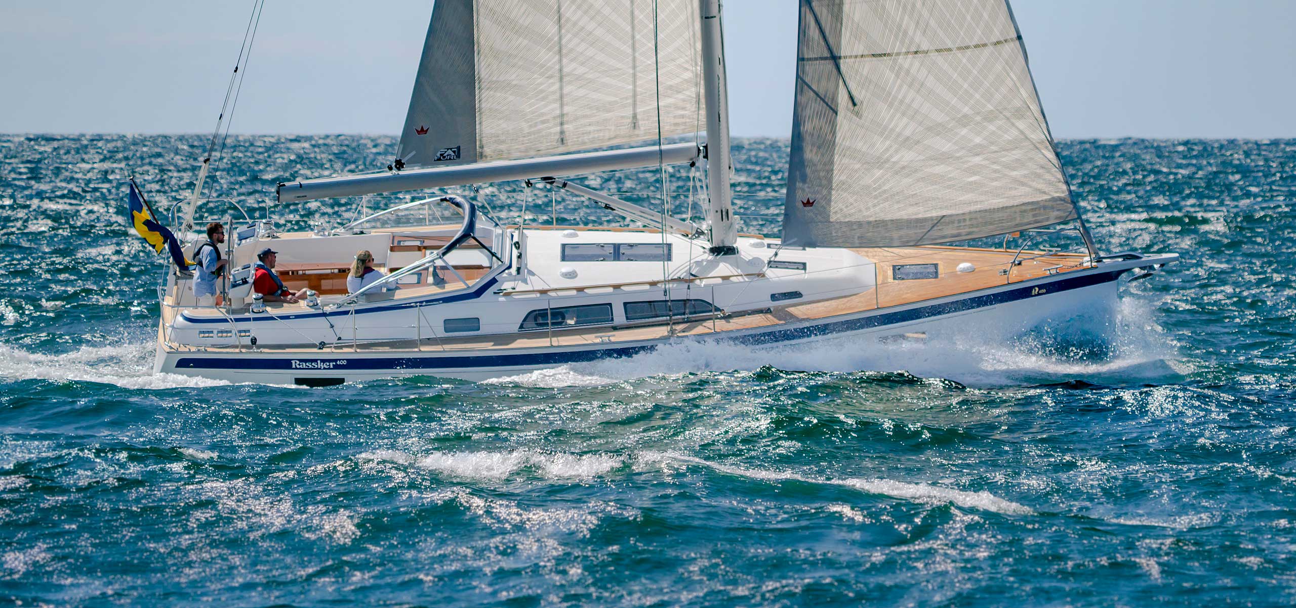 Although she is "just" 40 ft, she offers one or two heads, and two or three sleeping cabins. The forward cabin may be ordered in three different layouts: