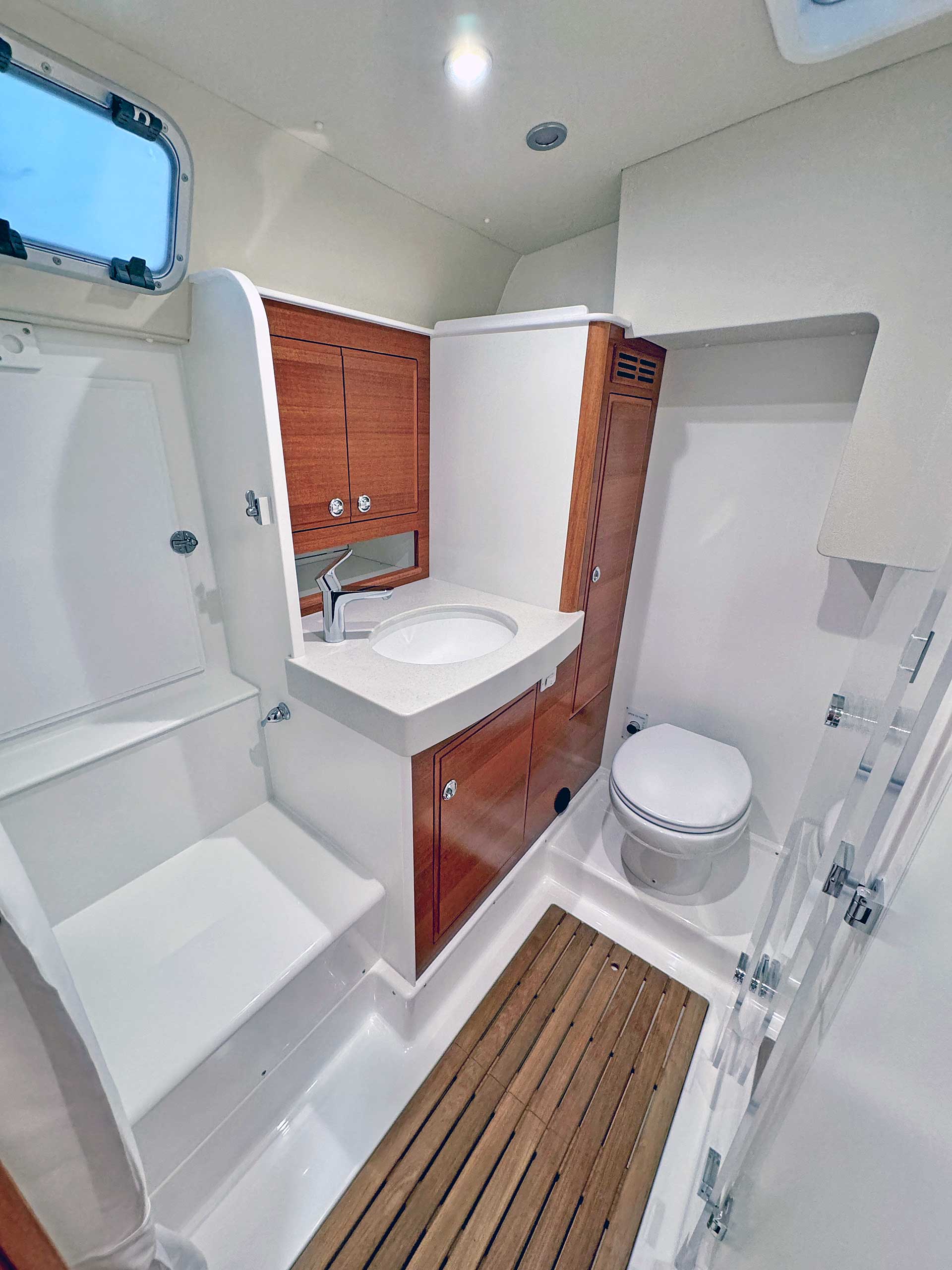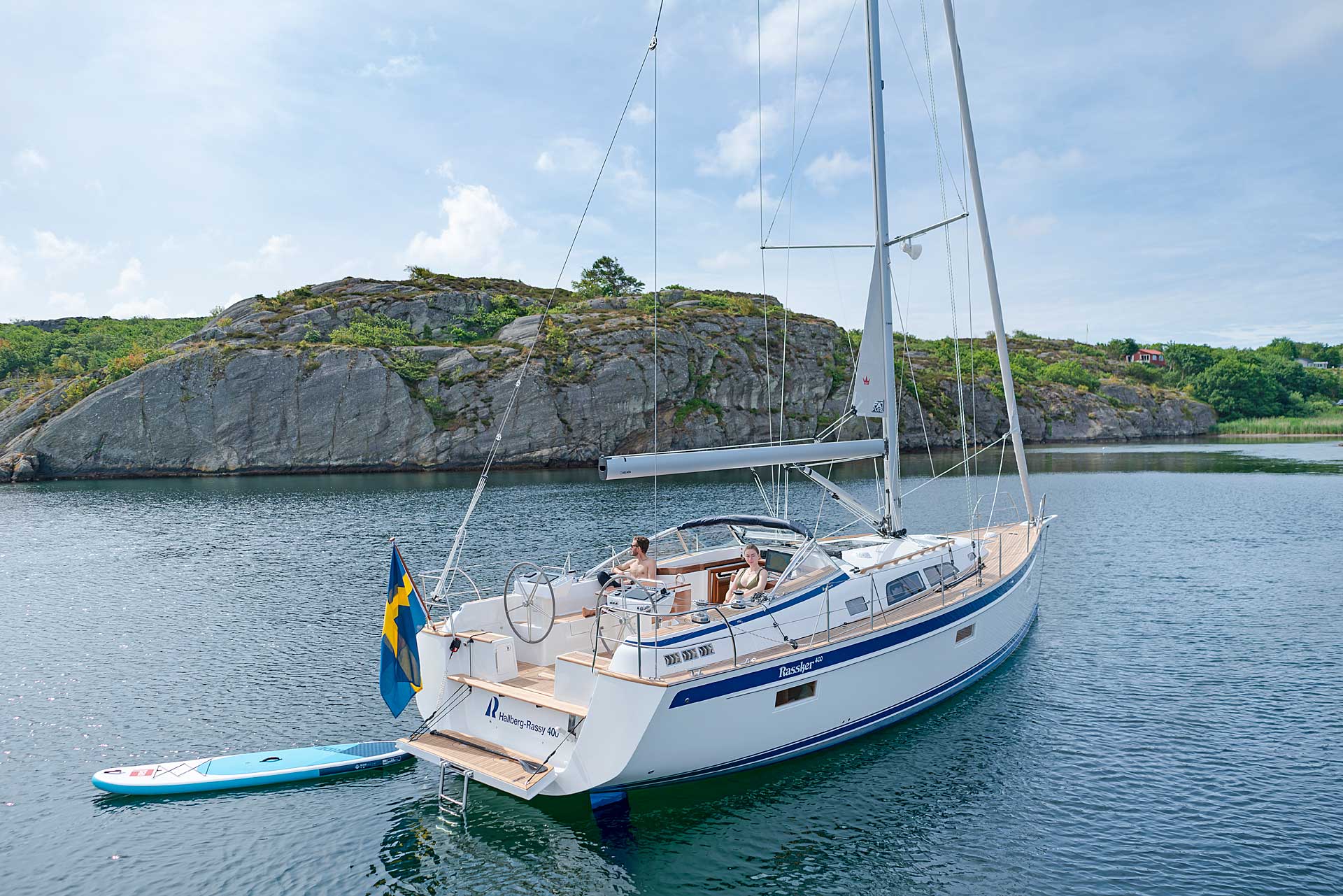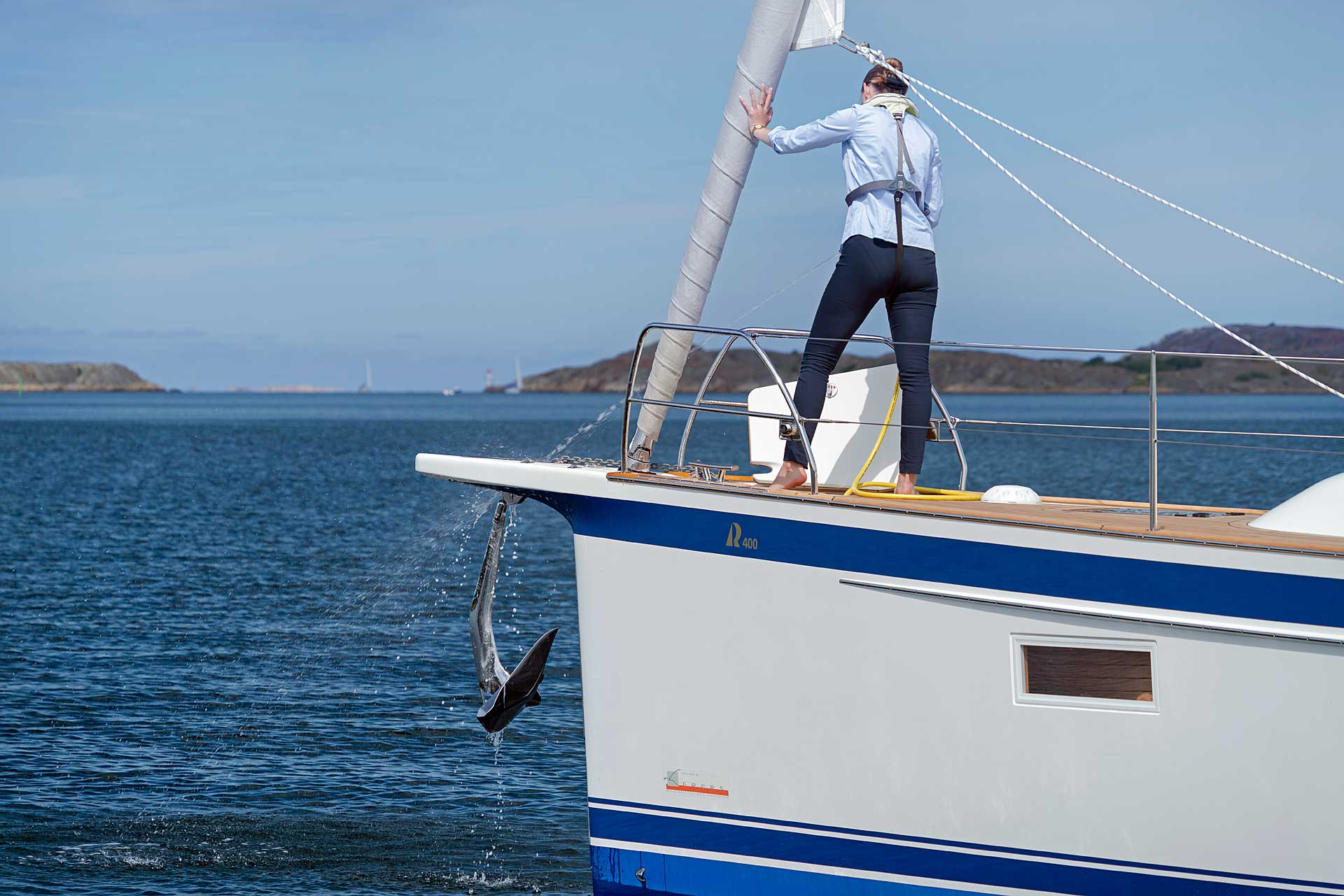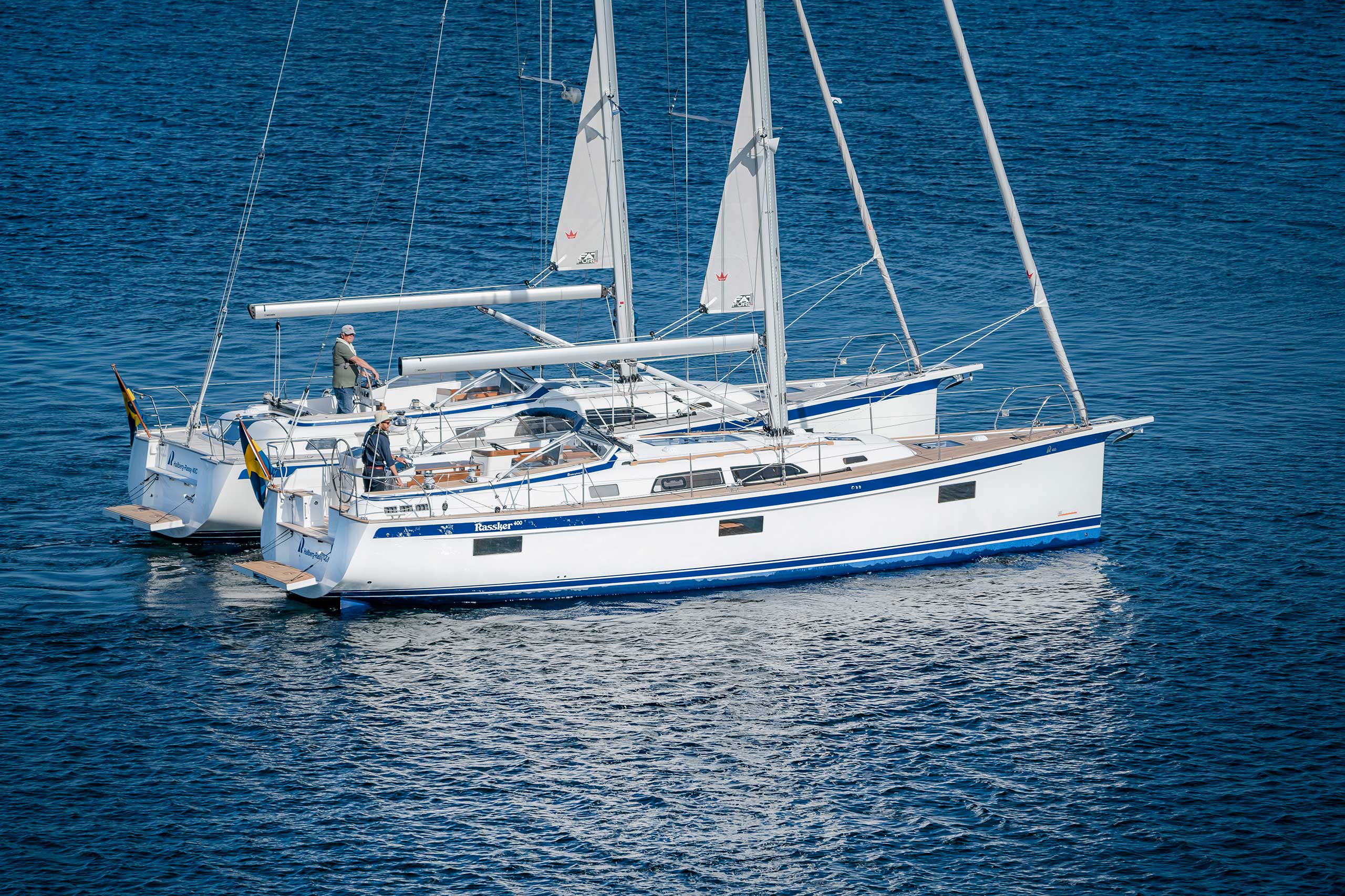 Although she is "just" 40 ft, she offers one or two heads, and two or three sleeping cabins. The forward cabin may be ordered in three different layouts: