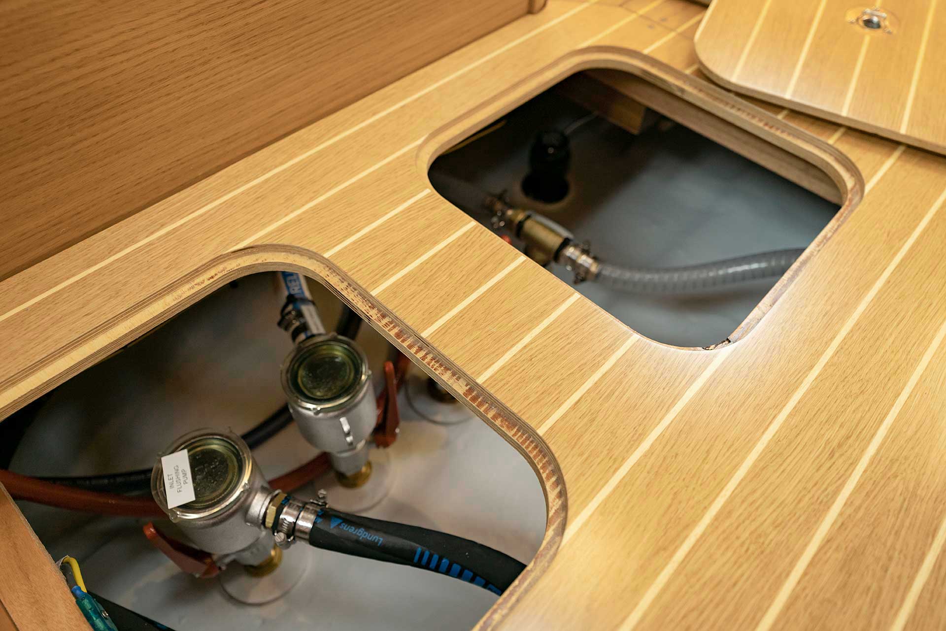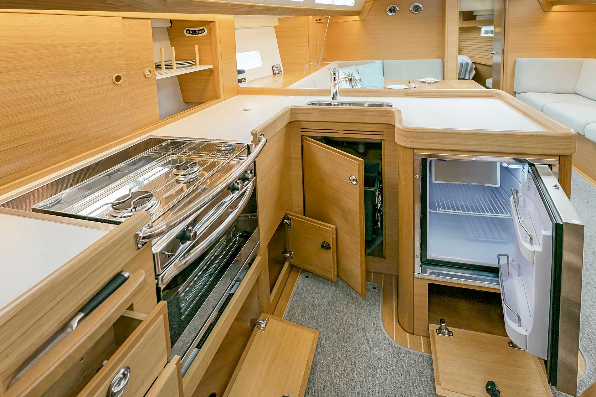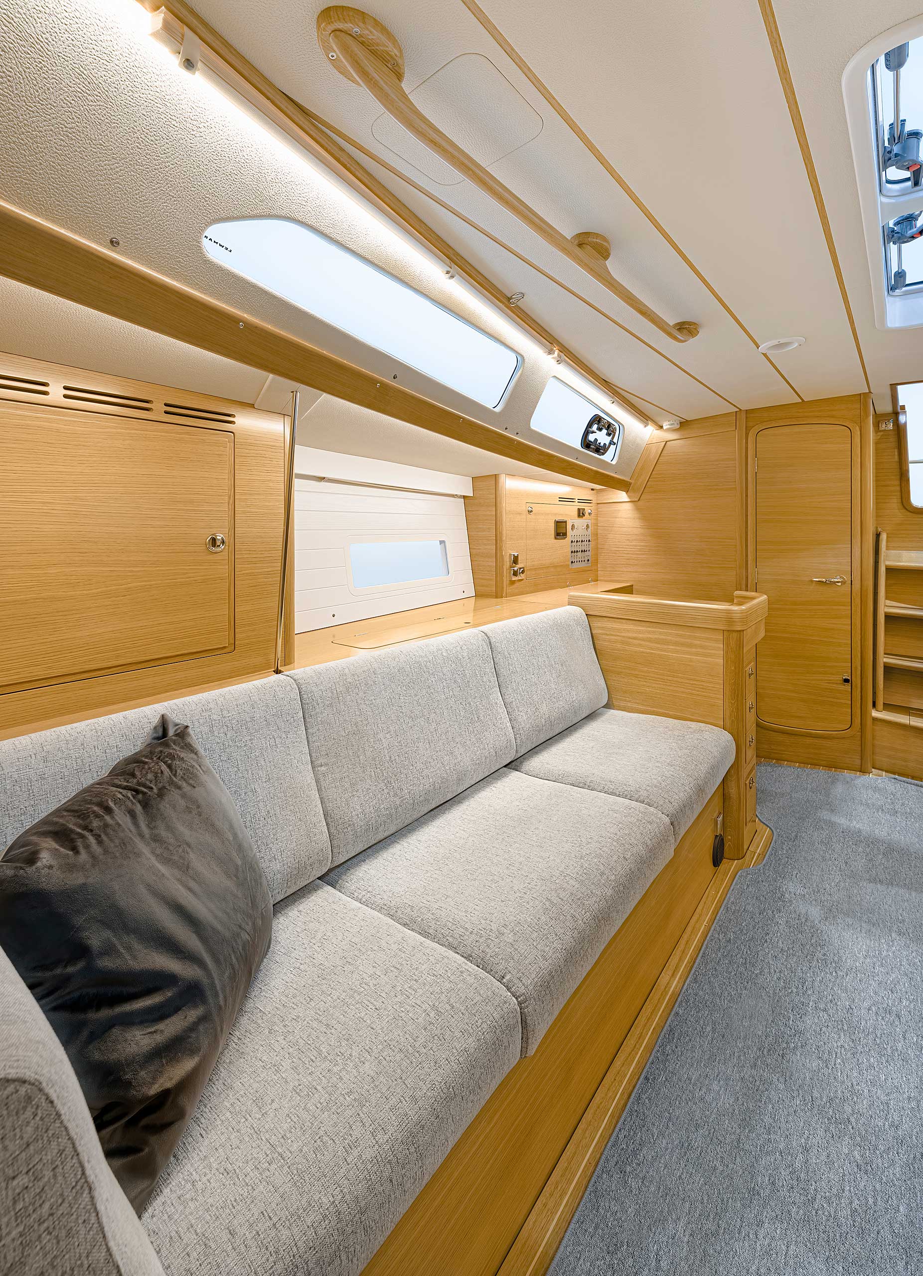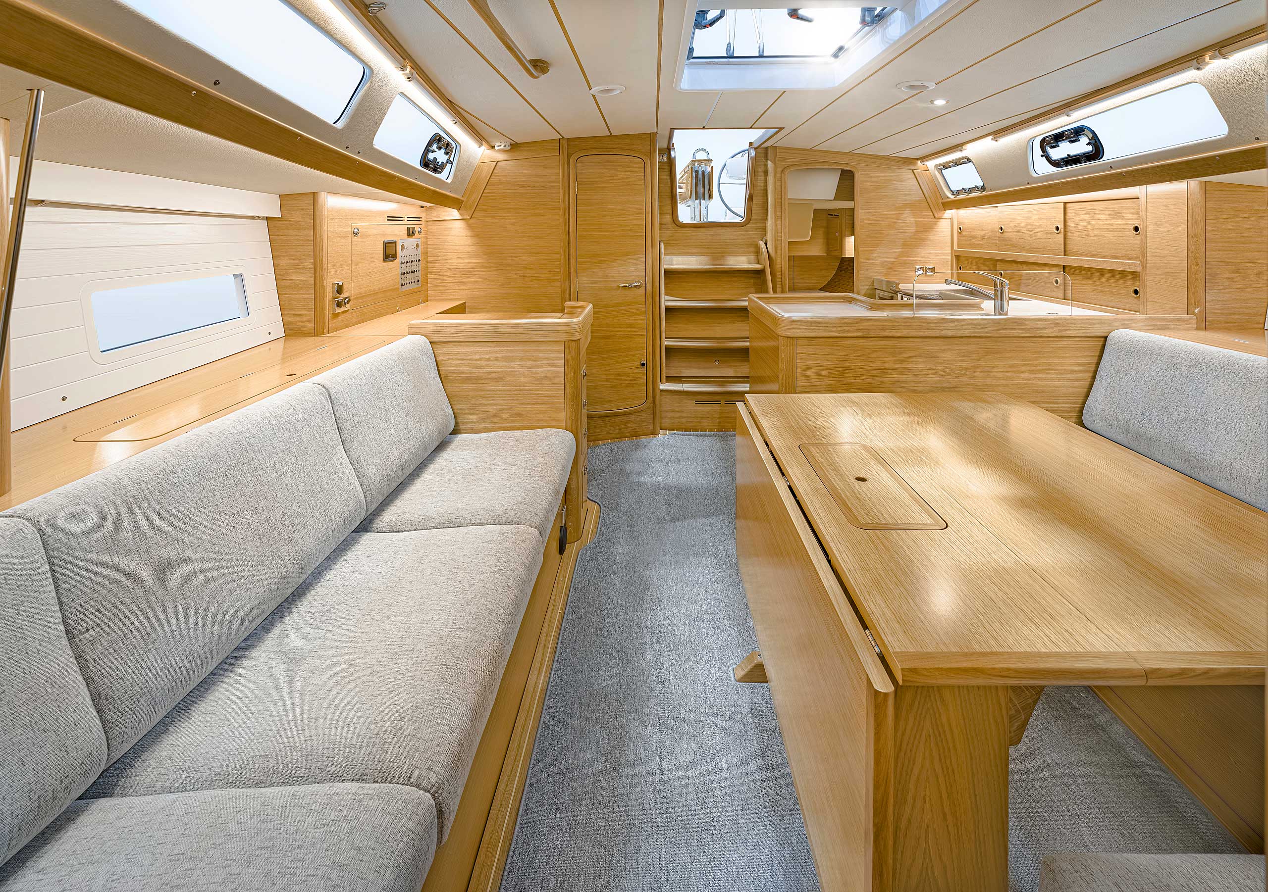 The saloon is available with L sofa and settees or L sofa and armchairs. For the first time with an aft cockpit Hallberg-Rassy, the washboard for the entrance is available with gas springs. If there is a single aft cabin, the starboard side settee is extra long. There is either a single aft cabin with large head with separate shower, or twin aft cabins, still with an aft head.