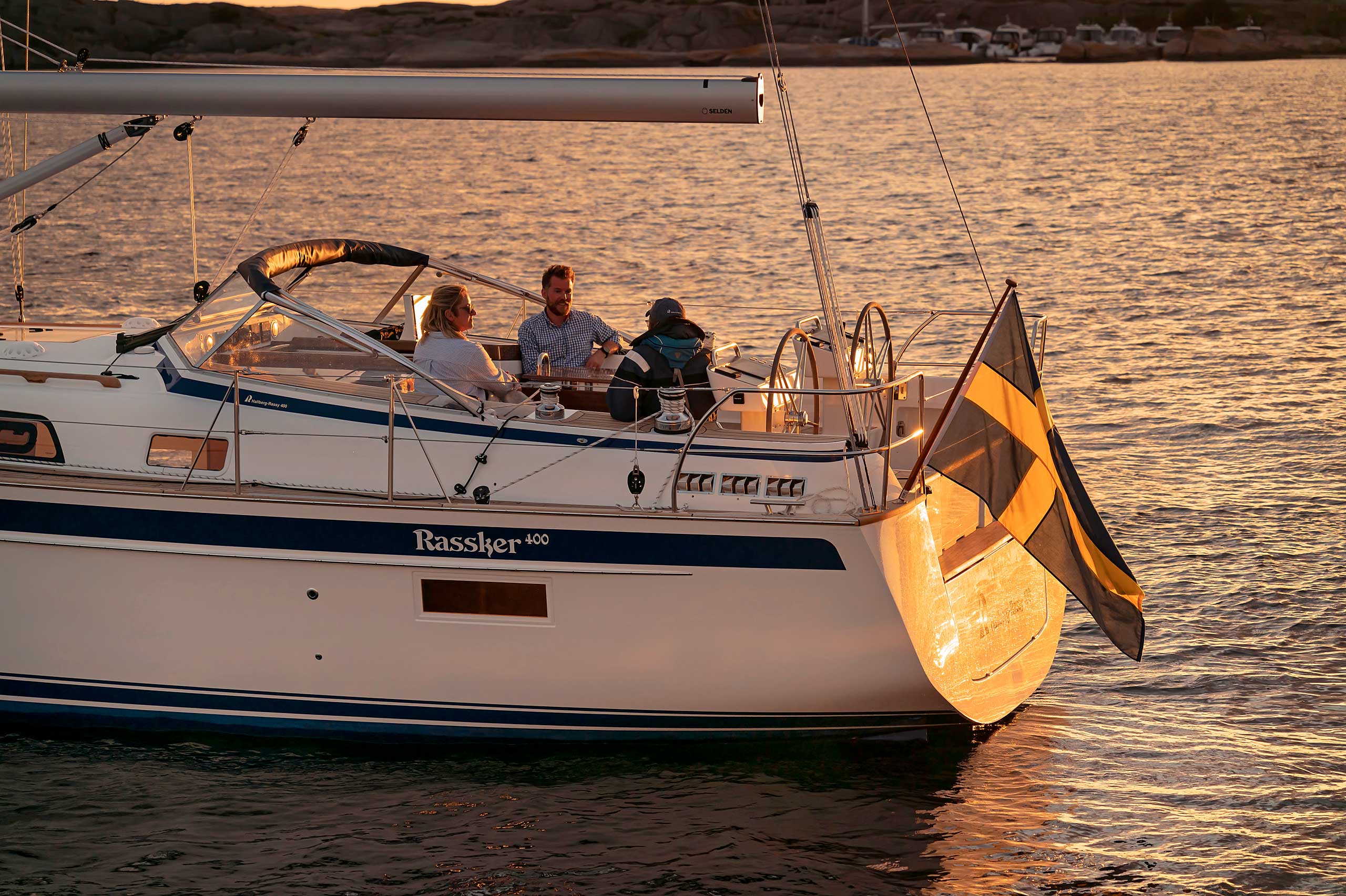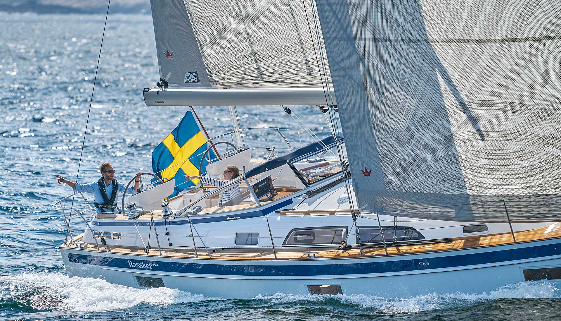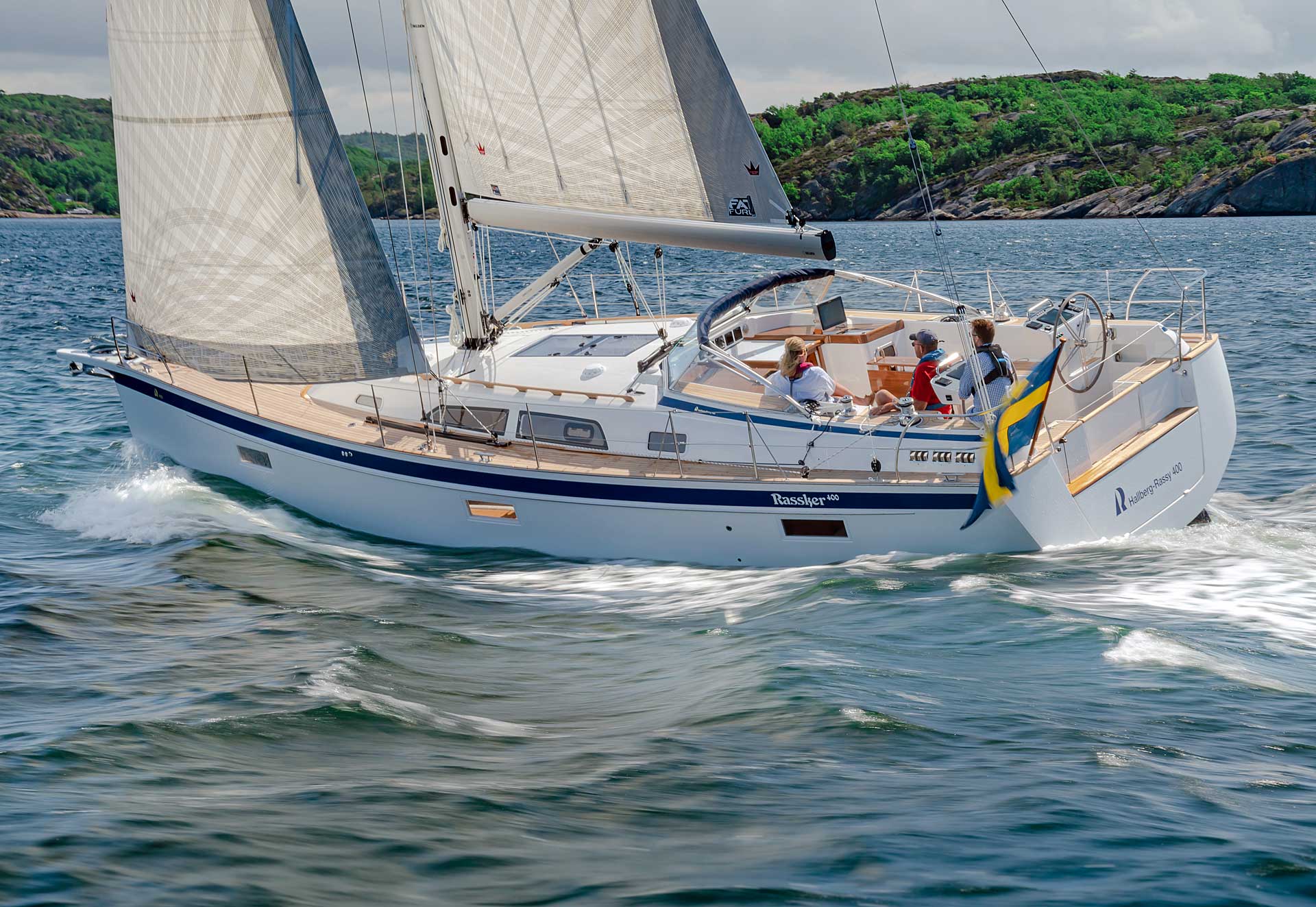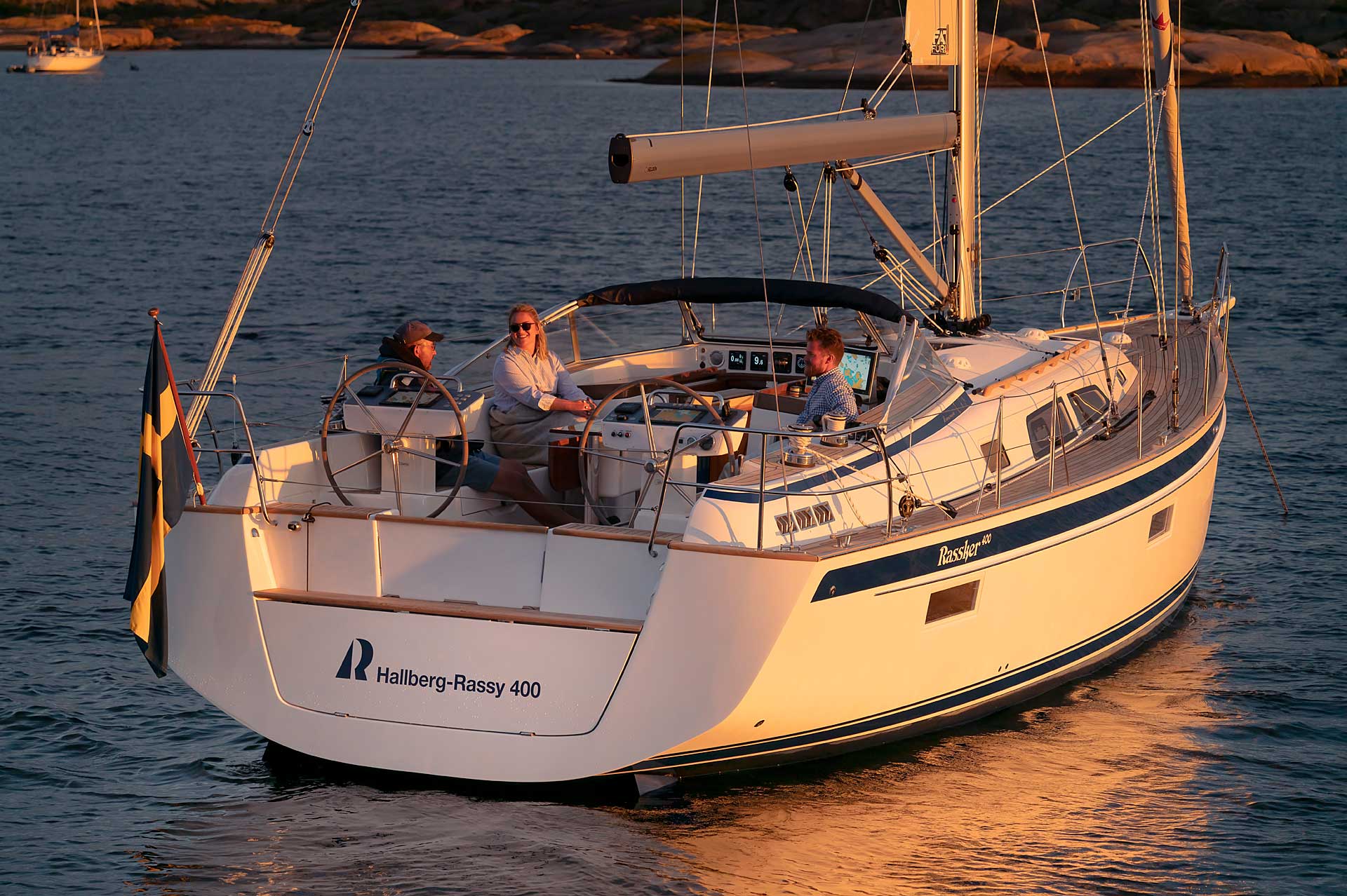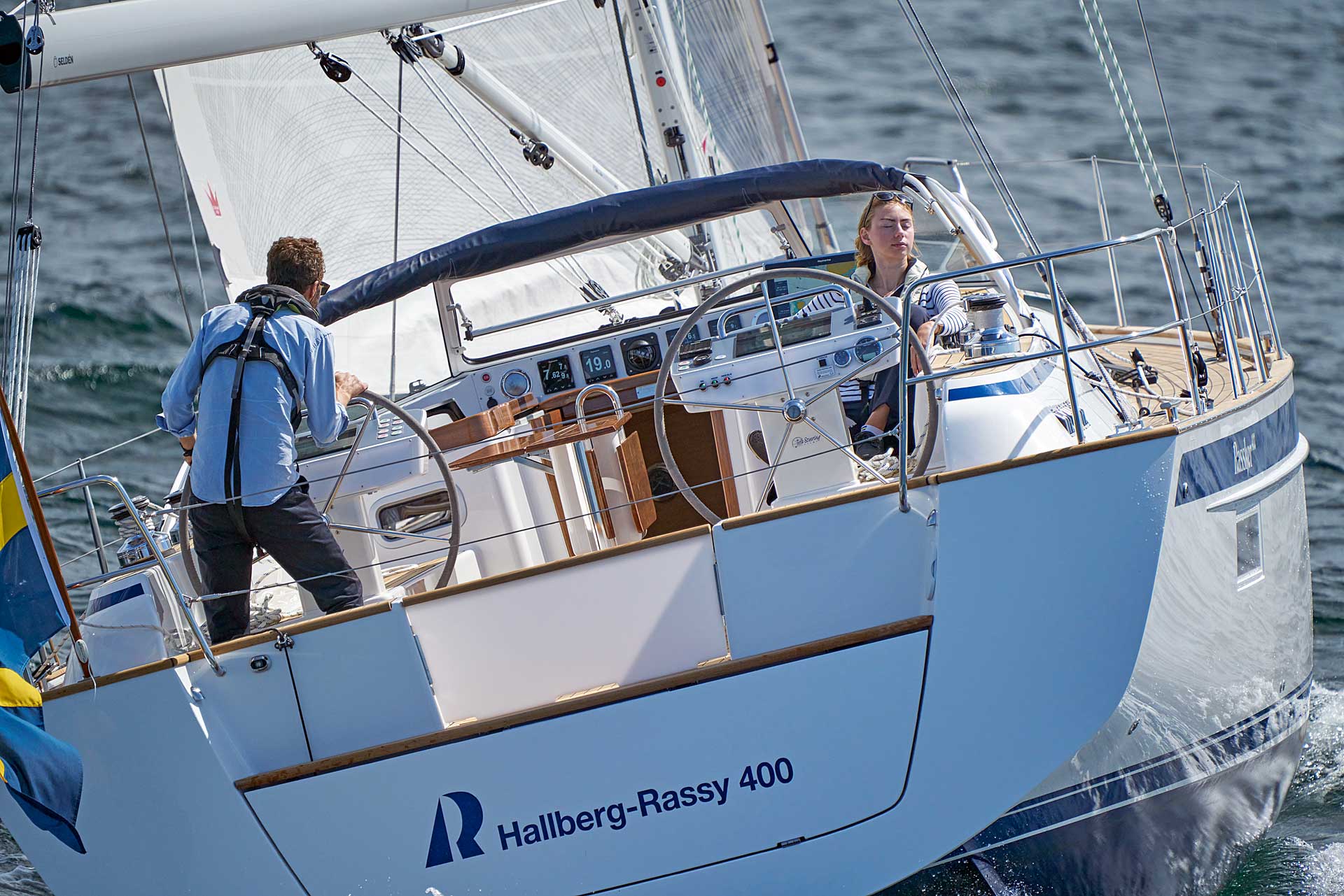 The saloon is available with L sofa and settees or L sofa and armchairs. For the first time with an aft cockpit Hallberg-Rassy, the washboard for the entrance is available with gas springs. If there is a single aft cabin, the starboard side settee is extra long. There is either a single aft cabin with large head with separate shower, or twin aft cabins, still with an aft head.