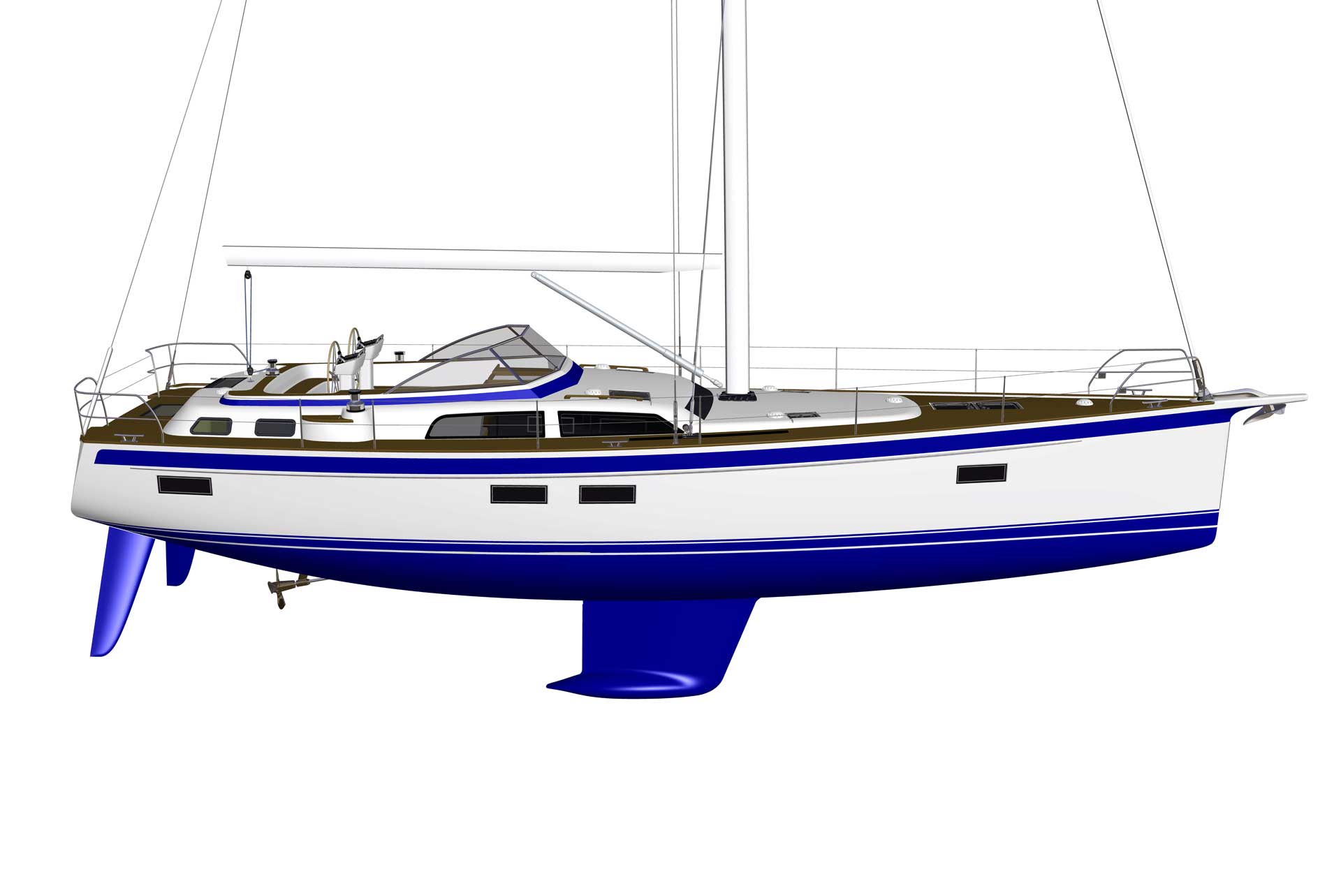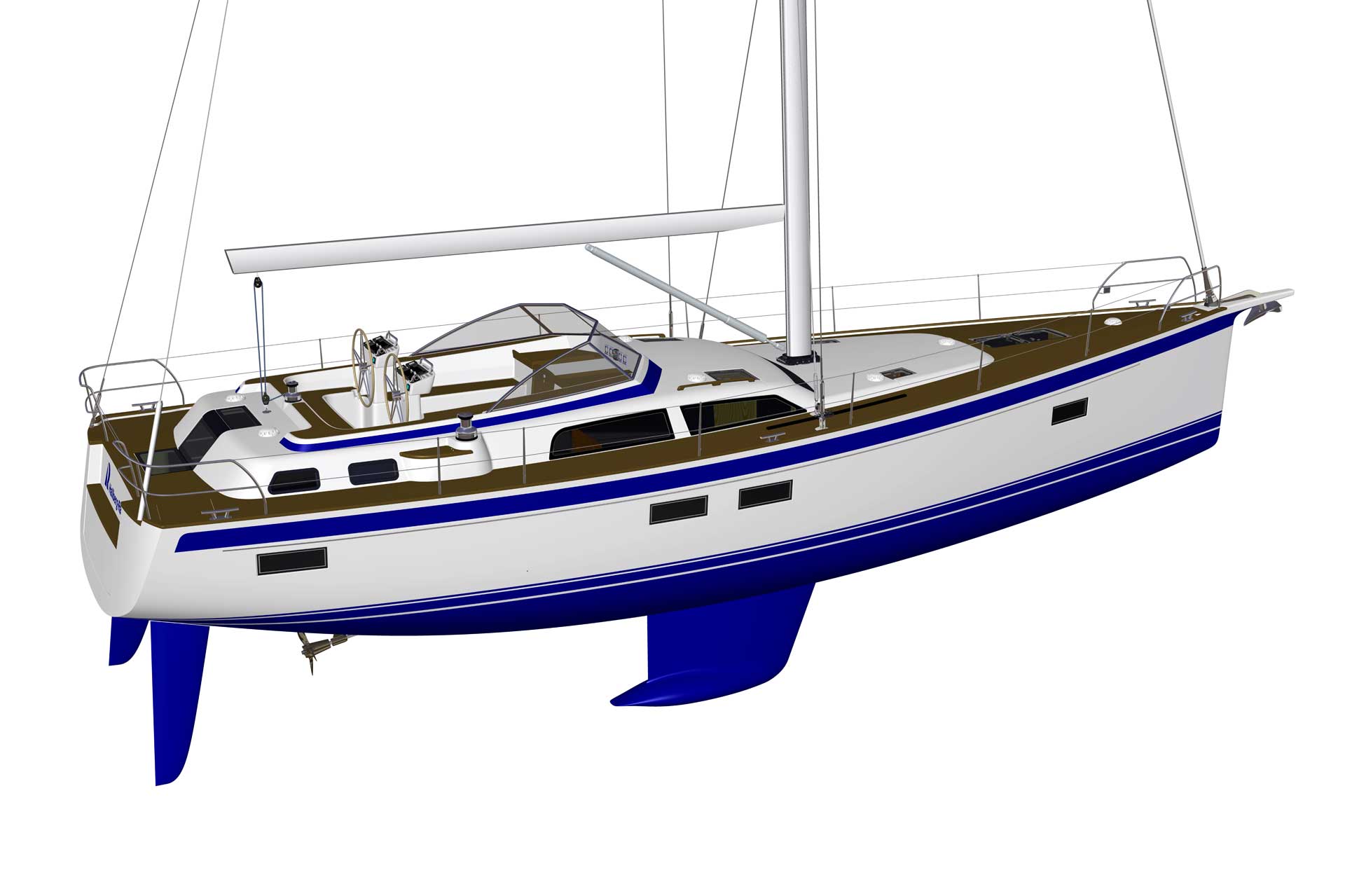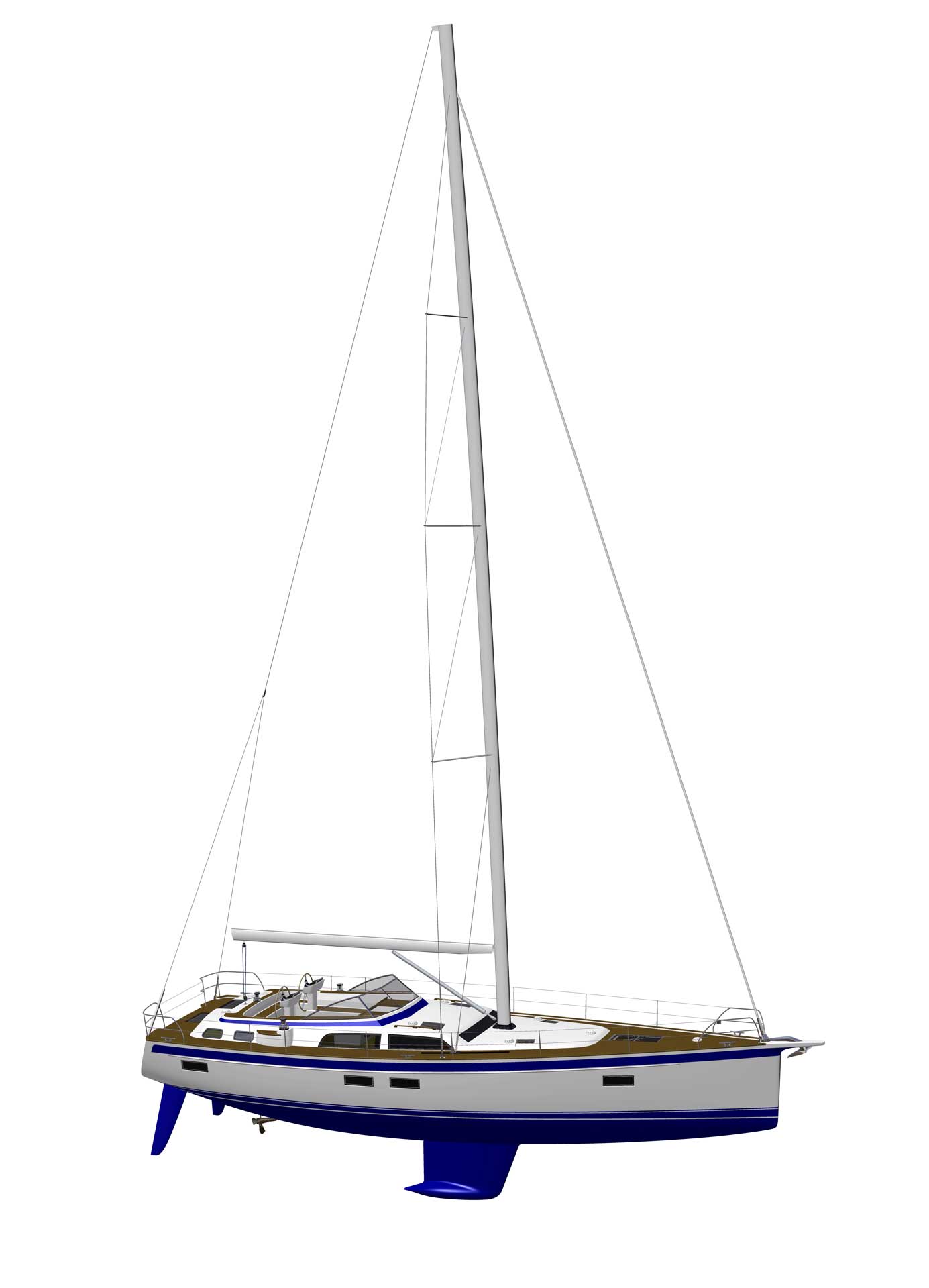 The modern and most efficient hull shape gives superior sailing performance. At the same time, the forward under water part of the hull is rounded, almost like an egg, and this means soft motion in a seaway at any angle of heel. The displacement of the hull is designed to carry all modern comfort equipment and lots of personal belongings, as well as generous tank capacity.