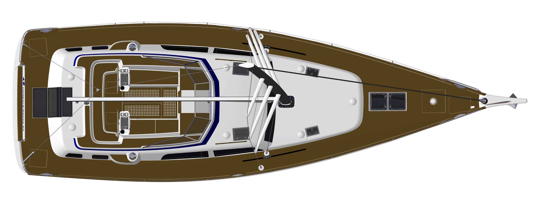 The rig is modern and easy to handle. It is even possible to fly an inner removable heavy weather sail with no runners. The foresail is only slightly overlapping, making tacking easy. There is also an option for a self tacking jib arrangement. Seldén electric furling for both in-mast and headsail, as well as electric sheet winches are fitted as standard. The main is designed to carry an Elvström FatFurl modern in-mast furling sail with Epex membrane, with roach, vertical battens and headboard. The top shrouds and lowers are to separate chain plates, a Hallberg-Rassy invention, which makes passage on deck easy, and arranges for easy sheeting of the headsail. The spreader base gets wide and stable in that way too. The deck plan is clean and uncluttered.