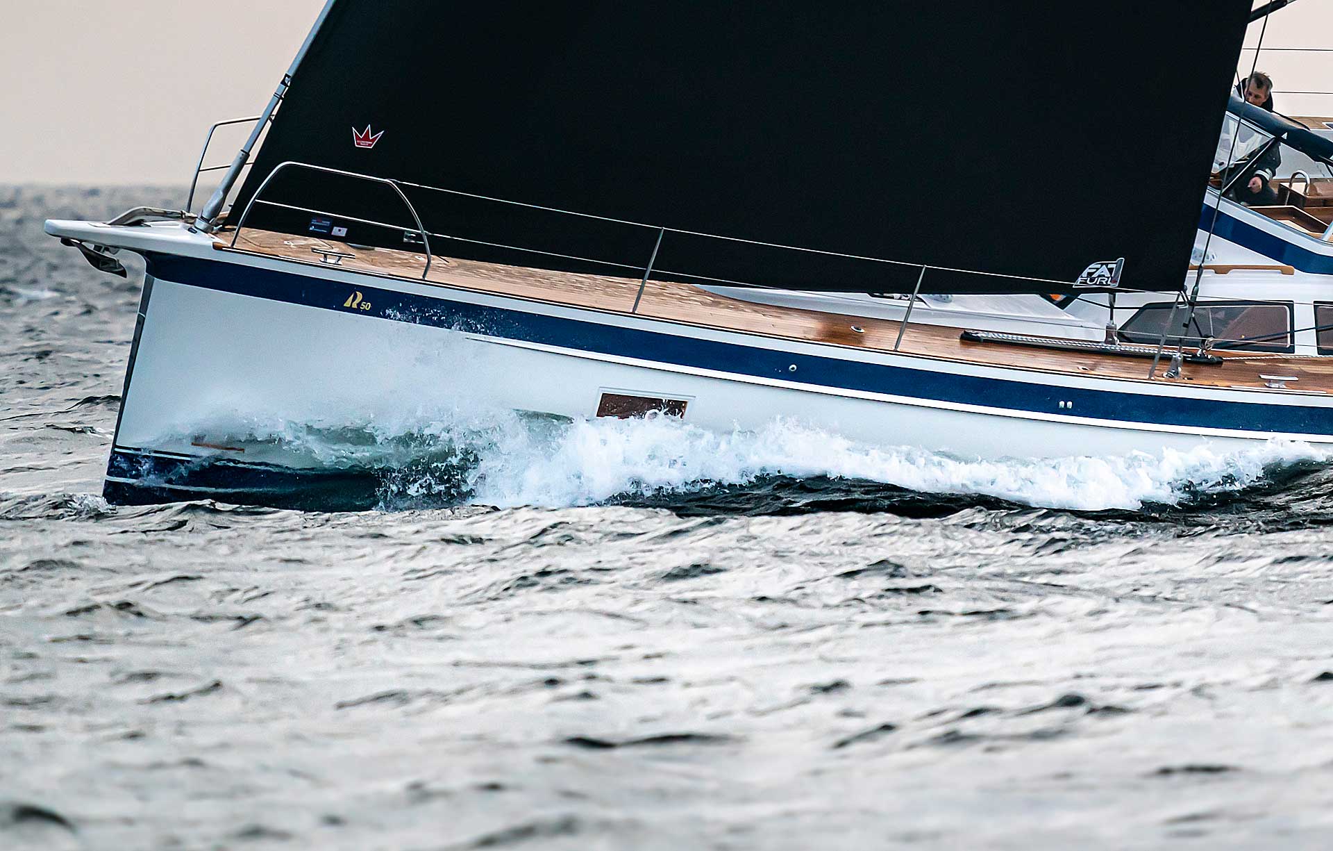 Traditionally we are used to comparing boats with hull length in feet. But much more relevant is the waterline length. The new 50 has a waterline that is as much as 50 cm / 1’ 8’’ longer than on the Hallberg-Rassy 55. Longer waterline gives better sailing performance with longer average day runs and at the same time more interior volume, comfort and storage under deck. The width is 33 cm larger at the widest point and an incredible 1.08 m wider than the 55 on the transom. That further enhances interior volume and storage.
