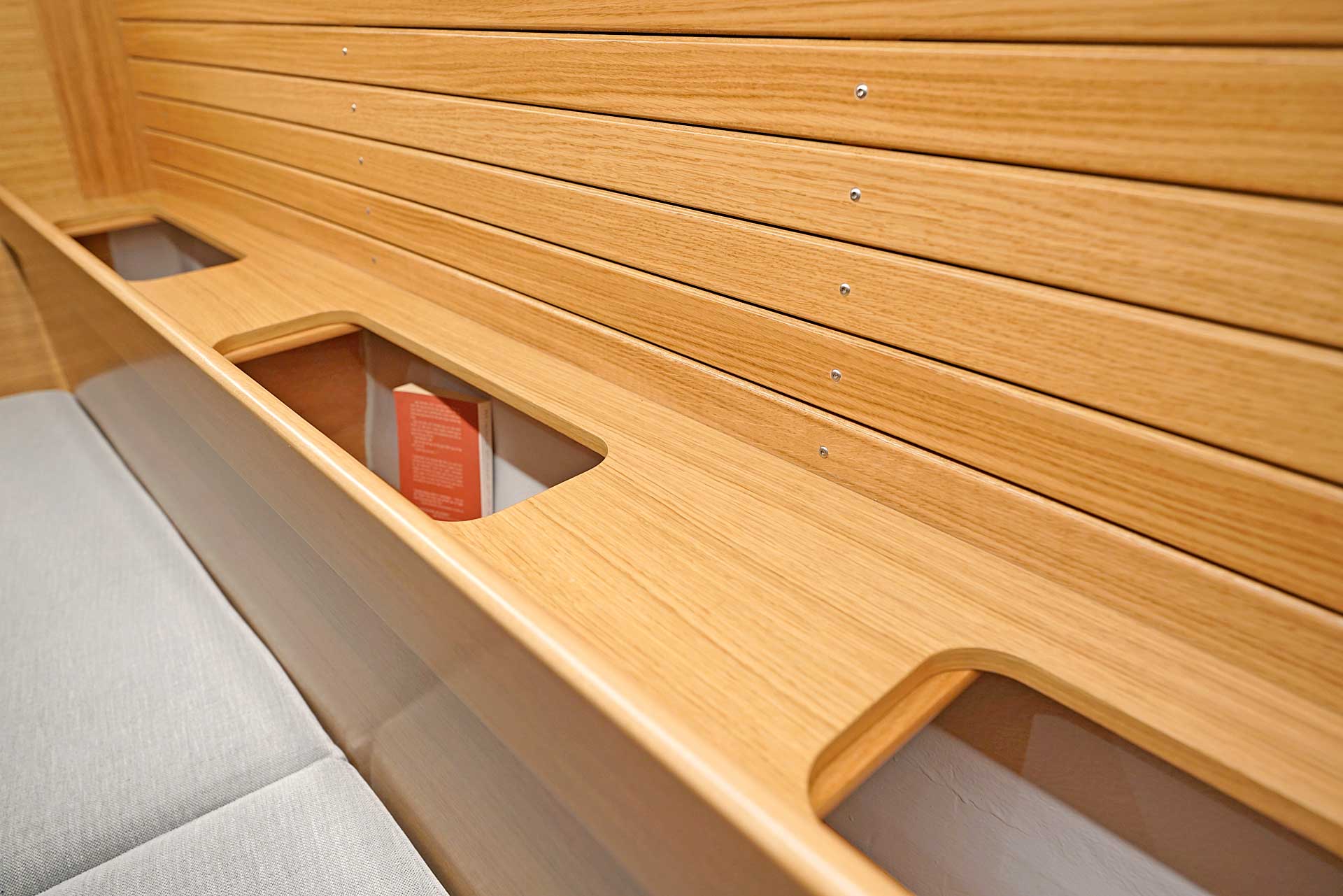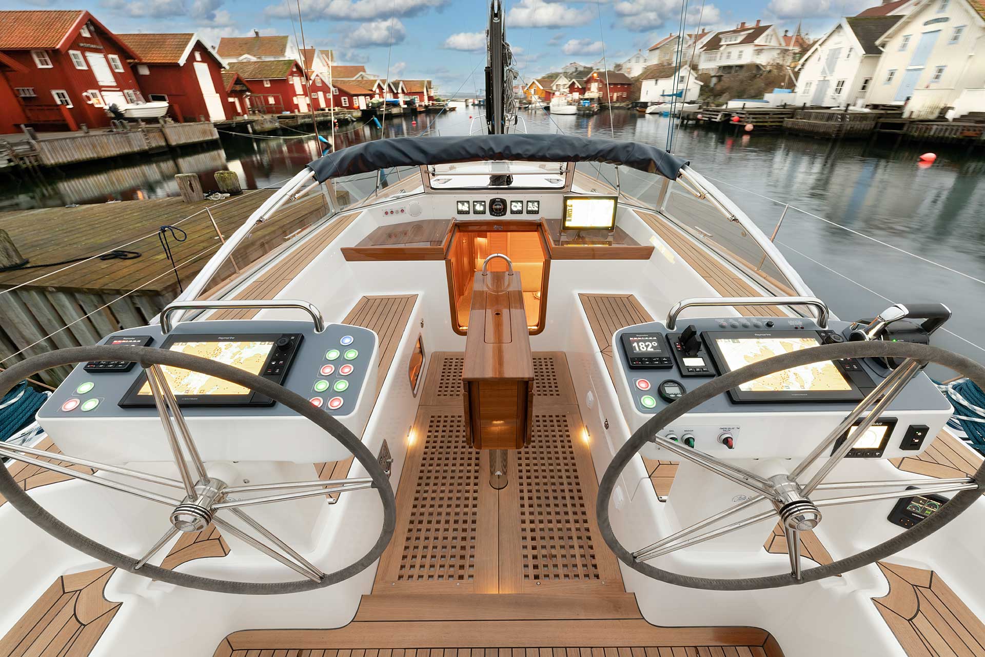 Typical Hallberg-Rassy, the cockpit is very well sheltered with high all-round coamings and a soft top or hard top windscreen with tempered glass, opening mid section and handholds at the sides. This is the ideal cockpit solution for both hot and cold areas. There is good all-round visibility. With twin wheels, there is both lots of space for displays and buttons and an easy passage from the helm position and forward. Furthermore, the wheel positions give better visibility forward, both when maneuvering in a harbour and to see the tell tails of the headsail. There is an optional big fixed high gloss varnished teak table with drop leaves.