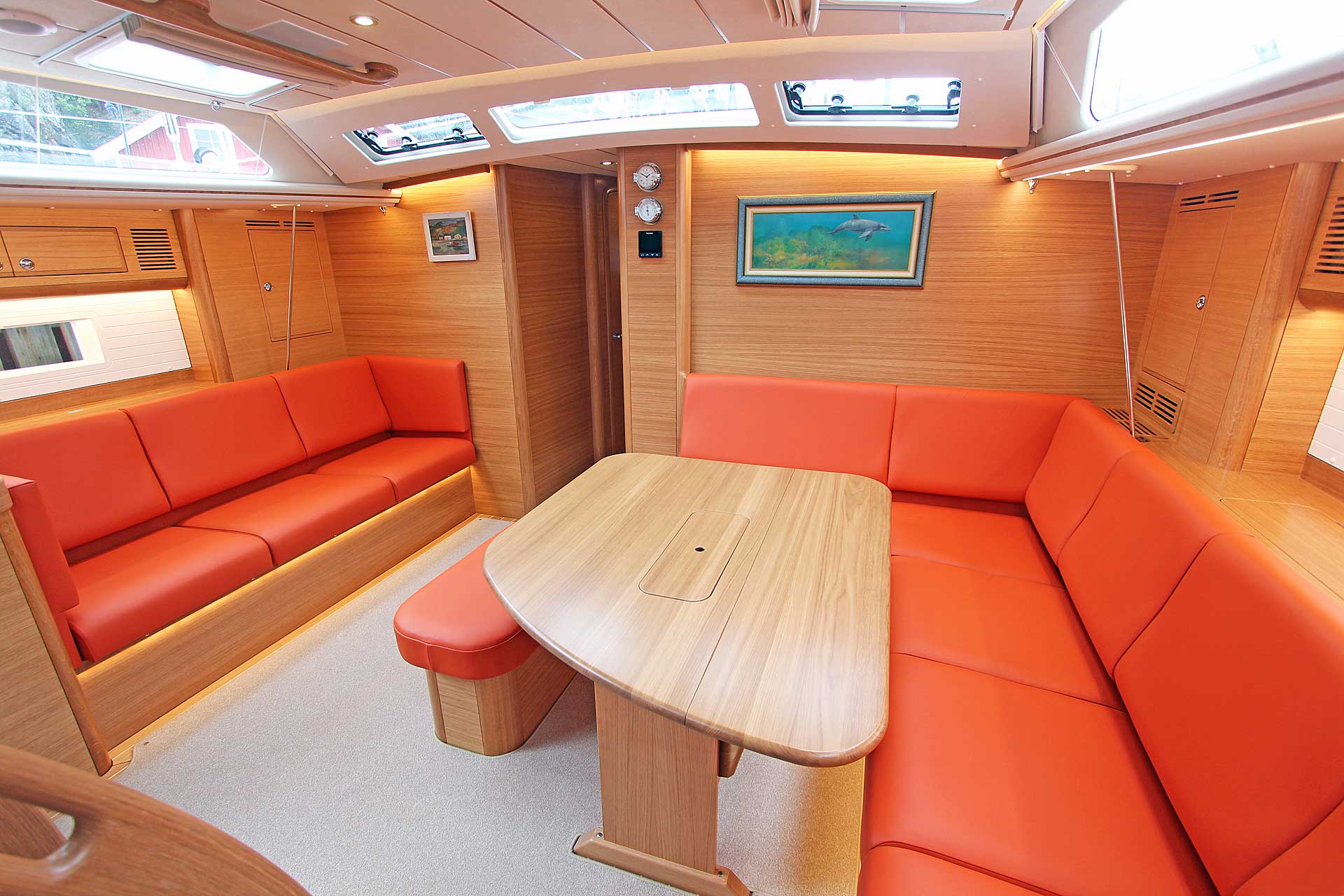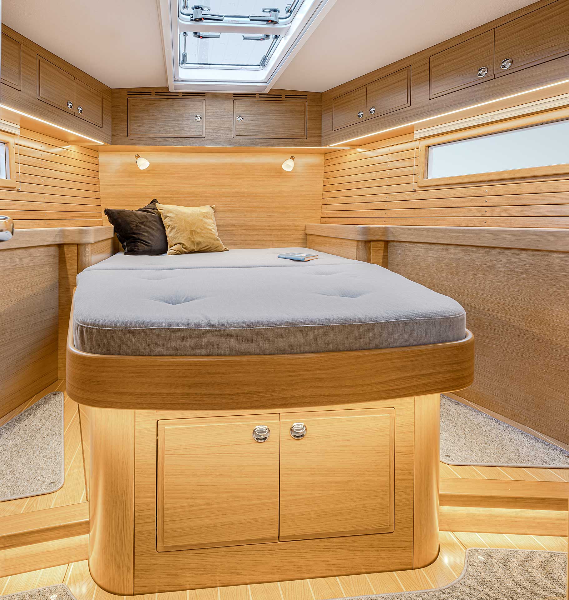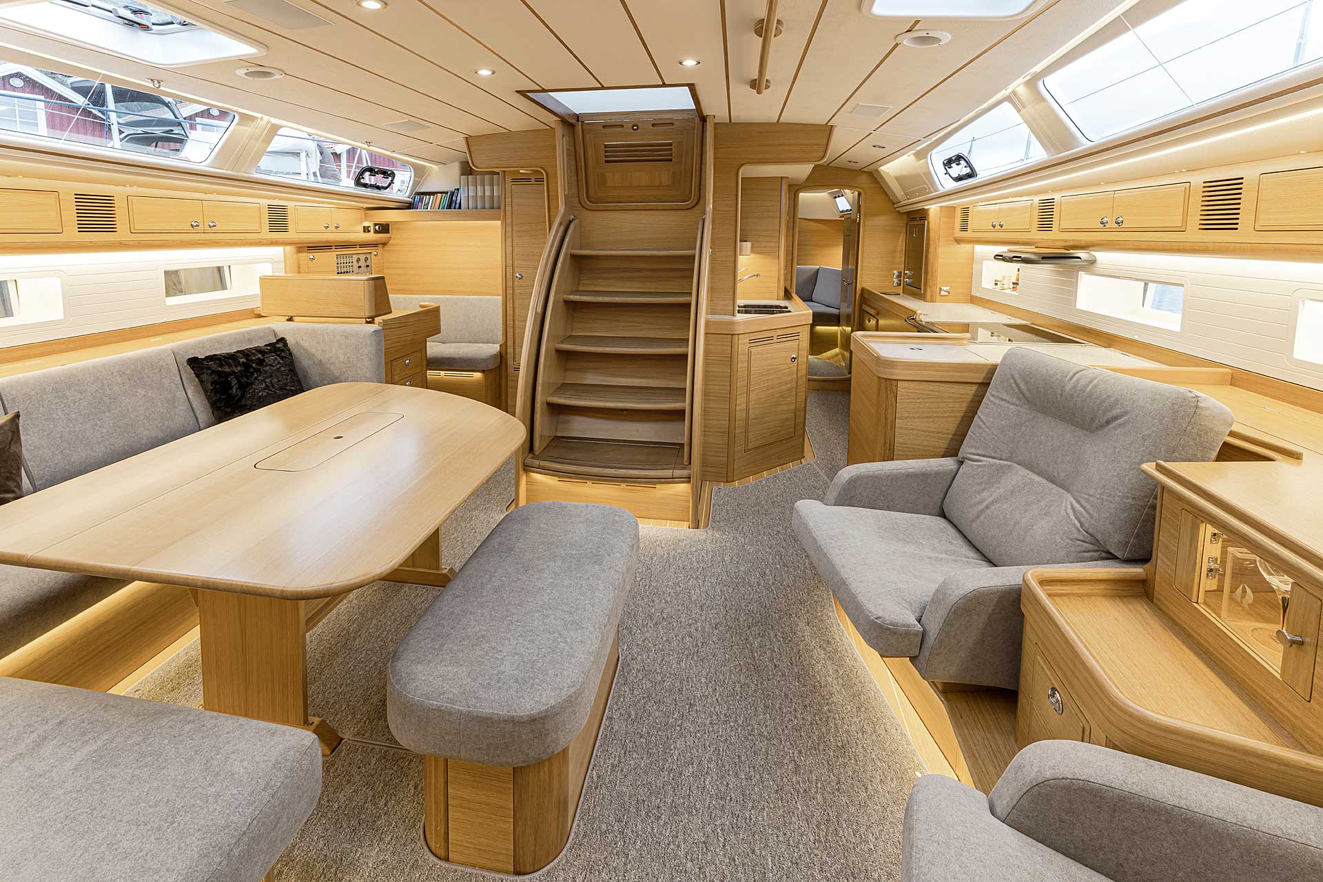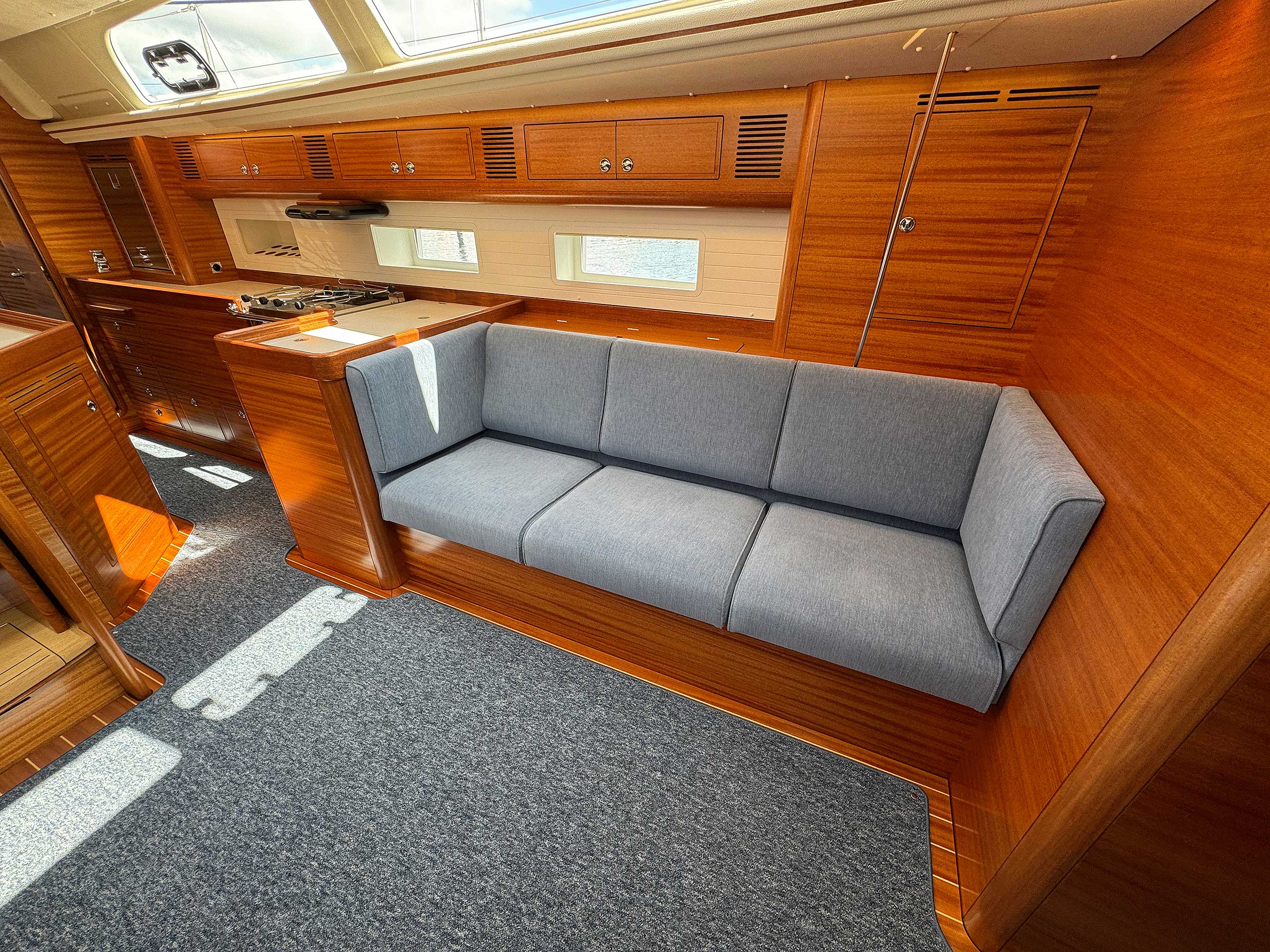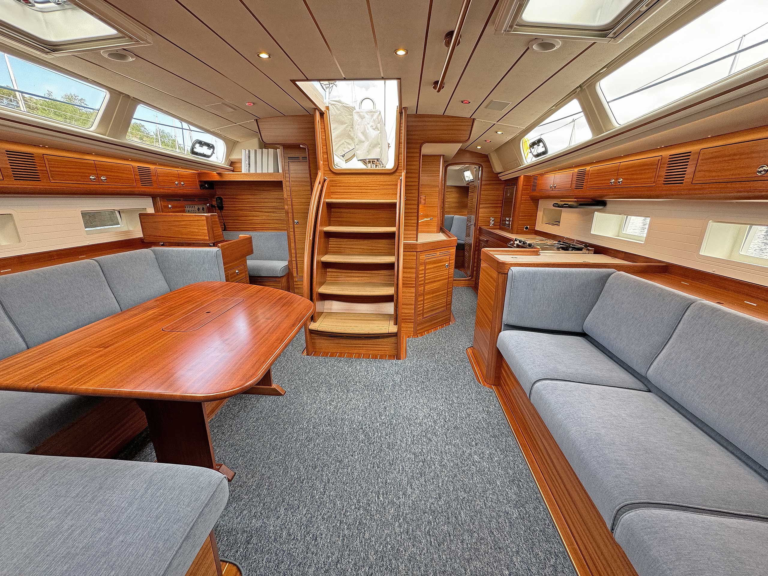 The interior has lots of natural light and indirect led lights as well. There is good ventilation. The layout is generous and roomy, with lots of elbow room. The storage facilities are generous too. The sturdy woodwork has the well renowned Hallberg-Rassy finish.