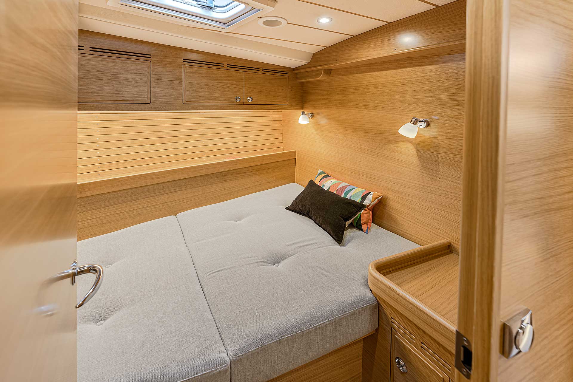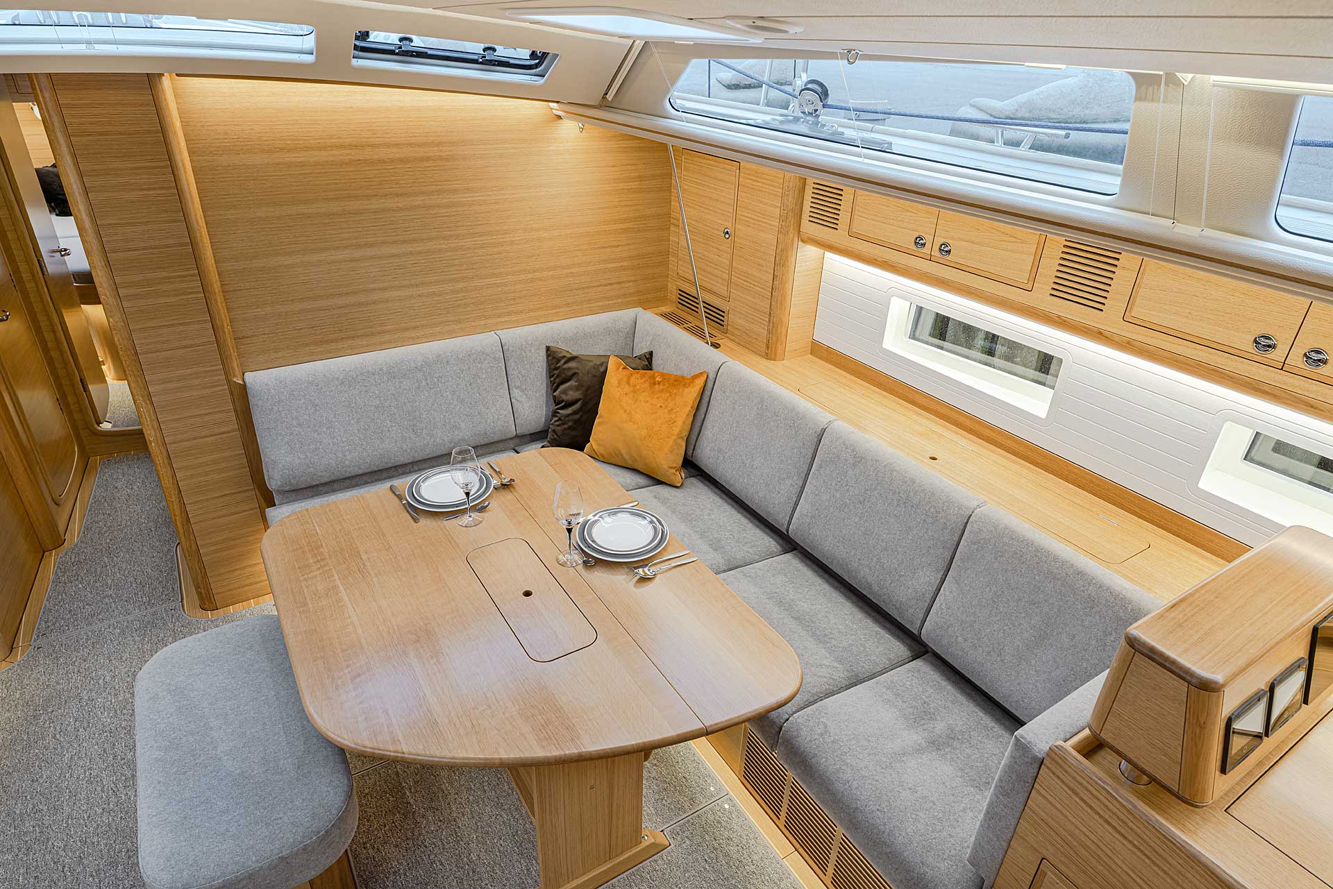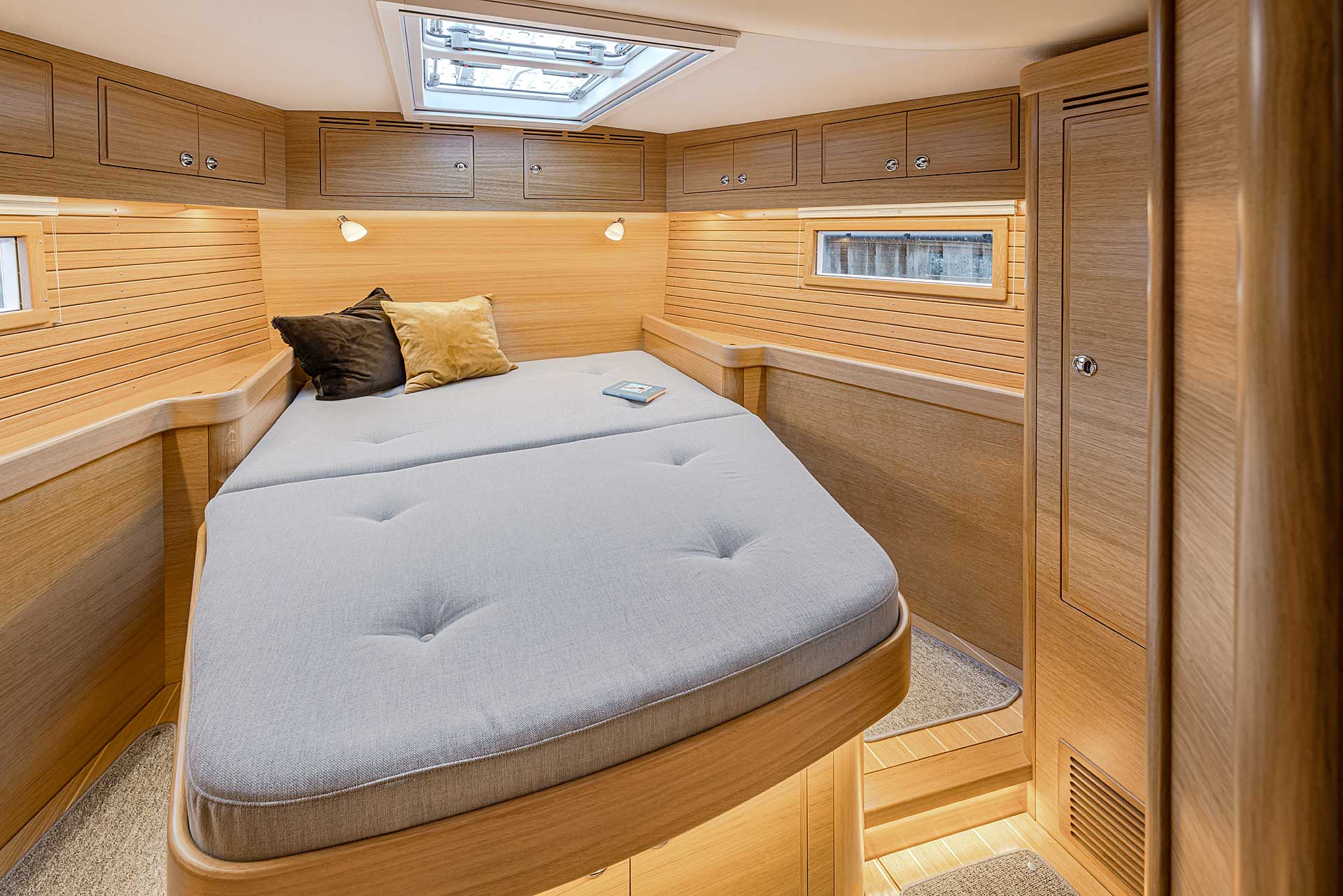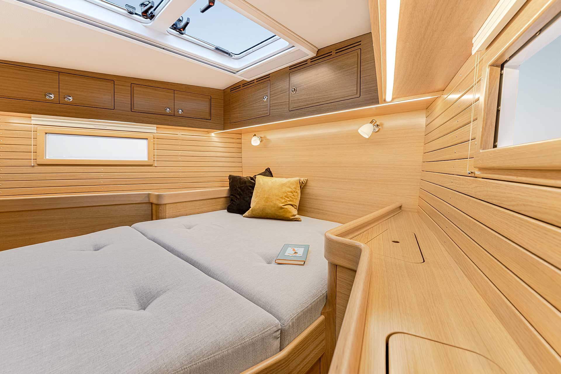 The interior has lots of natural light and indirect led lights as well. There is good ventilation. The layout is generous and roomy, with lots of elbow room. The storage facilities are generous too. The sturdy woodwork has the well renowned Hallberg-Rassy finish.