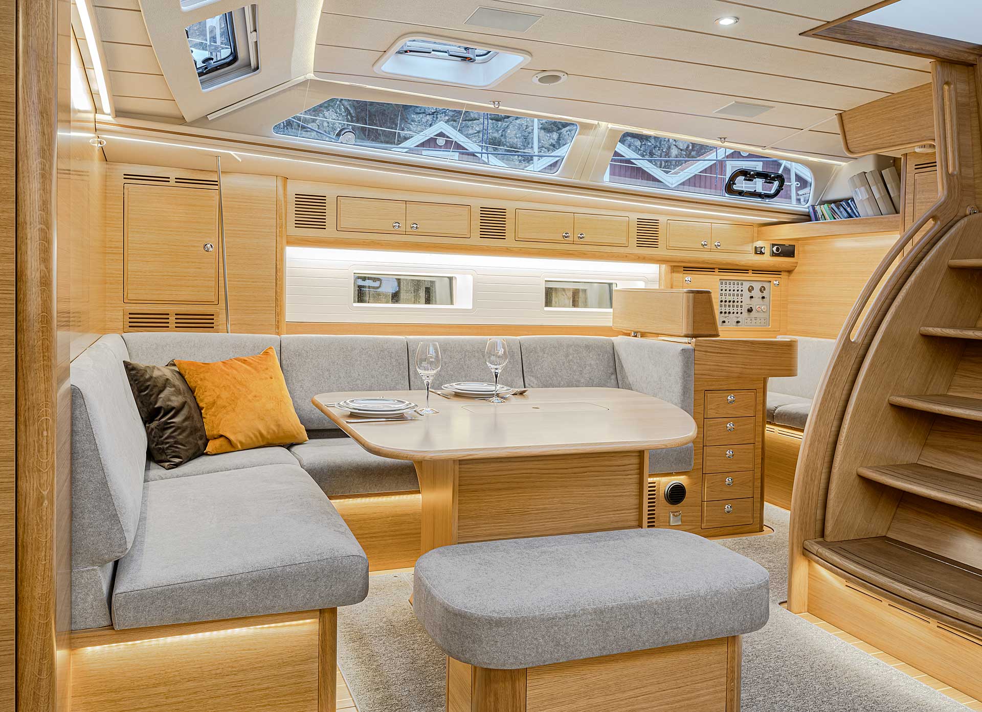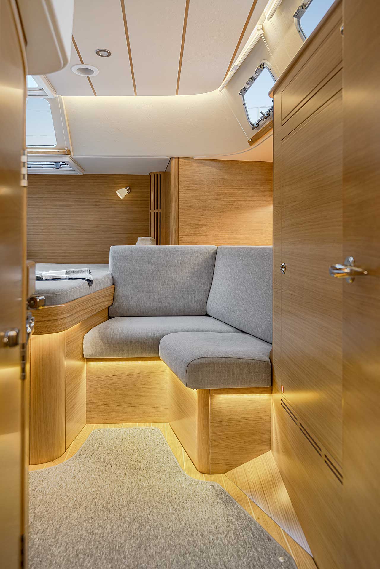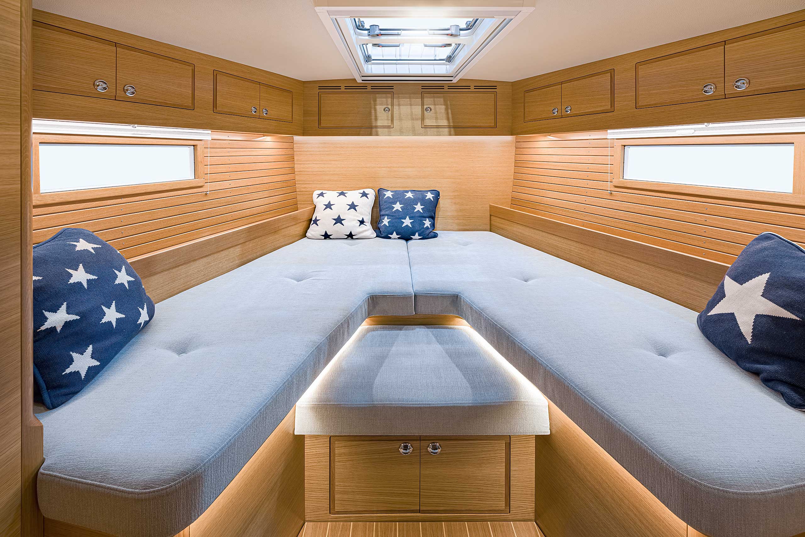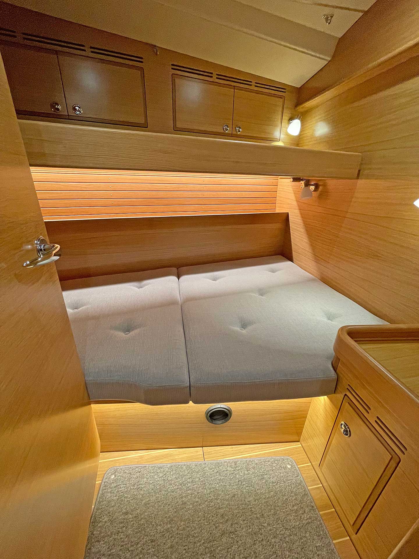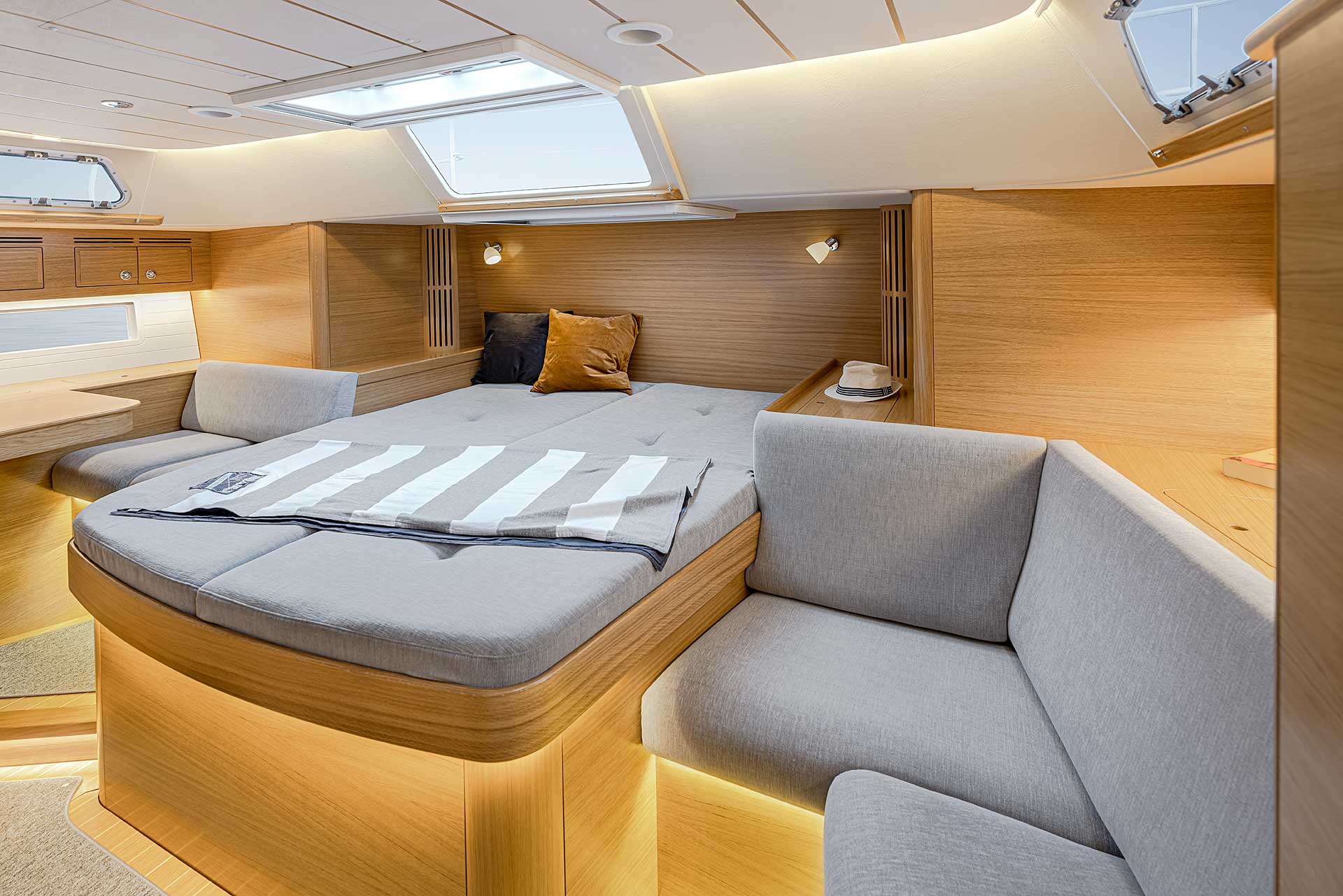 The interior has lots of natural light and indirect led lights as well. There is good ventilation. The layout is generous and roomy, with lots of elbow room. The storage facilities are generous too. The sturdy woodwork has the well renowned Hallberg-Rassy finish.