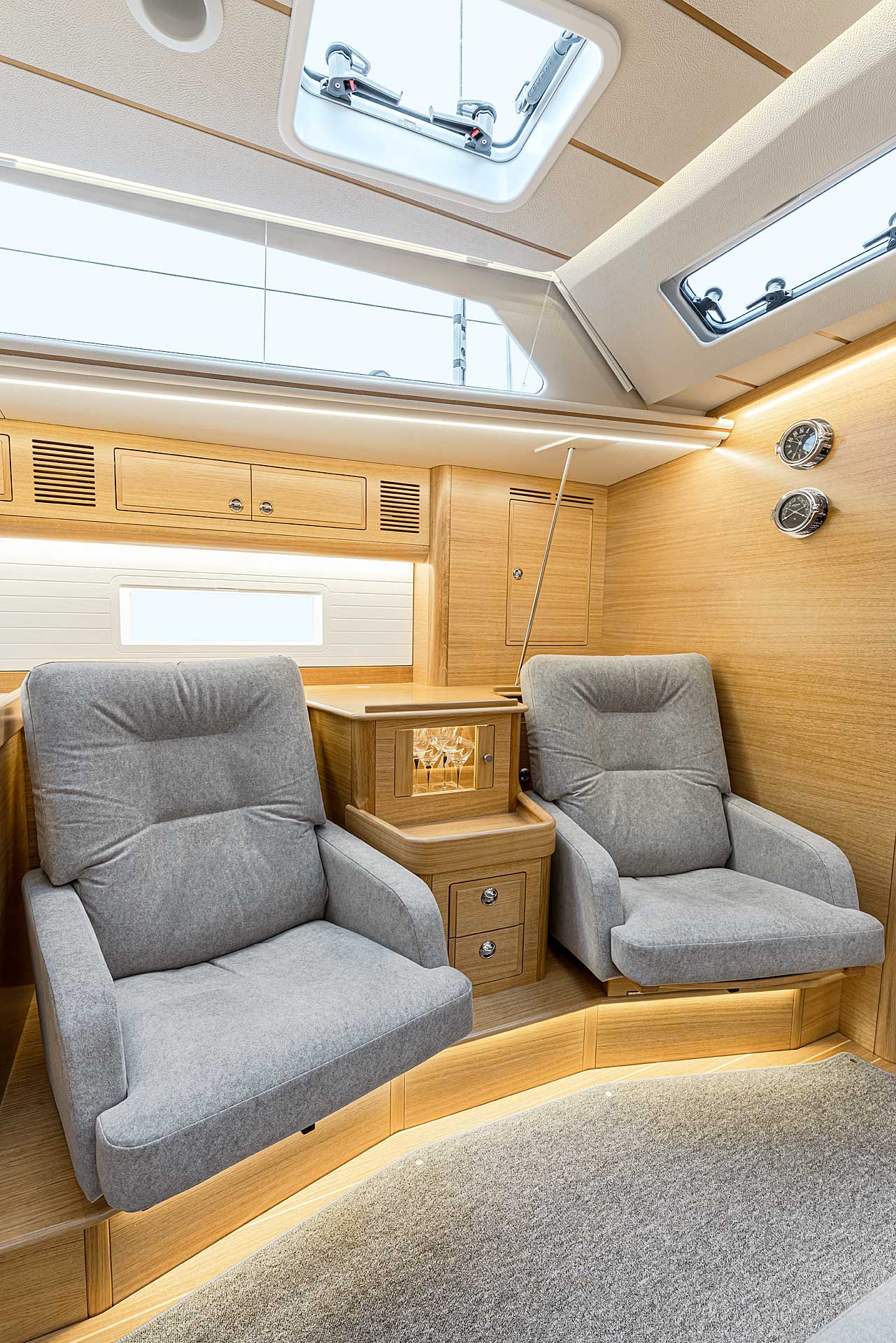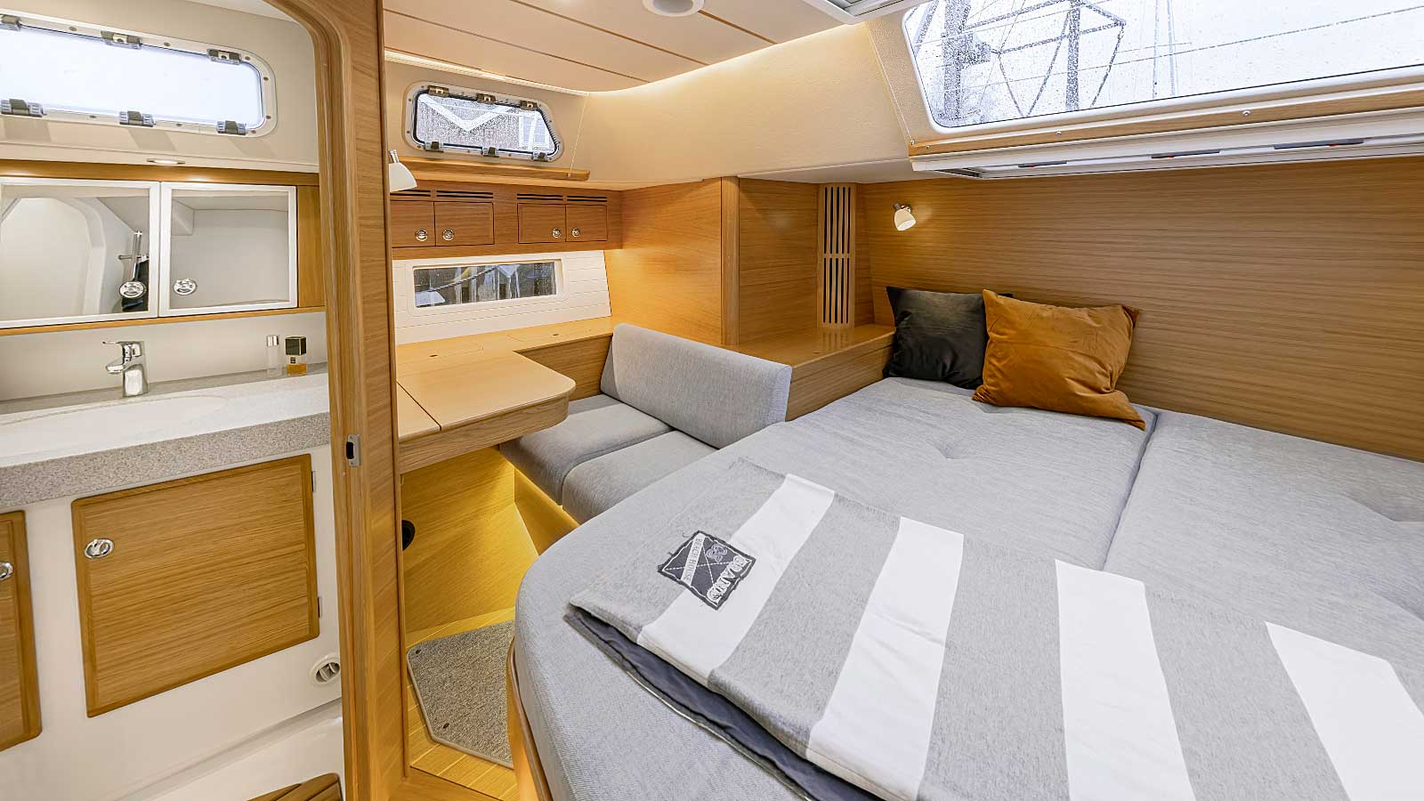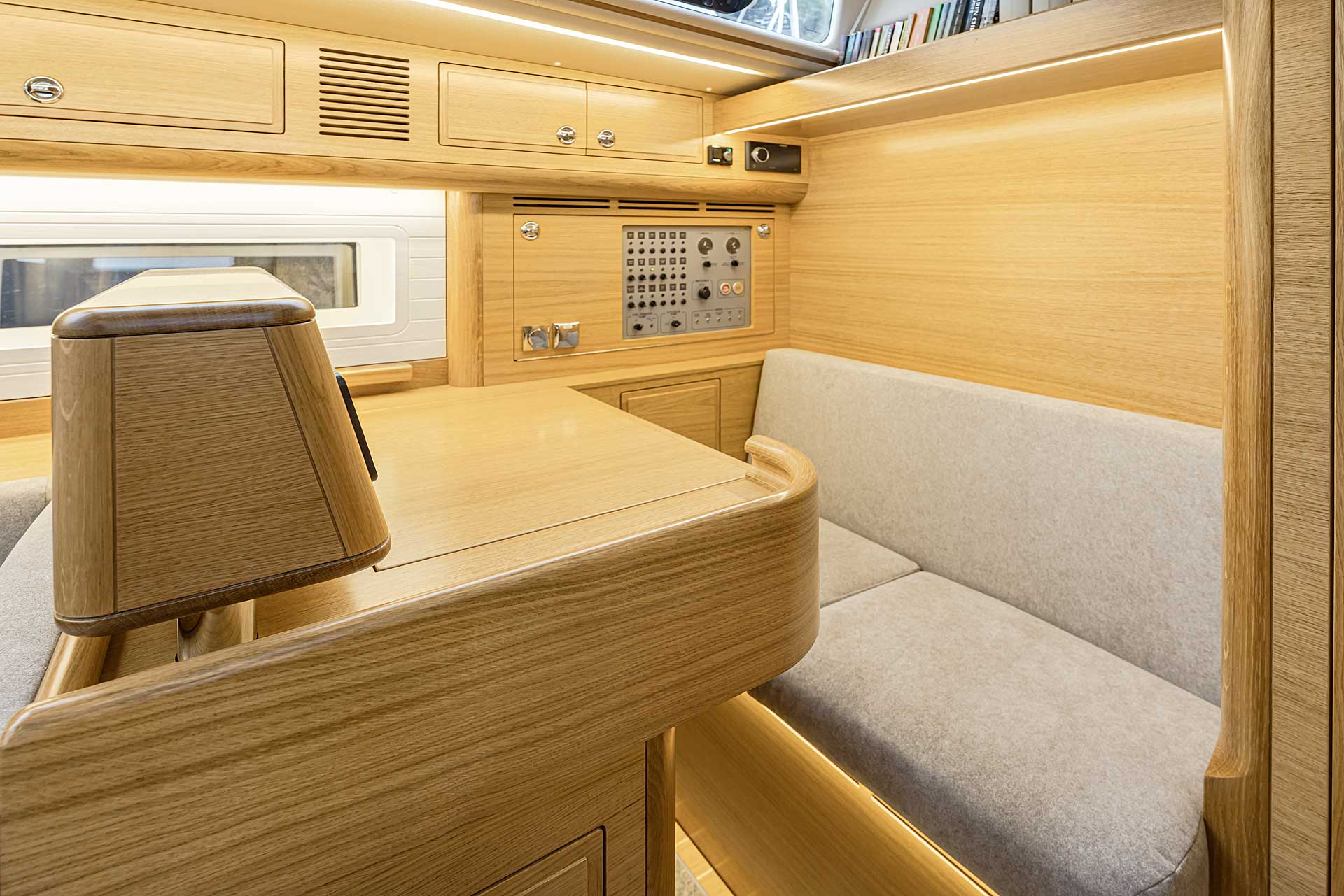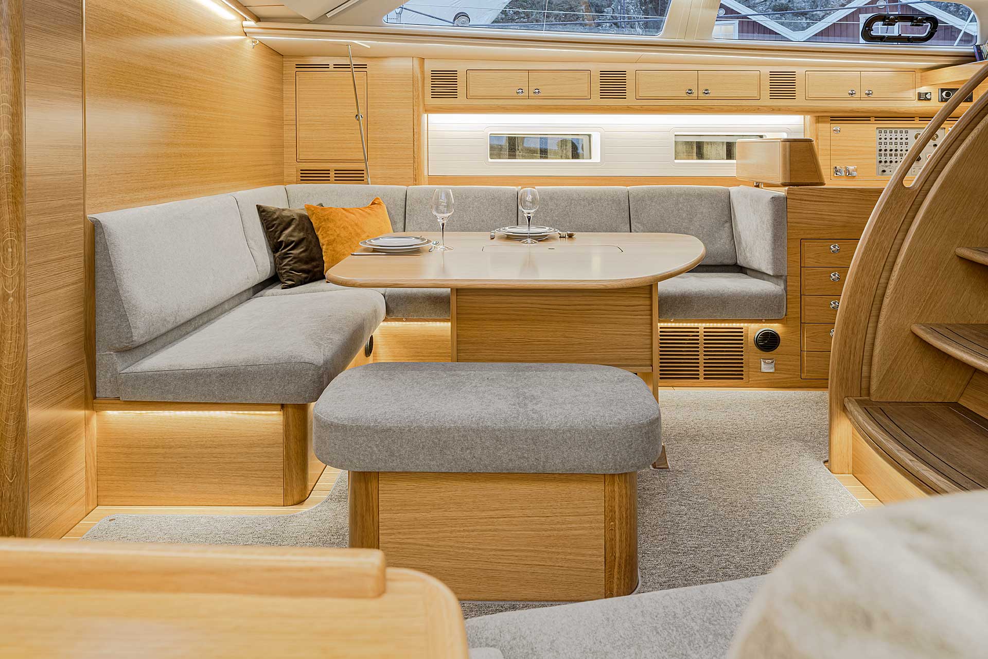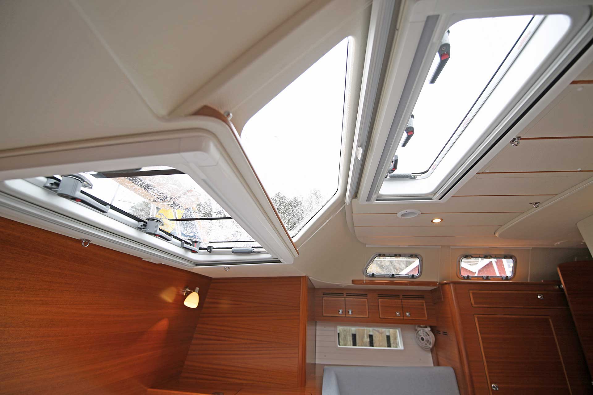 The interior has lots of natural light and indirect led lights as well. There is good ventilation. The layout is generous and roomy, with lots of elbow room. The storage facilities are generous too. The sturdy woodwork has the well renowned Hallberg-Rassy finish.
