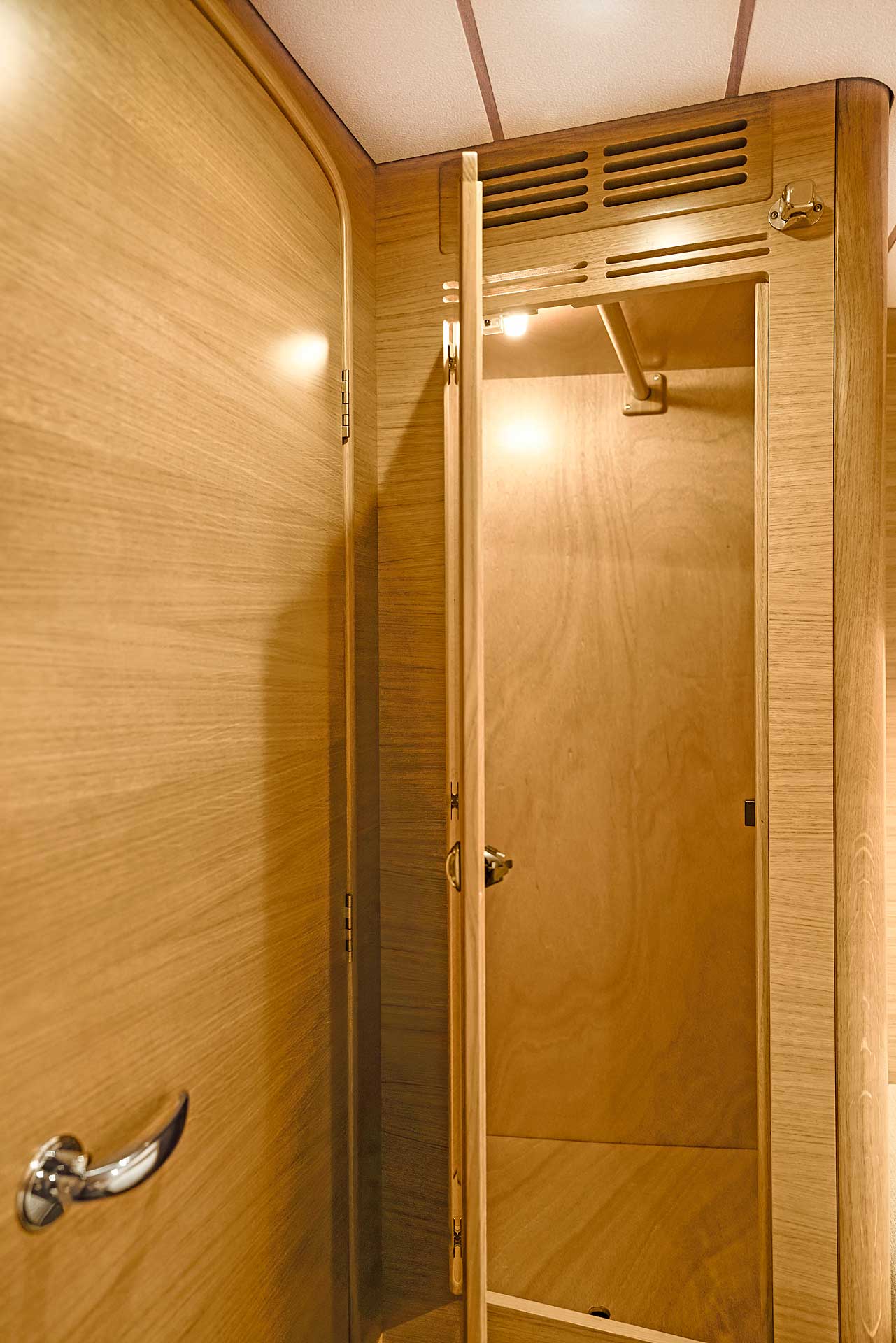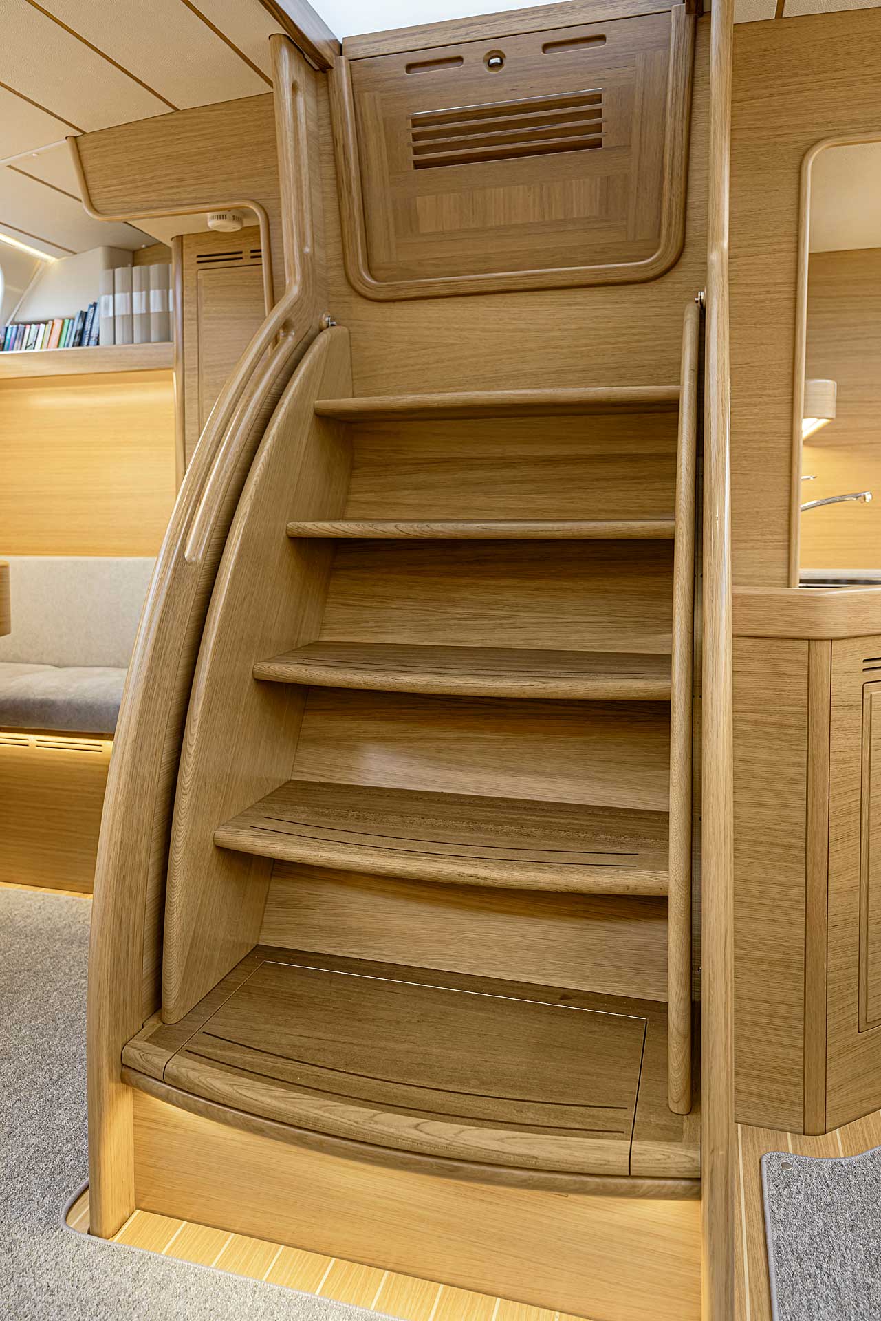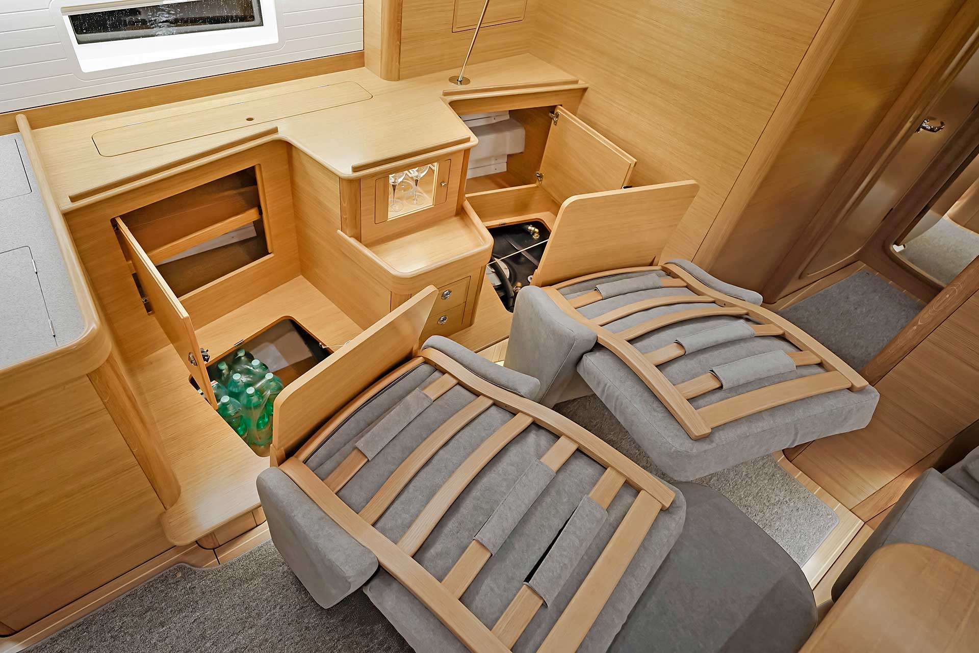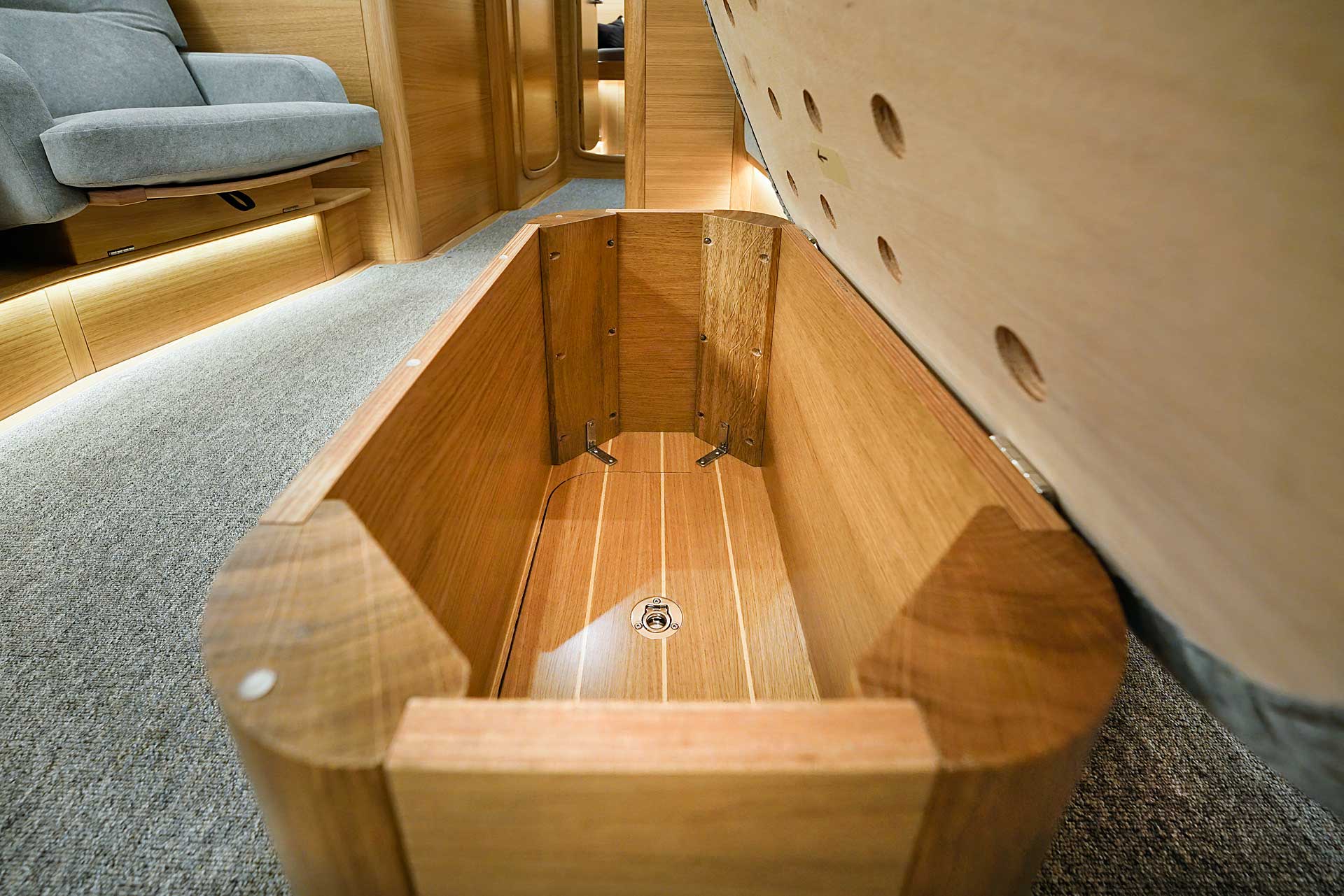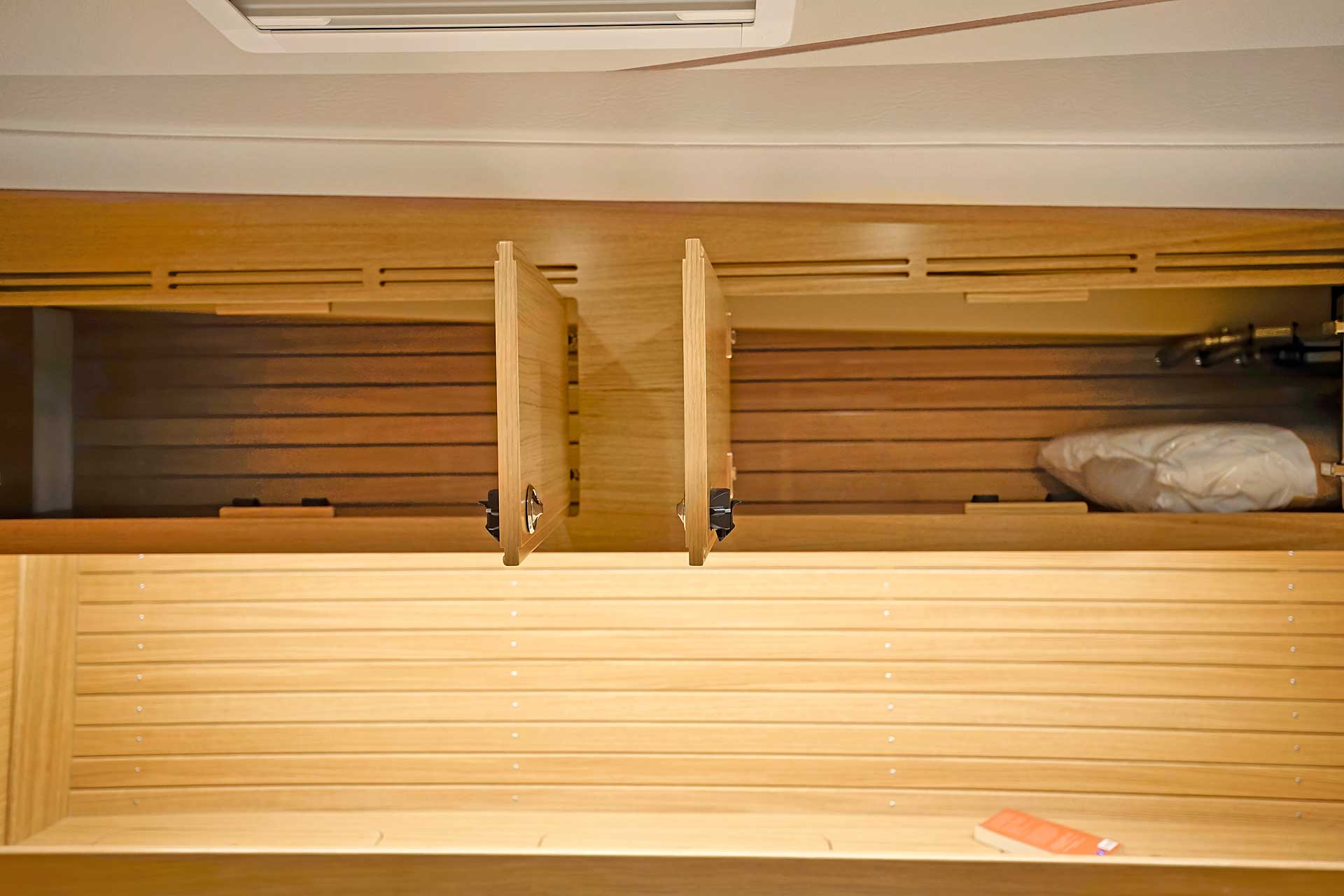 The interior has lots of natural light and indirect led lights as well. There is good ventilation. The layout is generous and roomy, with lots of elbow room. The storage facilities are generous too. The sturdy woodwork has the well renowned Hallberg-Rassy finish.