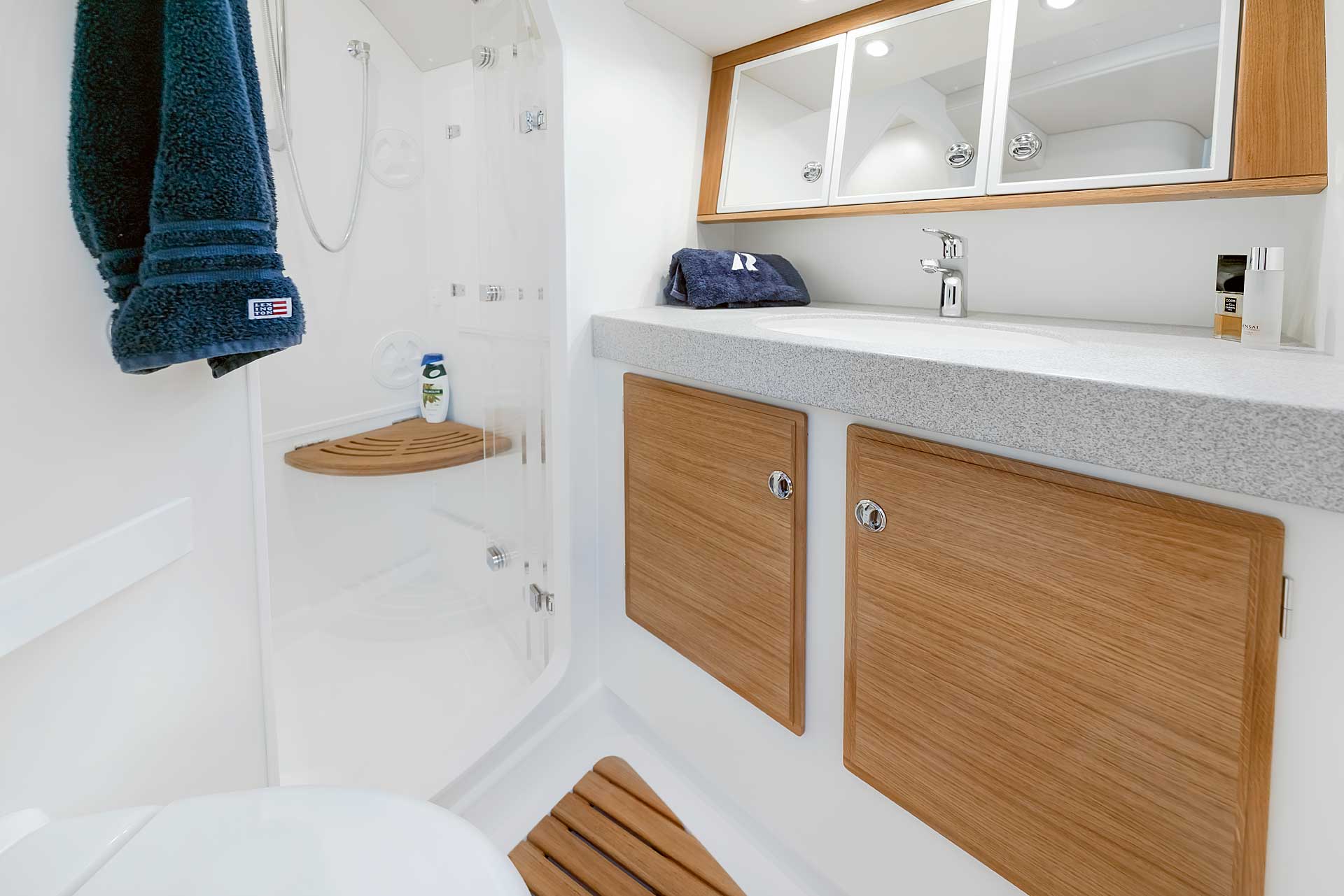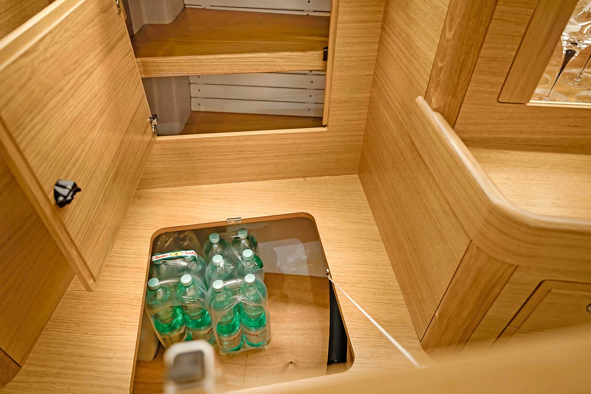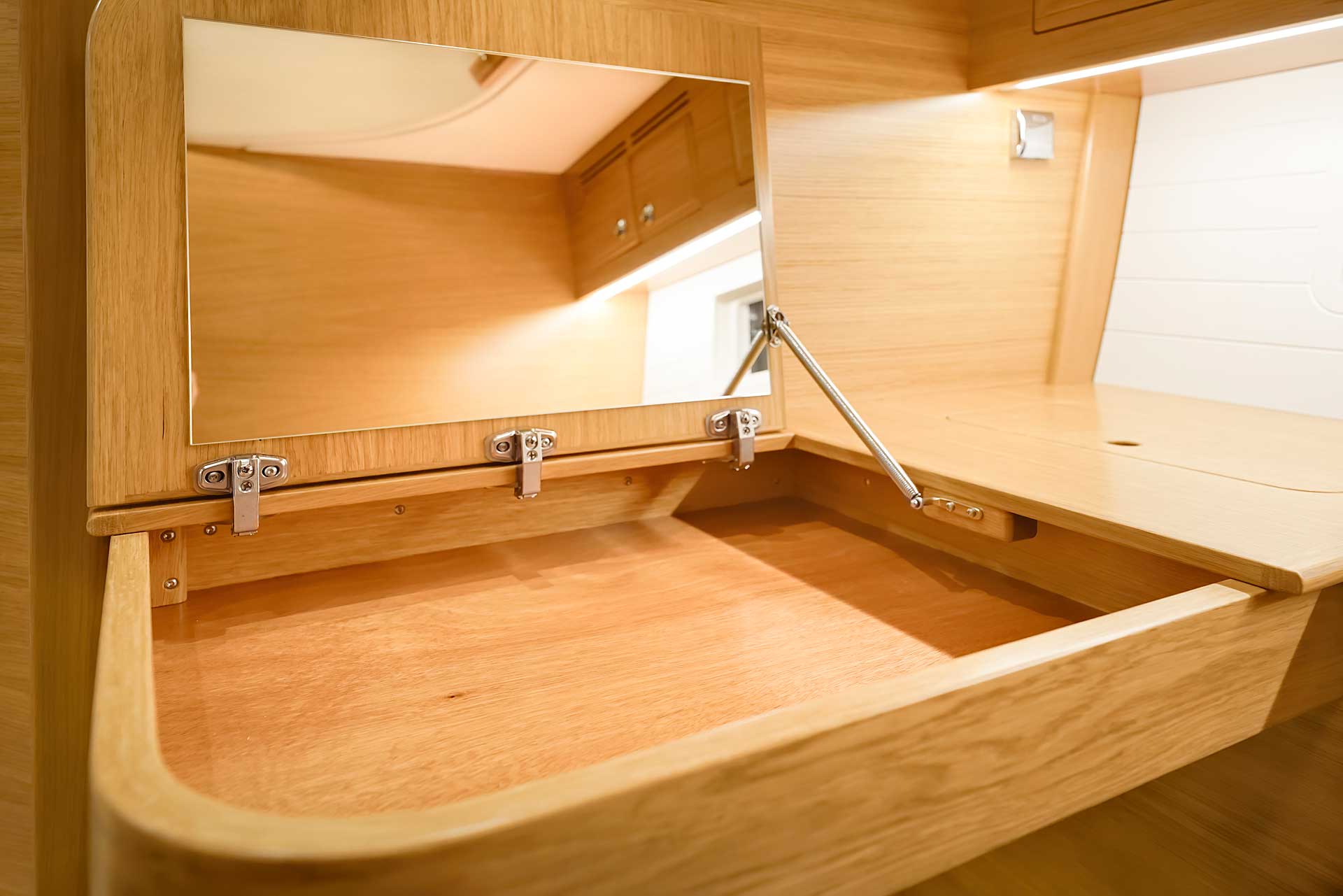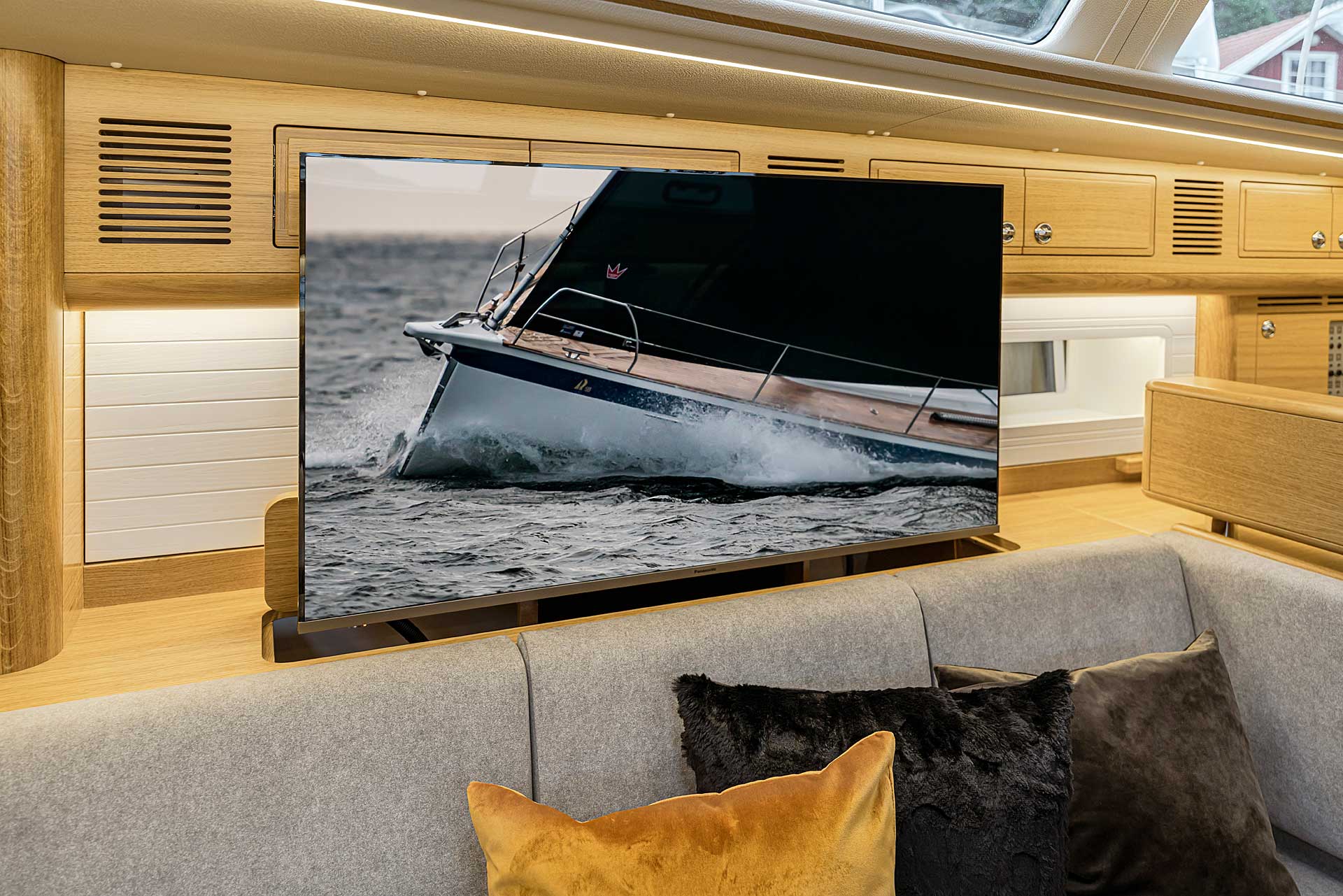 The interior has lots of natural light and indirect led lights as well. There is good ventilation. The layout is generous and roomy, with lots of elbow room. The storage facilities are generous too. The sturdy woodwork has the well renowned Hallberg-Rassy finish.