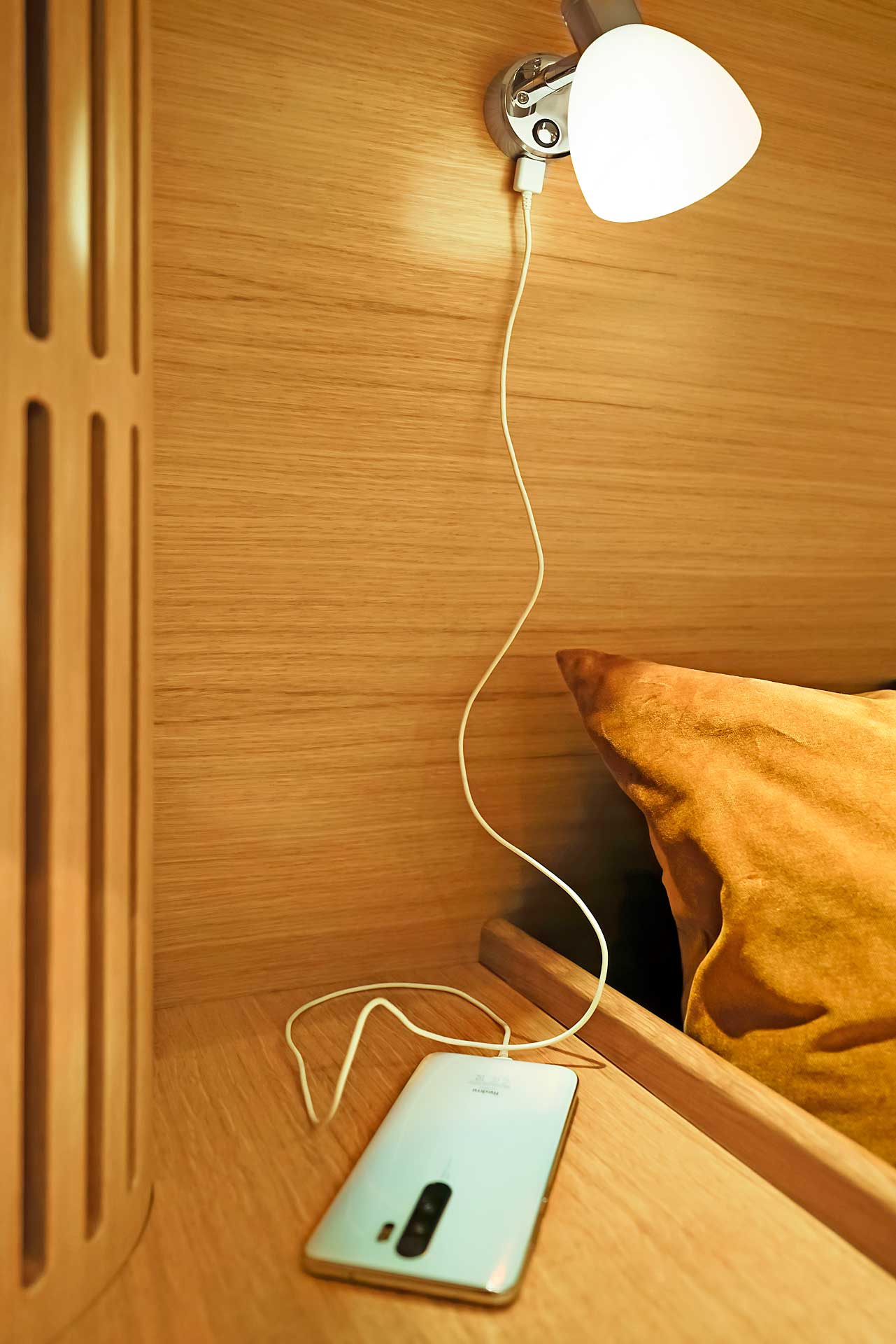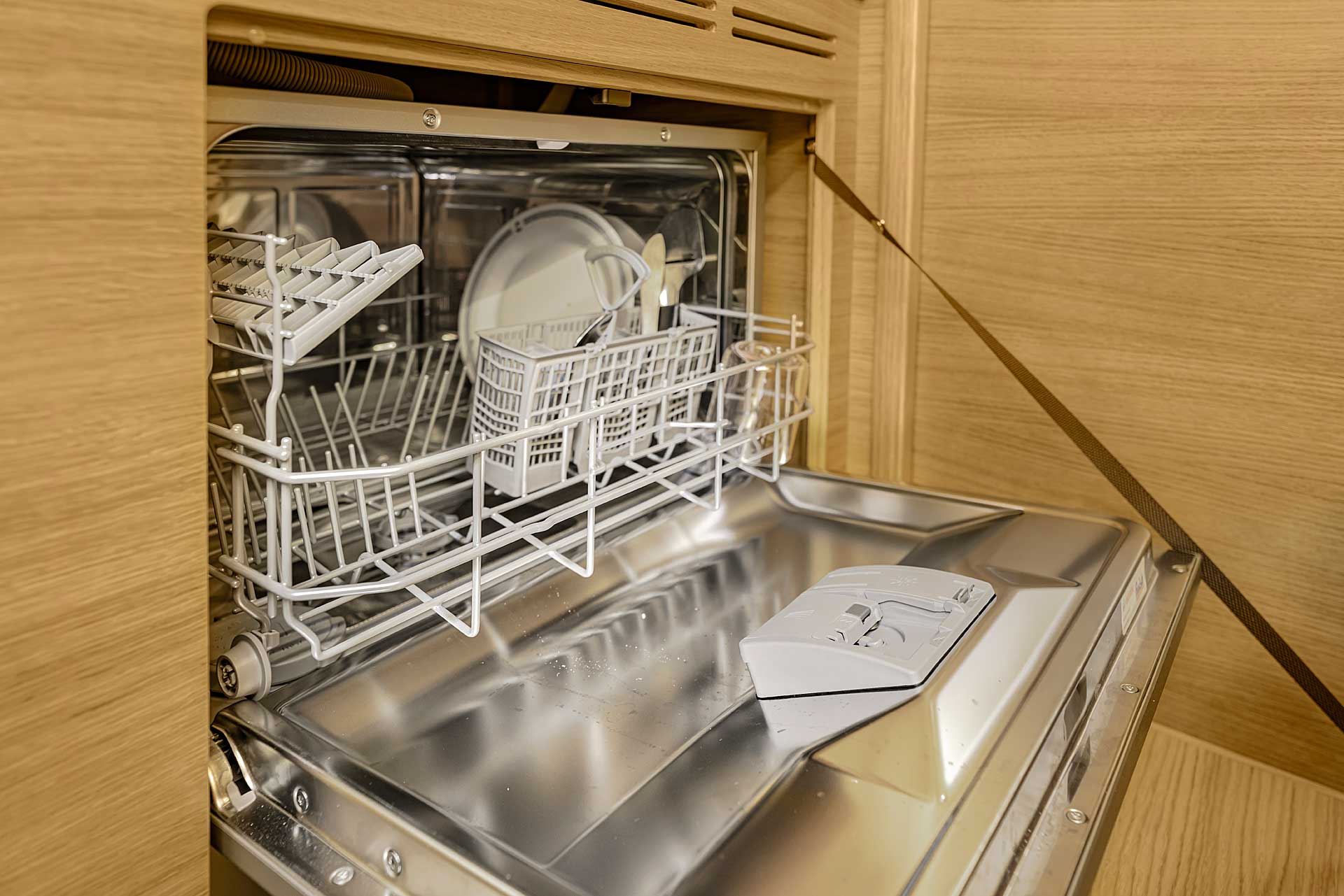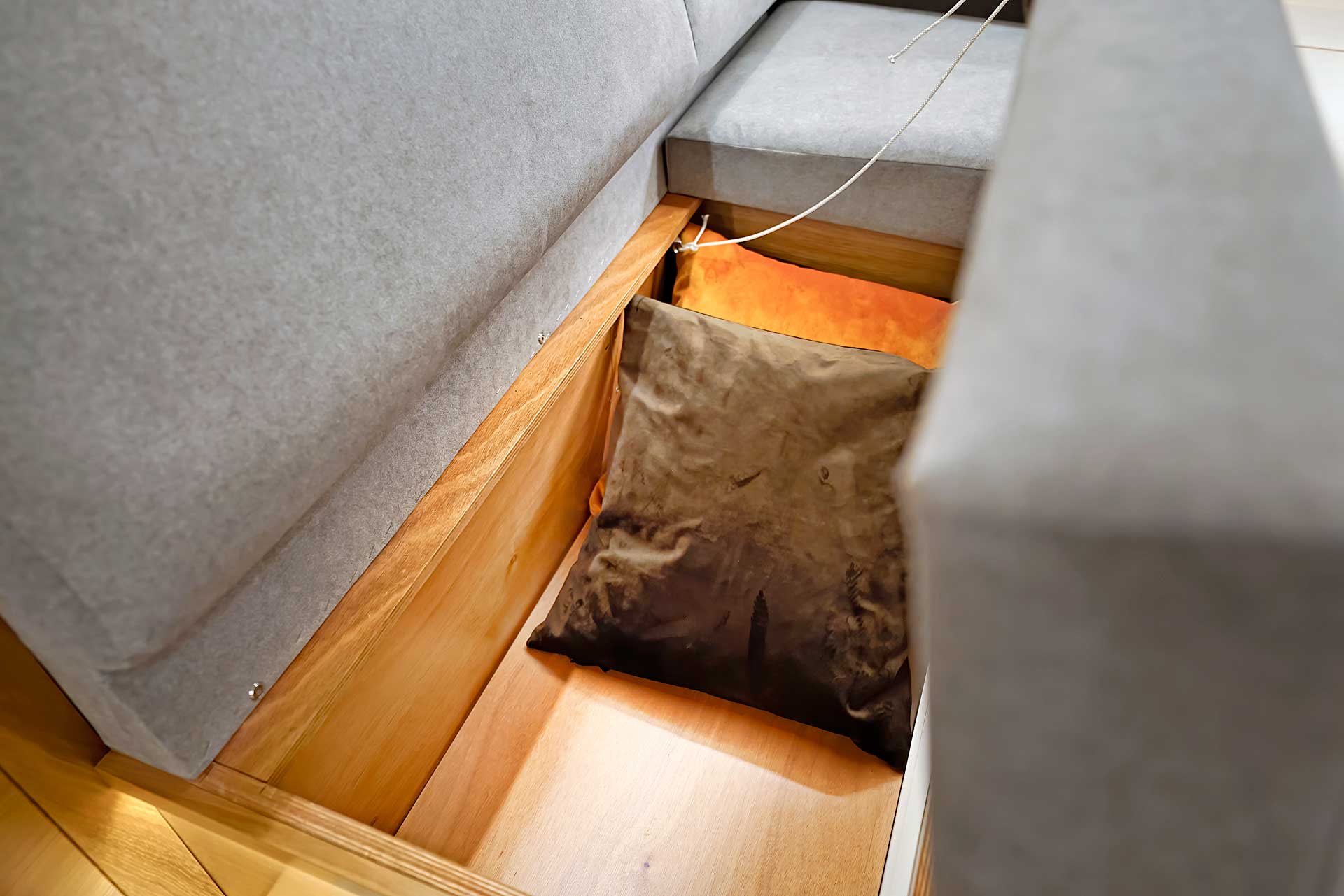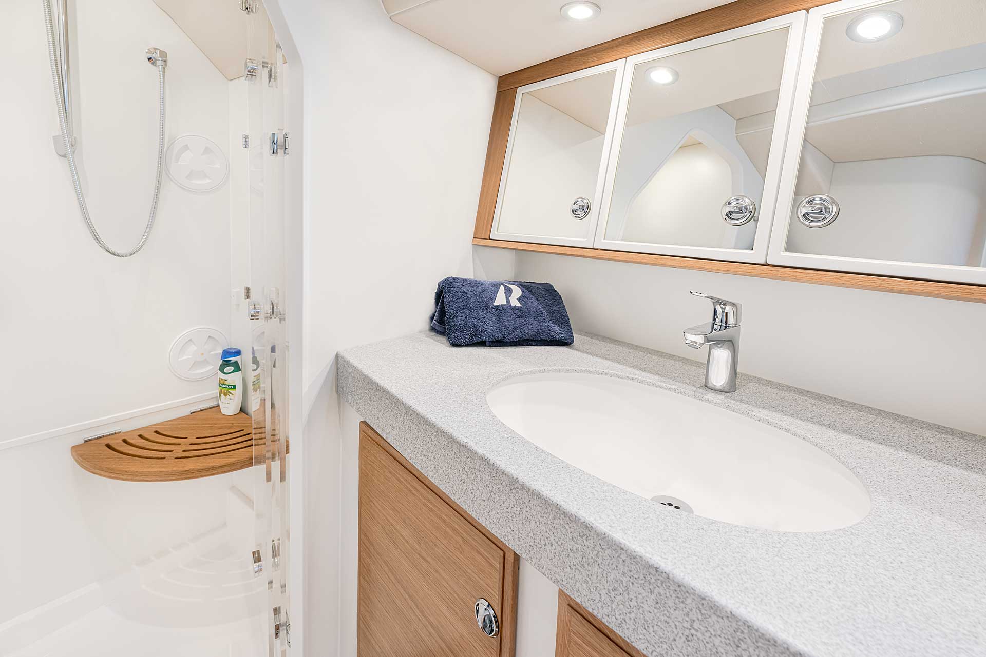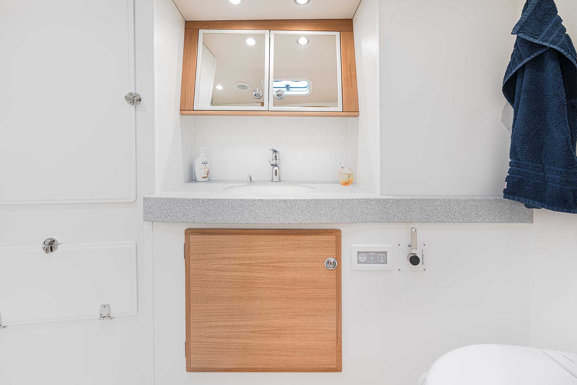 The interior has lots of natural light and indirect led lights as well. There is good ventilation. The layout is generous and roomy, with lots of elbow room. The storage facilities are generous too. The sturdy woodwork has the well renowned Hallberg-Rassy finish.