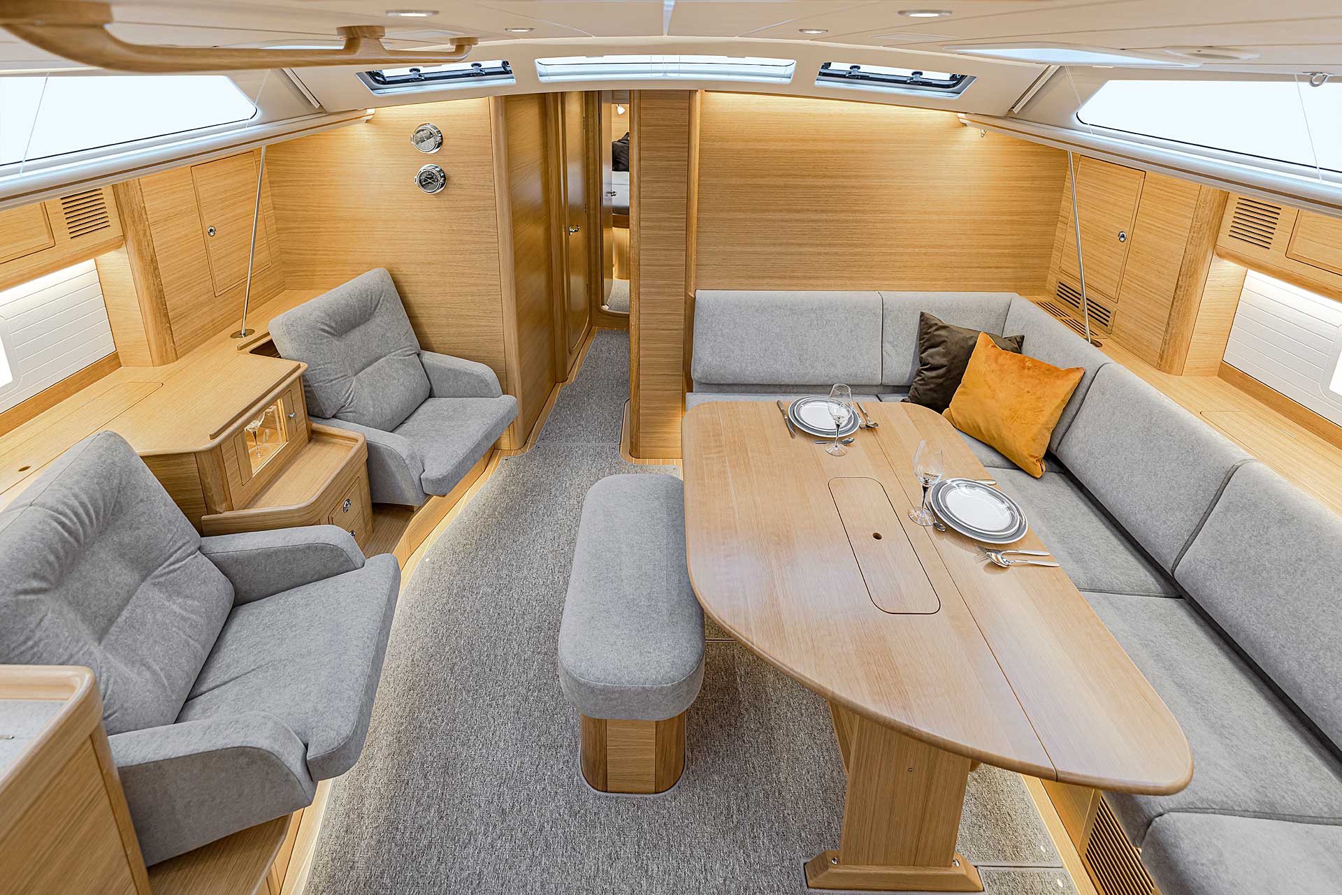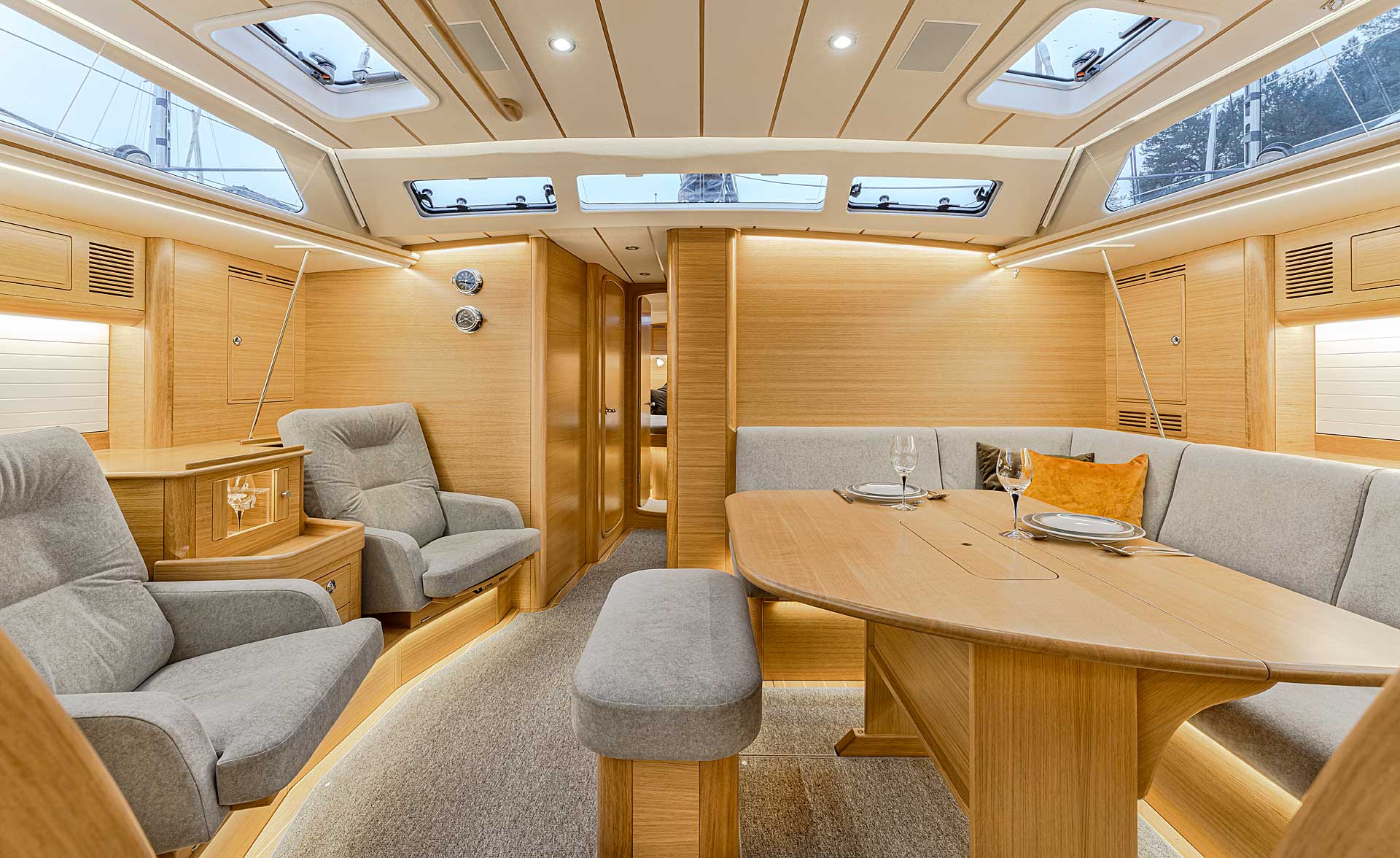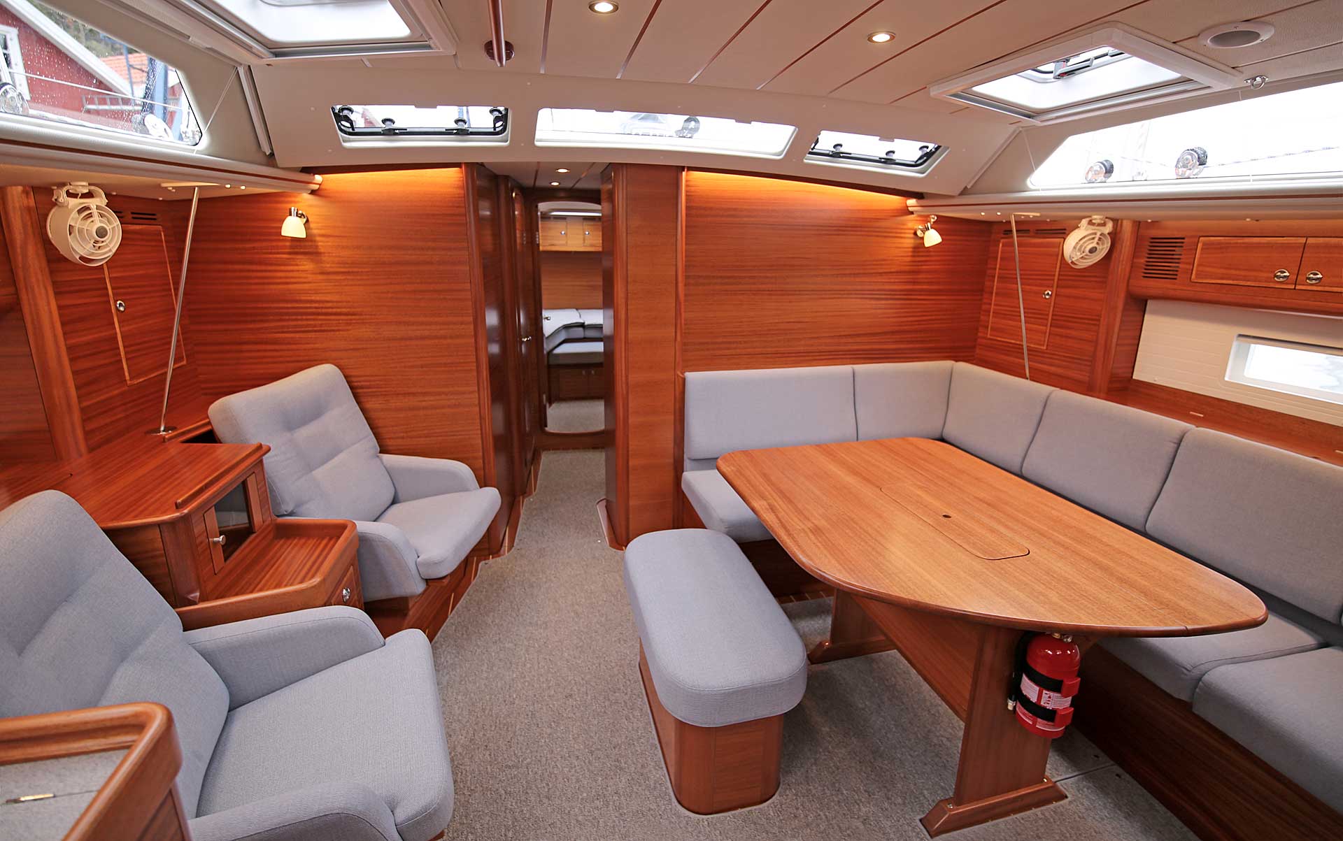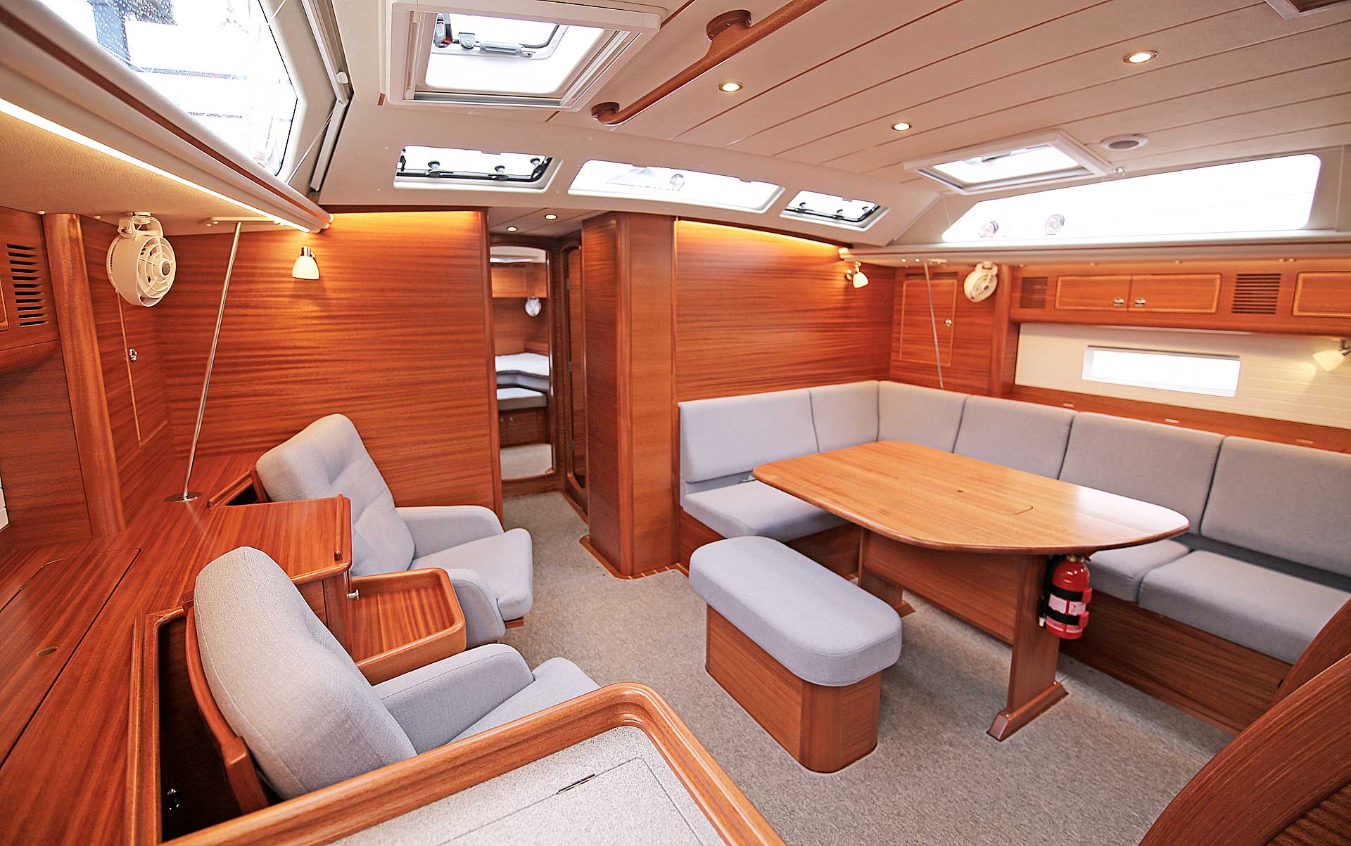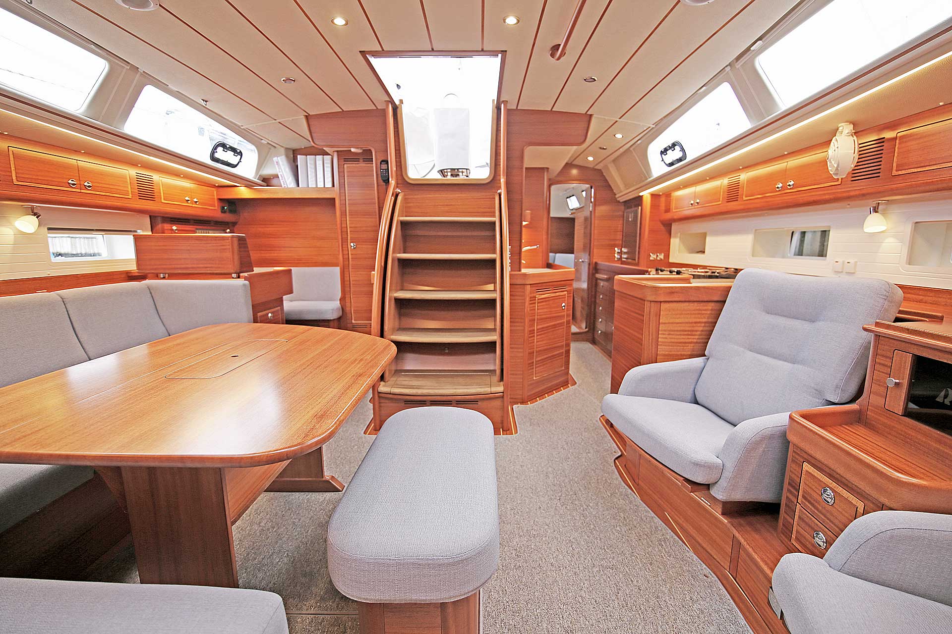 The interior sole is at one level throughout the boat. This gives easy movement both at sea and at anchor or in a marina.