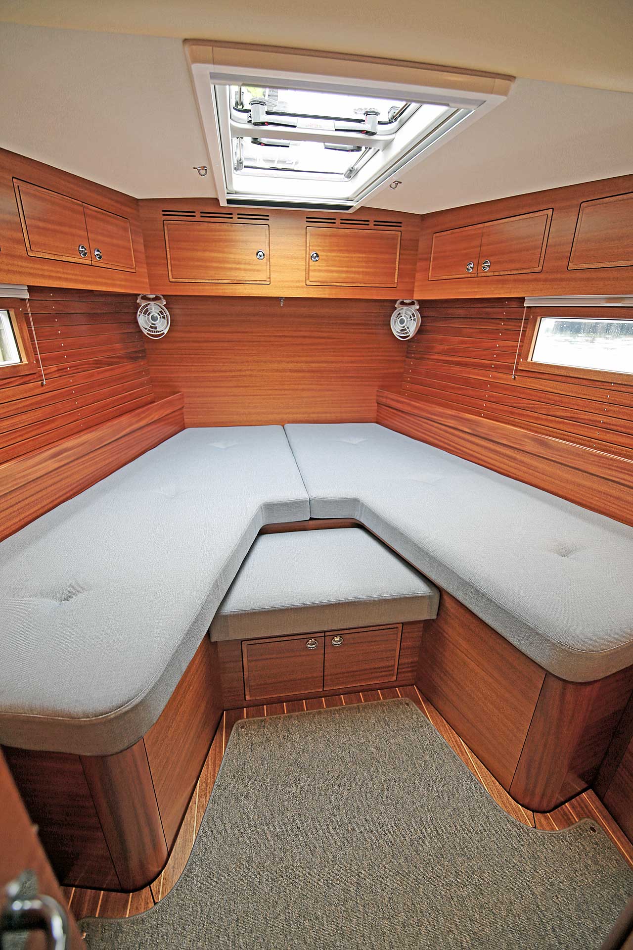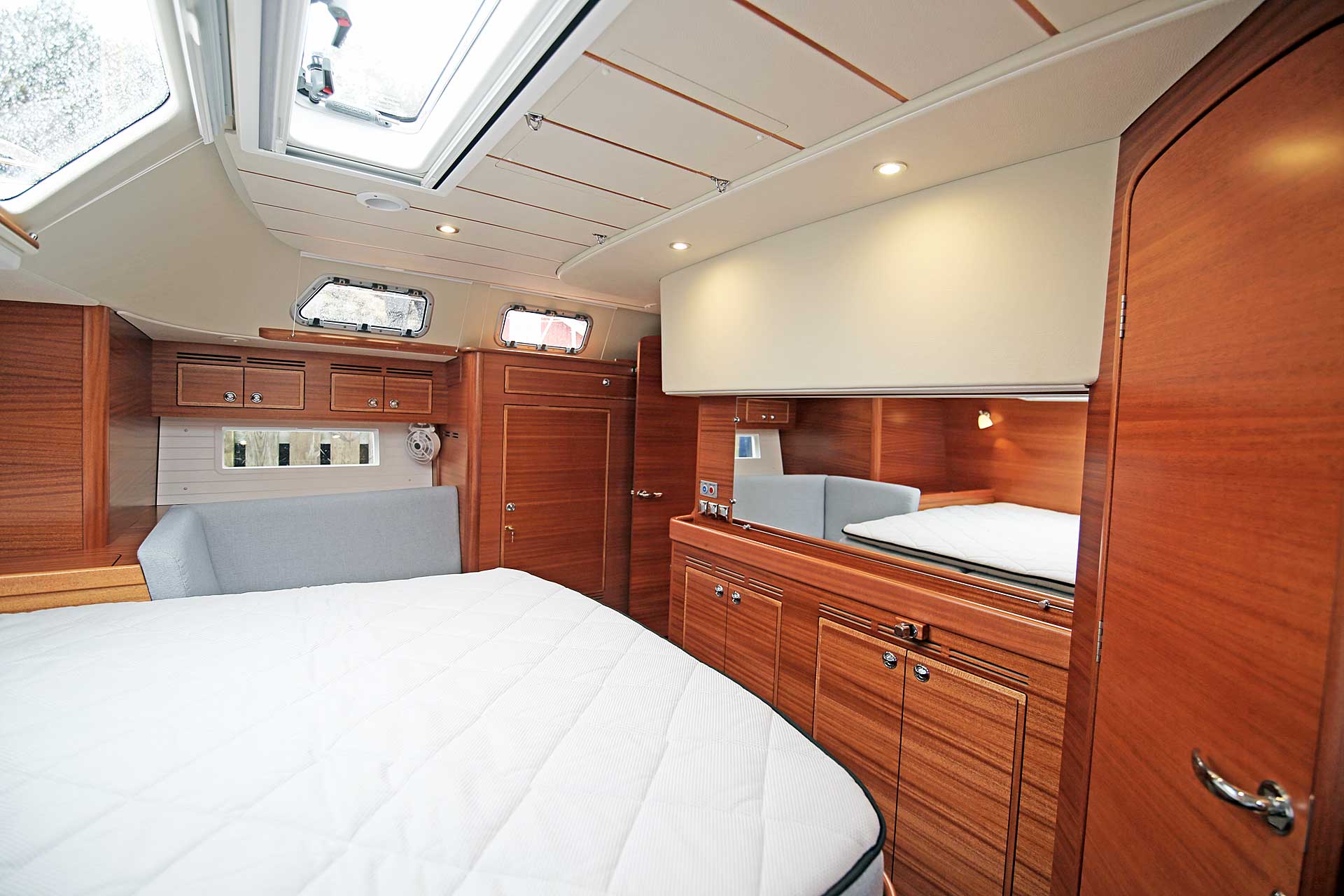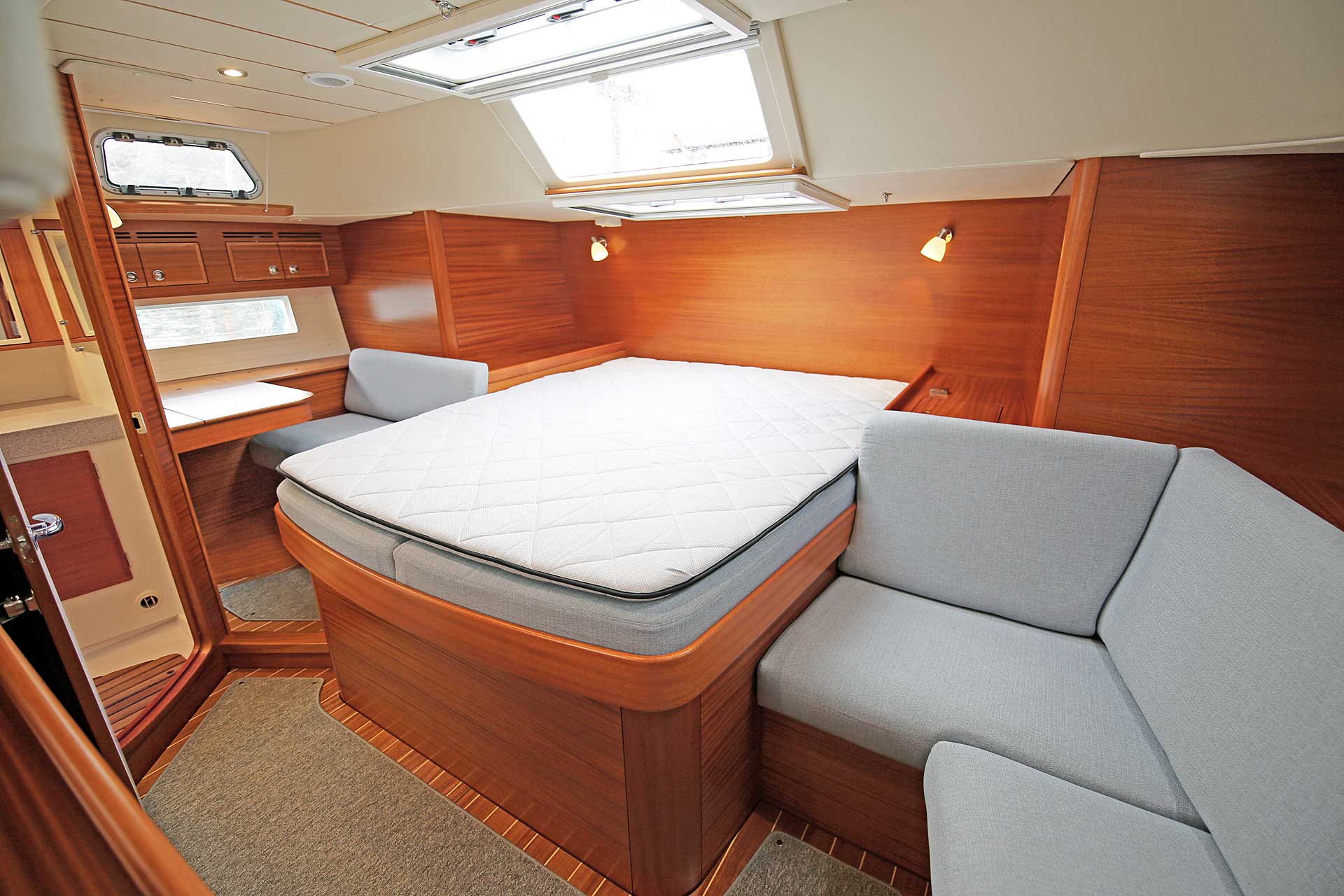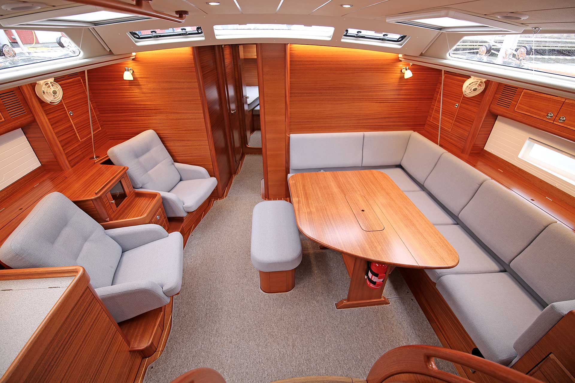 The interior sole is at one level throughout the boat. This gives easy movement both at sea and at anchor or in a marina.