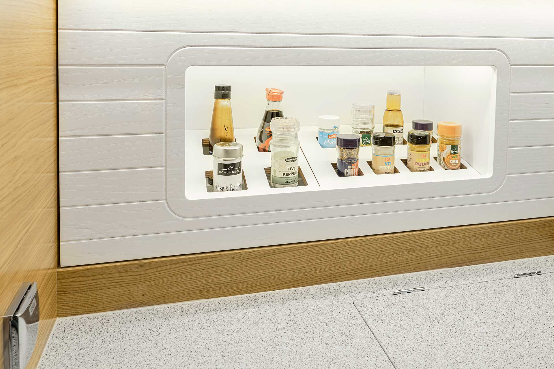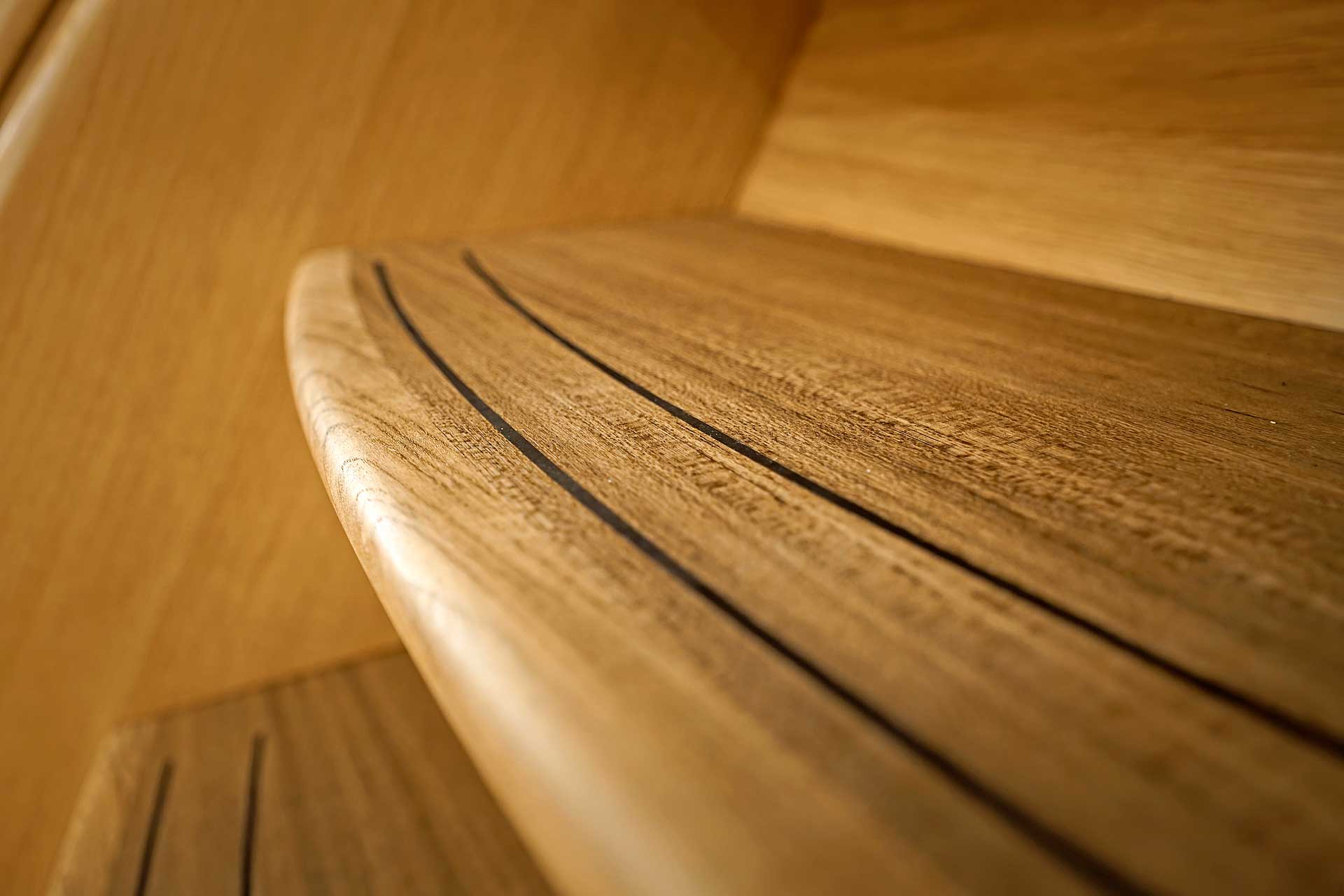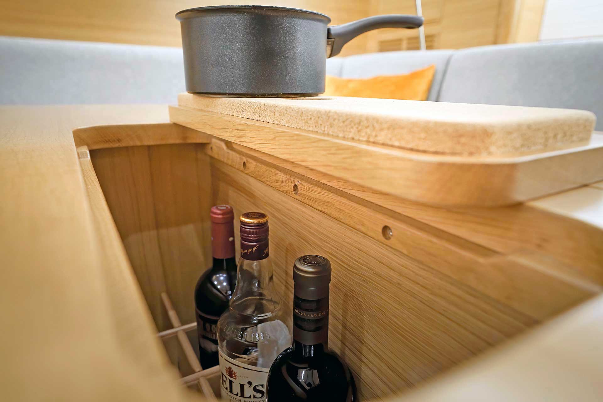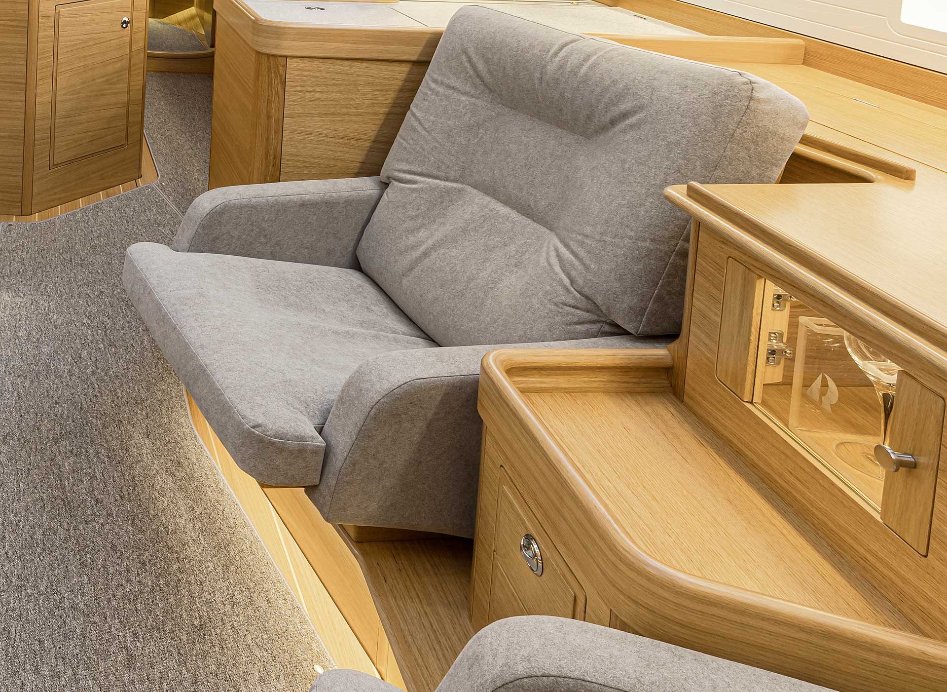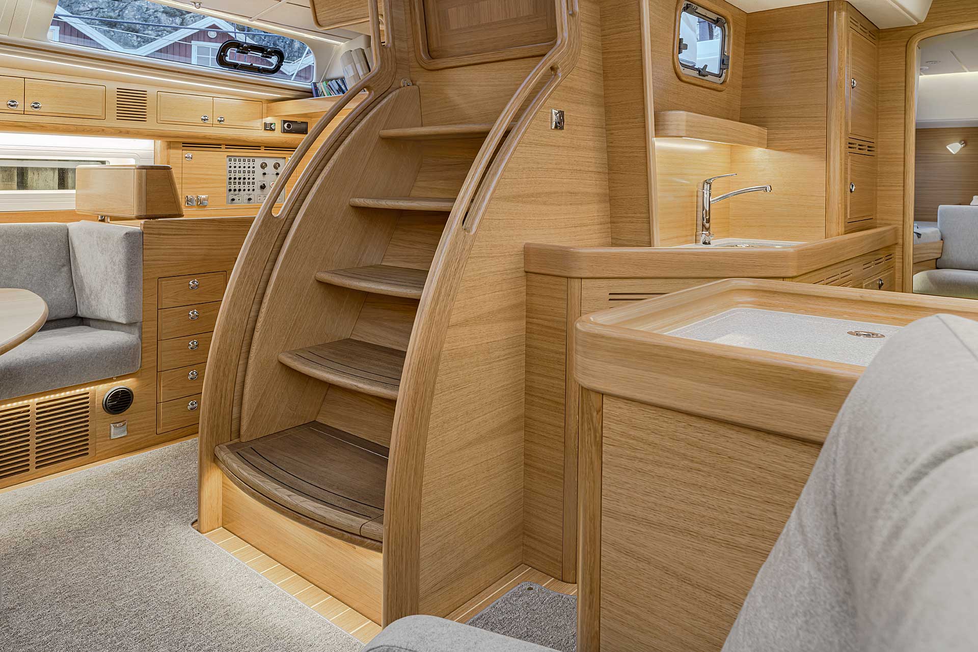 The interior sole is at one level throughout the boat. This gives easy movement both at sea and at anchor or in a marina.