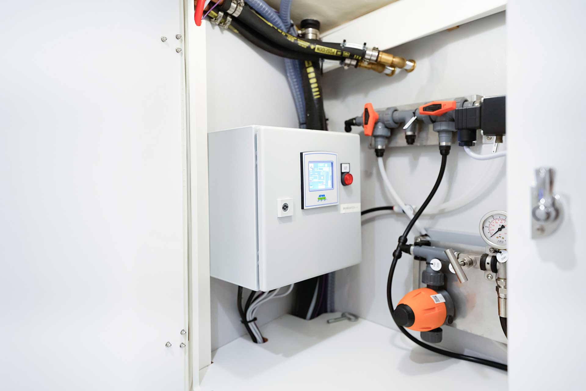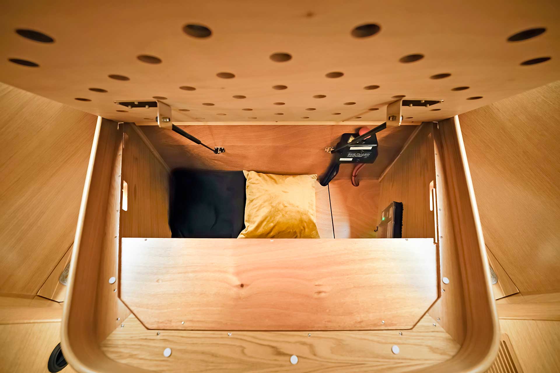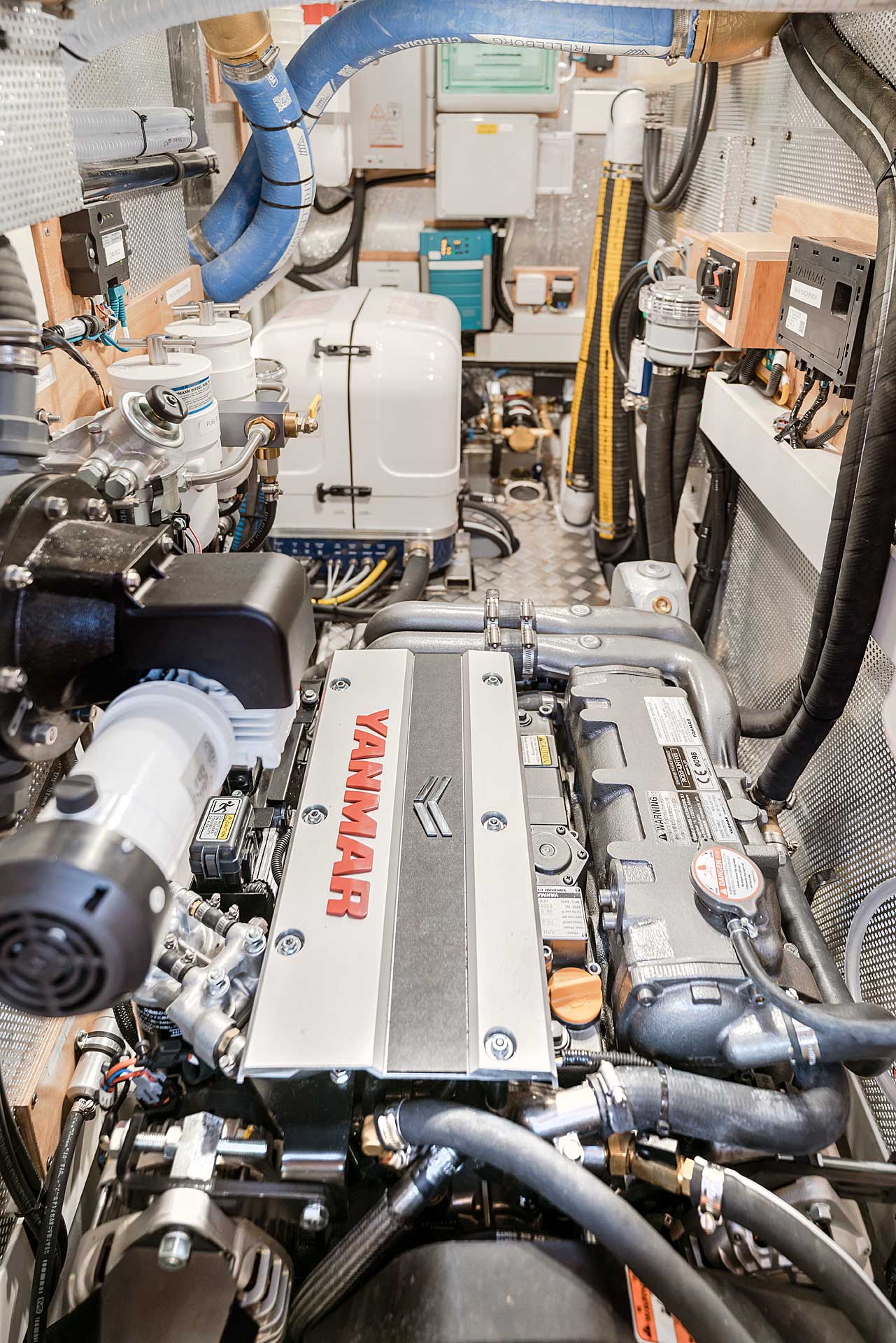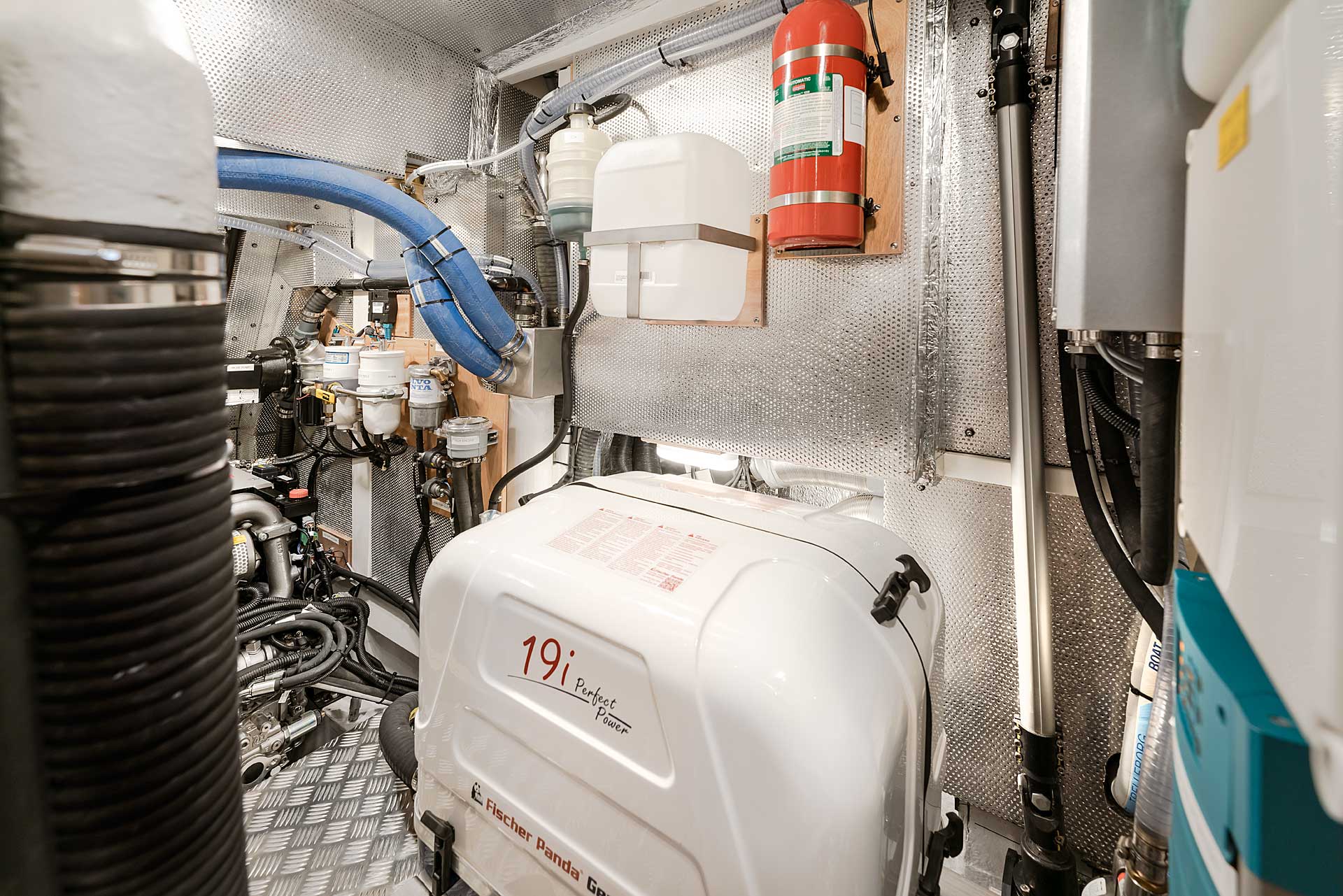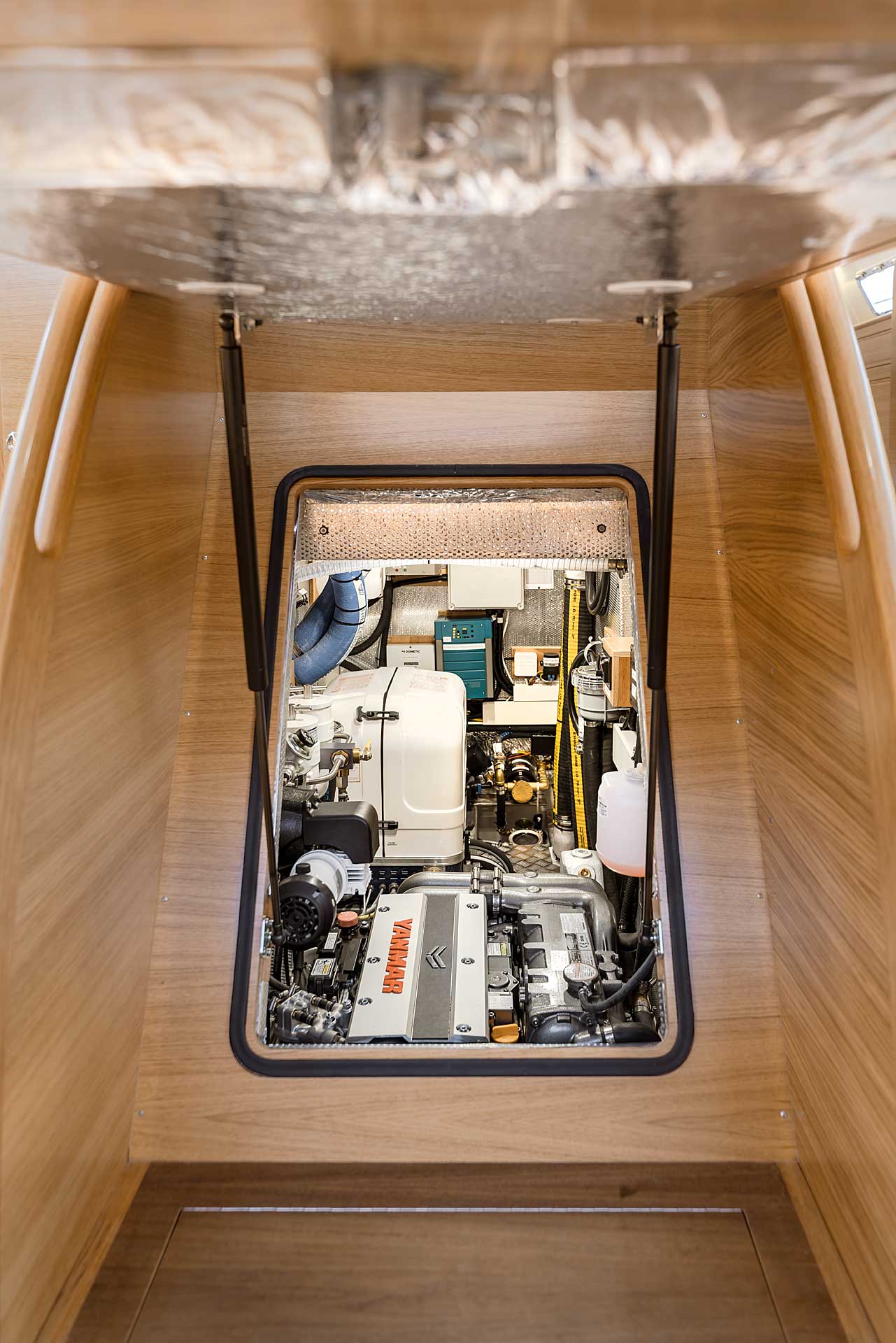There is a large walk-in engine room. Easy access, easy maintenance and careful sound insulation covered by aluminium linings. There is access from a big door on the port side, as well as a lifting stair in front and a removable panel in the aft end of the engine room. Furthermore, the floor in the cockpit is bolted and removable. In the engine room the technical equipment is found: a powerful common rail main engine, the generator with sound shield, pumps, filters, double heaters, AquaDrive flexible coupling to take up the loads from the engine shaft and further lower vibrations and noise. The engine room lighting is 24 v, and there is also a powerful optional 230 v led light. The Mastervolt Combi Pro charger/inverter automatically and quickly changes between shore power and inverter, depending on what is available.